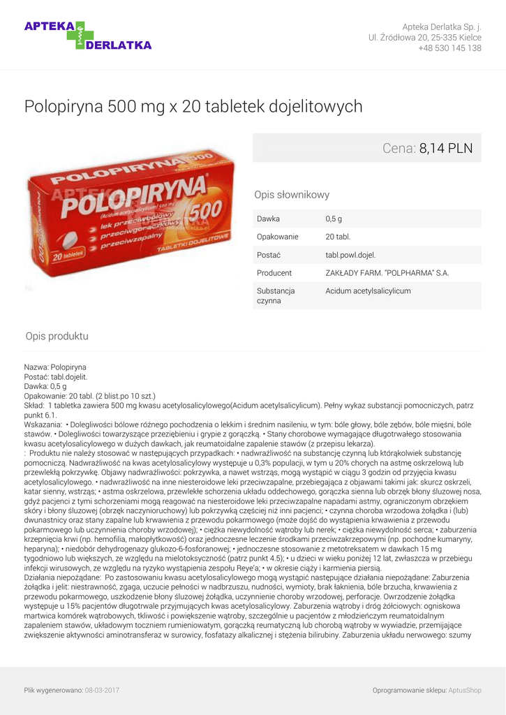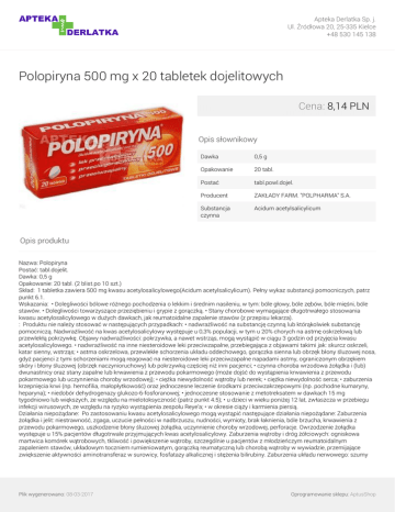Apteka Derlatka Sp. j. Ul. Źródłowa 20, 25-335 Kielce +48 530 145 138 Polopiryna 500 mg x 20 tabletek dojelitowych Cena: 8,14 PLN Opis słownikowy Dawka 0,5 g Opakowanie 20 tabl. Postać tabl.powl.dojel. Producent ZAKŁADY FARM. "POLPHARMA" S.A. Substancja czynna Acidum acetylsalicylicum Opis produktu Nazwa: Polopiryna Postać: tabl.dojelit. Dawka: 0,5 g Opakowanie: 20 tabl. (2 blist.po 10 szt.) Skład: 1 tabletka zawiera 500 mg kwasu acetylosalicylowego(Acidum acetylsalicylicum). Pełny wykaz substancji pomocniczych, patrz punkt 6.1. Wskazania: • Dolegliwości bólowe różnego pochodzenia o lekkim i średnim nasileniu, w tym: bóle głowy, bóle zębów, bóle mięśni, bóle stawów. • Dolegliwości towarzyszące przeziębieniu i grypie z gorączką. • Stany chorobowe wymagające długotrwałego stosowania kwasu acetylosalicylowego w dużych dawkach, jak reumatoidalne zapalenie stawów (z przepisu lekarza). : Produktu nie należy stosować w następujących przypadkach: • nadwrażliwość na substancję czynną lub którąkolwiek substancję pomocniczą. Nadwrażliwość na kwas acetylosalicylowy występuje u 0,3% populacji, w tym u 20% chorych na astmę oskrzelową lub przewlekłą pokrzywkę. Objawy nadwrażliwości: pokrzywka, a nawet wstrząs, mogą wystąpić w ciągu 3 godzin od przyjęcia kwasu acetylosalicylowego. • nadwrażliwość na inne niesteroidowe leki przeciwzapalne, przebiegająca z objawami takimi jak: skurcz oskrzeli, katar sienny, wstrząs; • astma oskrzelowa, przewlekłe schorzenia układu oddechowego, gorączka sienna lub obrzęk błony śluzowej nosa, gdyż pacjenci z tymi schorzeniami mogą reagować na niesteroidowe leki przeciwzapalne napadami astmy, ograniczonym obrzękiem skóry i błony śluzowej (obrzęk naczynioruchowy) lub pokrzywką częściej niż inni pacjenci; • czynna choroba wrzodowa żołądka i (lub) dwunastnicy oraz stany zapalne lub krwawienia z przewodu pokarmowego (może dojść do wystąpienia krwawienia z przewodu pokarmowego lub uczynnienia choroby wrzodowej); • ciężka niewydolność wątroby lub nerek; • ciężka niewydolność serca; • zaburzenia krzepnięcia krwi (np. hemofilia, małopłytkowość) oraz jednoczesne leczenie środkami przeciwzakrzepowymi (np. pochodne kumaryny, heparyna); • niedobór dehydrogenazy glukozo-6-fosforanowej; • jednoczesne stosowanie z metotreksatem w dawkach 15 mg tygodniowo lub większych, ze względu na mielotoksyczność (patrz punkt 4.5); • u dzieci w wieku poniżej 12 lat, zwłaszcza w przebiegu infekcji wirusowych, ze względu na ryzyko wystąpienia zespołu Reye’a; • w okresie ciąży i karmienia piersią. Działania niepożądane: Po zastosowaniu kwasu acetylosalicylowego mogą wystąpić następujące działania niepożądane: Zaburzenia żołądka i jelit: niestrawność, zgaga, uczucie pełności w nadbrzuszu, nudności, wymioty, brak łaknienia, bóle brzucha, krwawienia z przewodu pokarmowego, uszkodzenie błony śluzowej żołądka, uczynnienie choroby wrzodowej, perforacje. Owrzodzenie żołądka występuje u 15% pacjentów długotrwale przyjmujących kwas acetylosalicylowy. Zaburzenia wątroby i dróg żółciowych: ogniskowa martwica komórek wątrobowych, tkliwość i powiększenie wątroby, szczególnie u pacjentów z młodzieńczym reumatoidalnym zapaleniem stawów, układowym toczniem rumieniowatym, gorączką reumatyczną lub chorobą wątroby w wywiadzie, przemijające zwiększenie aktywności aminotransferaz w surowicy, fosfatazy alkalicznej i stężenia bilirubiny. Zaburzenia układu nerwowego: szumy Plik wygenerowano: 08-03-2017 Oprogramowanie sklepu: AptusShop Apteka Derlatka Sp. j. Ul. Źródłowa 20, 25-335 Kielce +48 530 145 138 uszne (zazwyczaj jako objaw przedawkowania), zaburzenia słuchu, zawroty głowy. Zaburzenia nerek i dróg moczowych: białkomocz, obecność leukocytów i erytrocytów w moczu, martwica brodawek nerkowych, śródmiąższowe zapalenie nerek. Zaburzenia serca: niewydolność serca. Zaburzenia naczyniowe: nadciśnienie. Zaburzenia krwi i układu chłonnego: małopłytkowość, niedokrwistość wskutek mikrokrwawień z przewodu pokarmowego, niedokrwistość hemolityczna u pacjentów z niedoborem dehydrogenazy glukozo-6-fosforanowej, leukopenia, agranulocytoza, eozynopenia, zwiększone ryzyko krwawień, wydłużenie czasu krwawienia, wydłużenie czasu protrombinowego. Zaburzenia układu immunologicznego: Reakcje nadwrażliwości: wysypka, pokrzywka, obrzęk naczynioruchowy, skurcz oskrzeli, wstrząs. Interakcje: Inhibitory konwertazy angiotensyny (ACE): Kwas acetylosalicylowy zmniejsza działanie przeciwnadciśnieniowe inhibitorów konwertazy angiotensyny. Acetazolamid: Kwas acetylosalicylowy może w znacznym stopniu zwiększać stężenie, a tym samym toksyczność acetazolamidu. Leki przeciwzakrzepowe (np. heparyna, warfaryna): Jednoczesne stosowanie kwasu acetylosalicylowego i leków przeciwzakrzepowych może spowodować nasilenie działania przeciwzakrzepowego. Kwas acetylosalicylowy może wypierać warfarynę z połączeń białkowych, prowadząc do wydłużenia czasu protrombinowego i czasu krwawienia. Kwas acetylosalicylowy może nasilać działanie przeciwzakrzepowe heparyny, zwiększając tym samym ryzyko krwawienia. Leki przeciwpadaczkowe: Kwas acetylosalicylowy nasila działanie toksyczne kwasu walproinowego, zaś kwas walproinowy nasila działanie antyagregacyjne kwasu acetylosalicylowego. Leki moczopędne: Kwas acetylosalicylowy może zmniejszyć skuteczność leków moczopędnych oraz nasilać ototoksyczność furosemidu. Metotreksat: Kwas acetylosalicylowy nasila toksyczne działanie metotreksatu na szpik kostny. Stosowanie kwasu acetylosalicylowego jednocześnie z metotreksatem w dawkach 15 mg na tydzień lub większych jest przeciwwskazane. Niesteroidowe leki przeciwzapalne: Jednoczesne stosowanie kwasu acetylosalicylowego i niesteroidowych leków przeciwzapalnych nie jest zalecane, ze względu na zwiększ