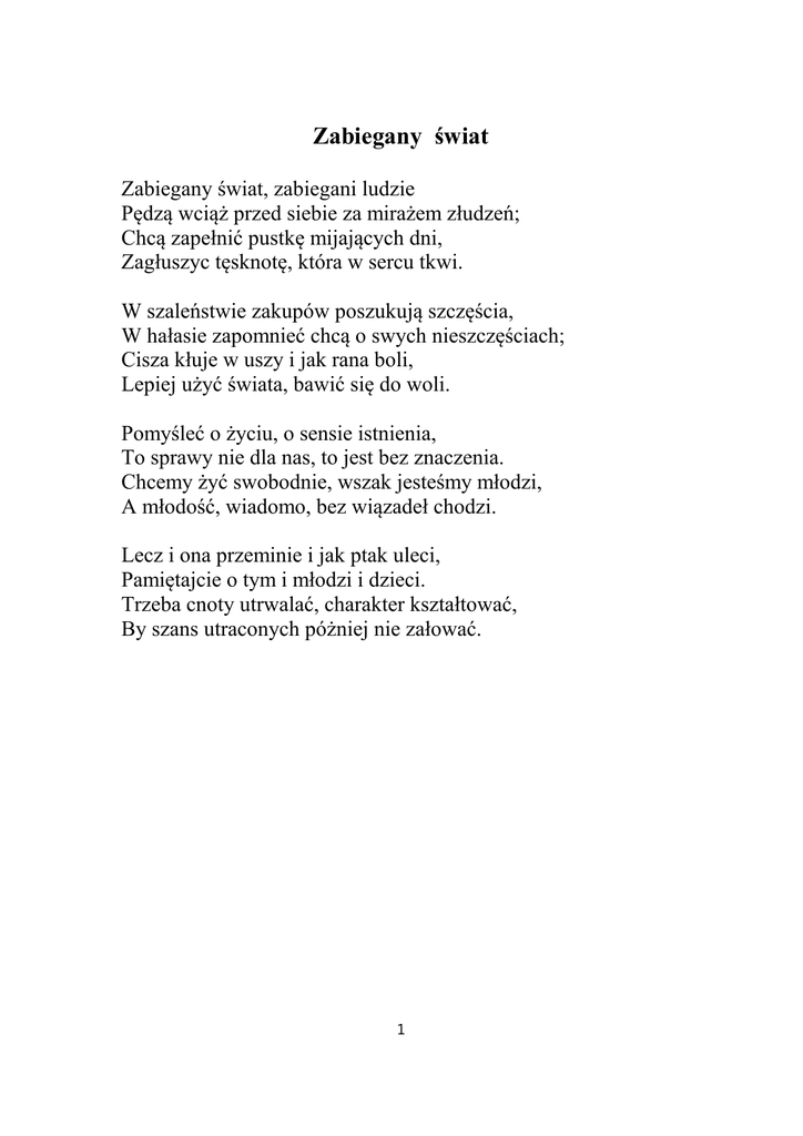 Zabiegany świat Zabiegany świat, zabiegani ludzie Pędzą wciąż przed siebie za mirażem złudzeń; Chcą zapełnić pustkę mijających dni, Zagłuszyc tęsknotę, która w sercu tkwi. W szaleństwie zakupów poszukują szczęścia, W hałasie zapomnieć chcą o swych nieszczęściach; Cisza kłuje w uszy i jak rana boli, Lepiej użyć świata, bawić się do woli. Pomyśleć o życiu, o sensie istnienia, To sprawy nie dla nas, to jest bez znaczenia. Chcemy żyć swobodnie, wszak jesteśmy młodzi, A młodość, wiadomo, bez wiązadeł chodzi. Lecz i ona przeminie i jak ptak uleci, Pamiętajcie o tym i młodzi i dzieci. Trzeba cnoty utrwalać, charakter kształtować, By szans utraconych póżniej nie załować. 1