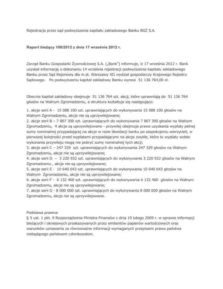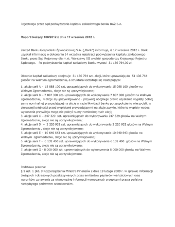 Rejestracja przez sąd podwyższenia kapitału zakładowego Banku BGŻ S.A. Raport bieżący 108/2012 z dnia 17 września 2012 r. Zarząd Banku Gospodarki Żywnościowej S.A. („Bank”) informuje, iż 17 września 2012 r. Bank uzyskał informację o dokonaniu 14 września rejestracji podwyższenia kapitału zakładowego Banku przez Sąd Rejonowy dla m.st. Warszawy XII wydział gospodarczy Krajowego Rejestru Sądowego. Po podwyższeniu kapitał zakładowy Banku wynosi 51 136 764,00 zł. Obecnie kapitał zakładowy obejmuje 51 136 764 szt. akcji, które uprawniają do 51 136 764 głosów na Walnym Zgromadzeniu, a struktura kształtuje się następująco: 1. akcje serii A - 15 088 100 szt. uprawniających do wykonywania 15 088 100 głosów na Walnym Zgromadzeniu, akcje nie są uprzywilejowane; 2. akcje serii B – 7 807 300 szt. uprawniających do wykonywania 7 807 300 głosów na Walnym Zgromadzeniu, 4 akcje są uprzywilejowane - przywilej obejmuje prawo uzyskania wypłaty pełnej sumy nominalnej przypadającej na akcje w razie likwidacji banku po zaspokojeniu wierzycieli, w pierwszej kolejności przed wypłatami przypadającymi na akcje zwykłe, które to wypłaty wobec wykonania przywileju mogą nie pokryć sumy nominalnej tych akcji; 3. akcje serii C – 247 329 szt. uprawniających do wykonywania 247 329 głosów na Walnym Zgromadzeniu, akcje nie są uprzywilejowane; 4. akcje serii D – 3 220 932 szt. uprawniających do wykonywania 3 220 932 głosów na Walnym Zgromadzeniu , akcje nie są uprzywilejowane; 5. akcje serii E - 10 640 643 szt. uprawniających do wykonywania 10 640 643 głosów na Walnym Zgromadzeniu, akcje nie są uprzywilejowane; 6. akcje serii F - 6 132 460 szt. uprawniających do wykonywania 6 132 460 głosów na Walnym Zgromadzeniu, akcje nie są uprzywilejowane; 7. akcje serii G - 8 000 000 szt. uprawniających do wykonywania 8 000 000 głosów na Walnym Zgromadzeniu, akcje nie są uprzywilejowane. Podstawa prawna: § 5 ust. 1 pkt. 9 Rozporządzenia Ministra Finansów z dnia 19 lutego 2009 r. w sprawie informacji bieżących i okresowych przekazywanych przez emitentów papierów wartościowych oraz warunków uznawania za równoważne informacji wymaganych przepisami prawa państwa niebędącego państwem członkowskim.