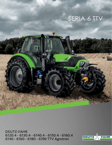 Seria 6 TTV Deutz-Fahr DEUTZ-FAHR 6120.4 -- 6130.4 6130.4--6140.4 6140.4--6150.4 6150.4- -6160.4 6160.4 6160 Agrotron 6140 - 6180 6160 --6190 6180TTV - 6190 TTV Agrotron 02-03 Gama modeli ciągła ewolucja technologii. Seria 6 TTV 6120.4 TTV 6130.4 TTV 6140.4 TTV 6140 TTV 6150.4 TTV 6160.4 TTV 6160 TTV 6180 TTV 6190 TTV SILNIK Moc maks. (ECE R-120) kW/KM Moc maks. z Boost (ECE R-120) kW/KM 86.9/118 94.3/128 99.2/135 99.2/135 109.4/149 115.9/158 115.9/158 129.5/176 134.2/183 106.1/144 106.1/144 112.8/153 122/166 122/166 - 142/193 Nowe modele Serii 6 TTV to ogromny krok na przód w ewolucji ciągników średniej i wysokiej mocy z napędem bezstopniowym. Nowe modele TTV to wyznacznik pod względem technologii. Zostały opracowane przez markę Deutz-Fahr dla uzyskania najlepszych parametrów, komfortu operatora i najniższego zużycia paliwa. Seria 6 TTV to już nie tylko narzędzie pracy ale maszyna, która gwarantuje wydajność, wszechstronność oraz dbałość o środowisko naturalne. Od orki po transport, od prac ogólno-gospodarskich po prace z zestawami maszyn montowanymi z przodu i z tyłu - innowacyjna Seria 6 TTV jest gotowa do każdej pracy. Seria 6 TTV to oferta szeregu modeli z bogatym wyposażeniem standardowym oraz dużą paletą opcji wyposażenia dodatkowego, dzięki którym spełnią oczekiwania najbardziej wymagających rolników. 04-05 Wyposażenie SERIA 6 TTV FUNKCJONALNOŚĆ ORAZ DESIGN. Charakterystyka. Kabina MaxiVision – przestronne miejsce pracy operatora z dużą ergonomią sterowania. Wydajny i wszechstronny napęd bezstopniowy TTV. 4 prędkości WOM z modulowanym startem wałka. Mocny, przyjazny dla środowiska naturalnego 4- lub 6-cylindrowy silnik DEUTZ z systemem SCR z AdBlue Układ hydrauliczny z maksymalnie 7 programowalnymi rozdzielaczami i pompą o wydajności do 160 l/min. Widoczność 360° także w trakcie prac nocnych dzięki 26 reflektorom, także Xenon i LED. Zintegrowany podnośnik przedni oraz WOM z komfortowym sterowaniem. Zintegrowany system nawigacji AGROSKY z dużą precyzją działania. Amortyzacja przedniej osi oraz amortyzacja kabiny dla najwyższego komfortu. PO PROSTU WYJĄTKOWY. Nowe modele Serii 6 TTV łączą z sukcesem najwyższą wydajność oraz wyjątkowy design. Nowe modele to nowoczesne linie kabiny, maski i błotników, zaawansowana technologia i pełne bezpieczeństwo użytkowania. Podłokietnik MaxCom z przyciskami sterowania - wszystko w zasięgi ręku operatora. iMonitor 2.0 komfortowe sterowanie wszystkimi parametrami roboczymi. Podnośnik o udźwigu 9,2 tony – obsługa wszystkich rodzajów maszyn. 06-07 Agrotron Agrotron... nazwa zobowiązuje Ponad 60000 ciągników Agrotron wyprodukowanych przez markę DEUTZ-FAHR sprawia, że jest to jeden z największych niemieckich producentów ciągników na świecie. Są to ciągniki łączące wyjątkową wydajność z uniwersalnością potwierdzoną 100 milionami godzin pracy. DEUTZ-FAHR to pionier w konstruowaniu ciągników z napędem bezstopniowym. Nowa Seria 6 TTV uosabia wszystkie najlepsze cechy tego rodzaju maszyn. Będziesz mile zaskoczony... Nowa Seria 6 TTV została opracowana i wyprodukowana w fabryce w Lauingen w Niemczech. Nowoczesna linia produkcyjna gwarantuje najwyższą jakość wykonania oraz dużą dbałość o każdy z detali nowej Serii 6 TTV. Opracowane z rolnikami. Prace projektowe nad nowymi modelami Serii 6 TTV prowadzono we współpracy z użytkownikami ciągników, którzy brali czynny udział w tworzeniu ciągników na każdym z etapów prac. Zespoły złożone ze specjalistów z branży pracowały nad stworzeniem najlepszych rozwiązań pod względem wydajności, komfortu, designu i niskich kosztów eksploatacji. Badania i rozwój. DEUTZ-FAHR korzysta z jednego z najlepszych centrów badawczo-rozwojowych maszyn branży rolniczej na świecie. Centrum testowe określa wytrzymałość i funkcjonalność każdego z komponentów w testach badawczych. 08-09 MaxiVision MaxiVision, perfekcja w każdym calu. Komfort i wygoda. Monolityczna szyba przednia, wąskie słupki oraz duże, szeroko otwierane drzwi sprawiają, że kabina MaxiVision oferuje 360° widoczności. Wpływa to nie tylko na wysoki poziom bezpieczeństwa, ale także na wydajność pracy ułatwiając jej wykonywanie. Wszystko na swoim miejscu. Nowa kabina MaxiVision to duża przestrzeń oraz szereg schowków na rzeczy przechowywane przez operatora. Uchwyty na kubki, schowki na dokumenty oraz zamykany v schowek na butelki z napojami, pozwalają na wielogodzinne wykonywanie prac z najwyższym poziomem komfortu i wygody operatora. Praca zespołowa. Opracowanie rozwiązań zastosowanych w nowej kabinie MaxiVision wzięło swoje początki w rozmowach z rolnikami, usługodawcami, operatorami ciągników. Na podstawie zebranych opinii i propozycji stworzono wyjątkowo komfortowe stanowisko pracy. Każdy z operatorów odnajdzie w kabinie MaxiVision szereg innowacyjnych rozwiązań ułatwiających korzystanie z ciągnika. Każdy z detali dopracowano pod względem ergonomii: na słupku środkowym umieszczono uchwyt na telefon, fotel pasażera zintegrowano z miękkim siedziskiem oraz schowkami, otwierany, szklany szyber-dach z zamykaną osłoną przeciwsłoneczną zapewnia komfort prac w różnych warunkach. Inżynierowie marki DEUTZ-FAHR wykorzystali w konstrukcji kabiny MaxiVision nowoczesne, wytrzymałe materiały, wysokiej jakości materiały zwiększają komfort operatora. Kabina MaxiVision w modelach Serii 6 TTV wyznacza standardy w swojej klasie. 10-11 MAXCOM ERGONOMIA. Już na etapie projektowania przyrządów sterowniczych przyjęto założenie o zapewnieniu najwyższej ergonomii stanowiska operatora. Wszystkie przyciski i dźwignie umieszczono w zasięgu ręki operatora. Oznaczenia kolorystyczne ułatwiają ich identyfikacje i użycie. Prace nocne nie stanowią żadnego problemu, podłokietnik oferuje podświetlenie przycisków i dźwigni sterowania. Włączenie określonej funkcji powoduje zmian