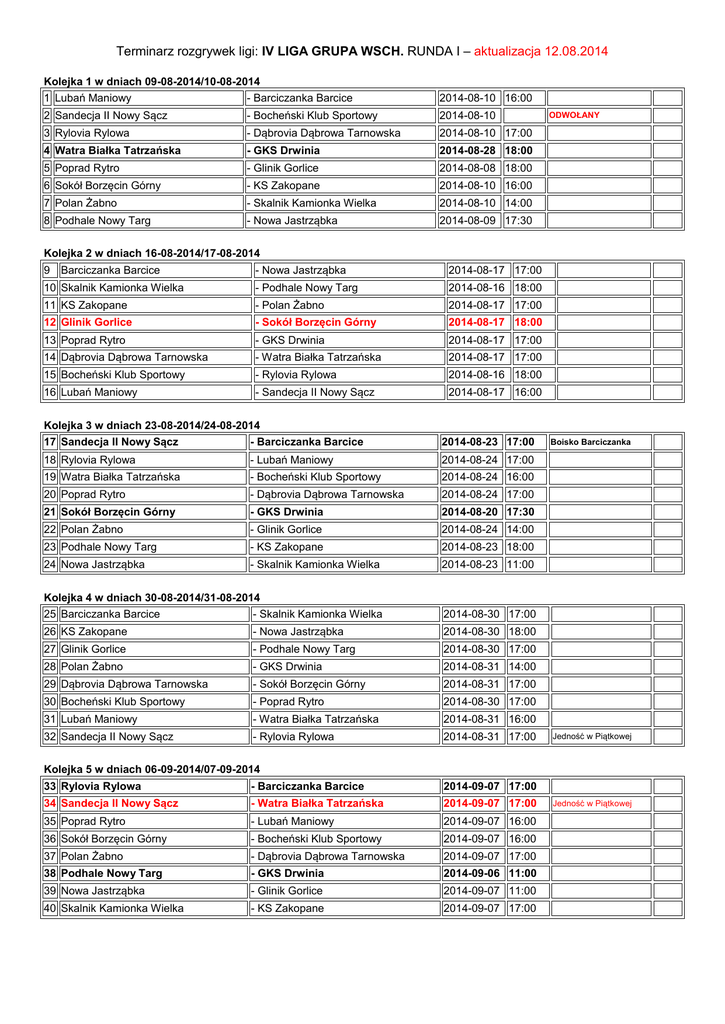 Terminarz rozgrywek ligi: IV LIGA GRUPA WSCH. RUNDA I – aktualizacja 12.08.2014 Kolejka 1 w dniach 09-08-2014/10-08-2014 1 Lubań Maniowy - Barciczanka Barcice 2014-08-10 16:00 2 Sandecja II Nowy Sącz - Bocheński Klub Sportowy 2014-08-10 3 Rylovia Rylowa - Dąbrovia Dąbrowa Tarnowska 2014-08-10 17:00 4 Watra Białka Tatrzańska - GKS Drwinia 2014-08-28 18:00 5 Poprad Rytro - Glinik Gorlice 2014-08-08 18:00 6 Sokół Borzęcin Górny - KS Zakopane 2014-08-10 16:00 7 Polan Żabno - Skalnik Kamionka Wielka 2014-08-10 14:00 8 Podhale Nowy Targ - Nowa Jastrząbka 2014-08-09 17:30 ODWOŁANY Kolejka 2 w dniach 16-08-2014/17-08-2014 9 - Nowa Jastrząbka 2014-08-17 17:00 10 Skalnik Kamionka Wielka Barciczanka Barcice - Podhale Nowy Targ 2014-08-16 18:00 11 KS Zakopane - Polan Żabno 2014-08-17 17:00 12 Glinik Gorlice - Sokół Borzęcin Górny 2014-08-17 18:00 13 Poprad Rytro - GKS Drwinia 2014-08-17 17:00 14 Dąbrovia Dąbrowa Tarnowska - Watra Białka Tatrzańska 2014-08-17 17:00 15 Bocheński Klub Sportowy - Rylovia Rylowa 2014-08-16 18:00 16 Lubań Maniowy - Sandecja II Nowy Sącz 2014-08-17 16:00 Kolejka 3 w dniach 23-08-2014/24-08-2014 17 Sandecja II Nowy Sącz - Barciczanka Barcice 2014-08-23 17:00 18 Rylovia Rylowa - Lubań Maniowy 2014-08-24 17:00 19 Watra Białka Tatrzańska - Bocheński Klub Sportowy 2014-08-24 16:00 20 Poprad Rytro - Dąbrovia Dąbrowa Tarnowska 2014-08-24 17:00 21 Sokół Borzęcin Górny - GKS Drwinia 2014-08-20 17:30 22 Polan Żabno - Glinik Gorlice 2014-08-24 14:00 23 Podhale Nowy Targ - KS Zakopane 2014-08-23 18:00 24 Nowa Jastrząbka - Skalnik Kamionka Wielka 2014-08-23 11:00 Boisko Barciczanka Kolejka 4 w dniach 30-08-2014/31-08-2014 25 Barciczanka Barcice - Skalnik Kamionka Wielka 2014-08-30 17:00 26 KS Zakopane - Nowa Jastrząbka 2014-08-30 18:00 27 Glinik Gorlice - Podhale Nowy Targ 2014-08-30 17:00 28 Polan Żabno - GKS Drwinia 2014-08-31 14:00 29 Dąbrovia Dąbrowa Tarnowska - Sokół Borzęcin Górny 2014-08-31 17:00 30 Bocheński Klub Sportowy - Poprad Rytro 2014-08-30 17:00 31 Lubań Maniowy - Watra Białka Tatrzańska 2014-08-31 16:00 32 Sandecja II Nowy Sącz - Rylovia Rylowa 2014-08-31 17:00 Jedność w Piątkowej Kolejka 5 w dniach 06-09-2014/07-09-2014 33 Rylovia Rylowa - Barciczanka Barcice 2014-09-07 17:00 34 Sandecja II Nowy Sącz - Watra Białka Tatrzańska 2014-09-07 17:00 35 Poprad Rytro - Lubań Maniowy 2014-09-07 16:00 36 Sokół Borzęcin Górny - Bocheński Klub Sportowy 2014-09-07 16:00 37 Polan Żabno - Dąbrovia Dąbrowa Tarnowska 2014-09-07 17:00 38 Podhale Nowy Targ - GKS Drwinia 2014-09-06 11:00 39 Nowa Jastrząbka - Glinik Gorlice 2014-09-07 11:00 40 Skalnik Kamionka Wielka - KS Zakopane 2014-09-07 17:00 Jedność w Piątkowej Kolejka 6 w dniach 14-08-2014 41 Barciczanka Barcice - KS Zakopane 2014-08-14 17:00 42 Glinik Gorlice - Skalnik Kamionka Wielka 2014-08-14 16:00 43 Nowa Jastrząbka - GKS Drwinia 2014-08-14 18:00 44 Dąbrovia Dąbrowa Tarnowska - Podhale Nowy Targ 2014-08-13 17:30 45 Bocheński Klub Sportowy - Polan Żabno 2014-08-14 16:00 46 Lubań Maniowy - Sokół Borzęcin Górny 2014-08-14 17:00 47 Sandecja II Nowy Sącz - Poprad Rytro 2014-08-14 18:00 48 Rylovia Rylowa - Watra Białka Tatrzańska 2014-08-14 16:00 Jedność w Piątkowej Kolejka 7 w dniach 13-09-2014/14-09-2014 49 Watra Białka Tatrzańska - Barciczanka Barcice 2014-09-14 16:00 50 Poprad Rytro - Rylovia Rylowa 2014-09-14 17:00 51 Sokół Borzęcin Górny - Sandecja II Nowy Sącz 2014-09-14 16:00 52 Polan Żabno - Lubań Maniowy 2014-09-13 16:30 53 Podhale Nowy Targ - Bocheński Klub Sportowy 2014-09-13 17:00 54 Nowa Jastrząbka - Dąbrovia Dąbrowa Tarnowska 2014-09-13 17:00 55 Skalnik Kamionka Wielka - GKS Drwinia 2014-09-14 17:00 56 KS Zakopane - Glinik Gorlice 2014-09-14 17:00 Kolejka 8 w dniach 20-09-2014/21-09-2014 57 Barciczanka Barcice - Glinik Gorlice 2014-09-21 16:00 58 GKS Drwinia - KS Zakopane 2014-09-21 16:00 59 Dąbrovia Dąbrowa Tarnowska - Skalnik Kamionka Wielka 2014-09-21 16:00 60 Bocheński Klub Sportowy - Nowa Jastrząbka 2014-09-20 17:00 61 Lubań Maniowy - Podhale Nowy Targ 2014-09-21 16:00 62 Sandecja II Nowy Sącz - Polan Żabno 2014-09-21 11:00 63 Rylovia Rylowa - Sokół Borzęcin Górny 2014-09-20 16:00 64 Watra Białka Tatrzańska - Poprad Rytro 2014-09-21 16:00 Jedność w Piątkowej Kolejka 9 w dniach 27-09-2014/28-09-2014 65 Poprad Rytro - Barciczanka Barcice 2014-09-28 16:00 66 Sokół Borzęcin Górny - Watra Białka Tatrzańska 2014-09-28 16:00 67 Polan Żabno - Rylovia Rylowa 2014-09-28 16:00 68 Podhale Nowy Targ - Sandecja II Nowy Sącz 2014-09-27 16:00 69 Nowa Jastrząbka - Lubań Maniowy 2014-09-28 15:00 70 Skalnik Kamionka Wielka - Bocheński Klub Sportowy 2014-09-27 16:00 71 KS Zakopane - Dąbrovia Dąbrowa Tarnowska 2014-09-28 16:00 72 Glinik Gorlice - GKS Drwinia 2014-09-27 15:00 Kolejka 10 w dniach 04-10-2014/05-10-2014 73 Barciczanka Barcice - GKS Drwinia 2014-10-05 15:30 74 Dąbrovia Dąbrowa Tarnowska - Glinik Gorlice 2014-10-05 16:00 75 Bocheński Klub Sportowy - KS Zakopane 2014-10-04 16:00 76 Lubań Maniowy - Skalnik Kamionka Wielka 2014-10-05 15:00 77 Sandecja II Nowy Sącz - Nowa Jastrząbka 2014-10-05 11:00 78 Rylovia Rylowa - Podhale Nowy Targ 2014-10-05 14:00 79 Watra Białka Tatrzańska - Polan Żabno 2014-10-05 15:00 80 Poprad Rytro - Sokół Borzęcin Górny 2014-10-05 15:00 Jedność w Piątkowej Kolejka 11 w dniach 11-10-2014/12-10-2014 81 Sokół Borzęcin Górny - Barciczanka Barcice 2014-10-12 15:00 82 Polan Żabno - Poprad Rytro 2014-10-12 15:00 83 Podhale Nowy Targ - Watra Białka Tatrzańska 2014-10-11 15:00 84 Nowa Jastrząbka - Rylovia Rylowa 2014-10-12 11:00 85 Skalnik Kamionka Wielka - Sandecja II Nowy Sącz 2014-10-11 15:00 86 KS Zakopane - Lubań Maniowy 2014-10-12 15:30 87 Glinik Gorlice - Bocheński Klub Sportowy 2014-10-11 15:00 88 GKS Drwinia - Dąbrovia Dąbrowa Tarnowska 2014-10-12 15:30 Kolejka 12 w dniach 18-10-2014/19-10-2014 89 Barciczanka Barcice - Dąbrovia Dąbrowa Tar
