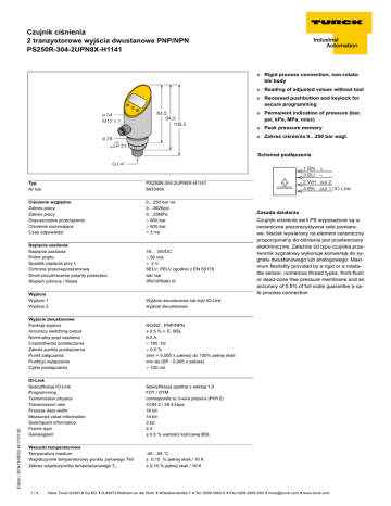 Czujnik ciśnienia 2 tranzystorowe wyjścia dwustanowe PNP/NPN PS250R-304-2UPN8X-H1141 ■ Rigid process connection, non-rotatable body ■ Reading of adjusted values without tool ■ Recessed pushbutton and keylock for secure programming ■ Permanent indication of pressure (bar, psi, kPa, MPa, misc) ■ Peak pressure memory ■ Zakres ciśnienia 0…250 bar wzgl. Edition • 2016-11-09T23:43:17+01:00 Schemat podłączenia Typ Nr kat. PS250R-304-2UPN8X-H1141 6833459 Ciśnienie względne Zakres pracy Zakres pracy Dopuszczalne przeciążenie Ciśnienie rozrywające Czas odpowiedzi 0…250 bar rel. 0…3626psi 0…25MPa ð 600 bar ï 600 bar < 3 ms Napięcie zasilania Napięcie zasilania Pobór prądu Spadek napięcia przy Ie Ochrona przeciwporażeniowa Short-circuit/reverse polarity protection Stopień ochrony / Klasa 18… 30VDC ð 50 mA ð 2V SELV; PELV zgodnie z EN 50178 tak/ tak IP67/IP69K/ III Wyjścia Wyjście 1 Wyjście 2 Wyjście dwustanowe lub tryb IO-Link wyjście dwustanowe Wyjście dwustanowe Funkcja wyjścia Accuracy switching output Nominalny prąd zasilania Częstotliwość przełączania Zakres punktu przełączania Punkt załączania: Punkt(y) wyłączenia Cykle przełączania NO/NZ , PNP/NPN ± 0.5 % v. E. BSL 0.2 A ð 180 Hz ï 0.5 % (min + 0,005 x zakres) do 100% pełnej skali min do (SP - 0,005 x zakres) ï 100 mil. IO-Link Specyfikacja IO-Link Programming Transmission physics Transmission rate Process data width Measured value information Switchpoint information Frame type Genauigkeit Specyfikacja zgodna z wersją 1.0 FDT / DTM corresponds to 3-wire physics (PHY2) COM 2 / 38.4 kbps 16 bit 14 bit 2 bit 2,2 ± 0.5 % wartości końcowej BSL Warunki temperaturowe Temperatura medium Współczynnik temperaturowy punktu zerowego Tk0 Zakres współczynnika temperaturowego TkS -40…85 °C ± 0,15 % pełnej skali / 10 K ± 0,15 % pełnej skali / 10 K 1/4 Zasada działania Czujniki ciśnienia serii PS wyposażone są w ceramiczne piezorezystywne cele pomiarowe. Nacisk wywierany na element ceramiczny proporcjonalny do ciśnienia jest przetwarzany elektronicznie. Zależnie od typu czujnika przetwornik sygnałowy wykonuje konwersję do sygnału dwustanowego lub analogowego. Maximum flexibility provided by a rigid or a rotatable sensor, numerous thread types, front-flush or dead-zone free pressure membrane and an accuracy of 0.5% of full scale guarantee a safe process connection Hans Turck GmbH & Co.KG ñ D-45472 Mülheim an der Ruhr ñ Witzlebenstraße 7 ñ Tel. 0208 4952-0 ñ Fax 0208 4952-264 ñ [email protected] ñ www.turck.com Czujnik ciśnienia 2 tranzystorowe wyjścia dwustanowe PNP/NPN PS250R-304-2UPN8X-H1141 Warunki otoczenia Temperatura pracy Temperatura składowania Odporność na wibracje Shock resistance EMC -40…80 °C -40…+80°C 20 g (9…2000 Hz), zgodnie z IEC 68-2-6 50 g (11 ms) , zgodnie z IEC 61508 EN 61000-4-2 ESD:4 kV CD / 8 kV AD EN 61000-4-3 pasmo HF: 15 V/m EN 61000-4-4 impuls: 2 kV EN 61000-4-5 udar: 1000 V, 42 Ohm EN 61000-4-6 przewód HF: 10 V Obudowa Materiał obudowy Materiał łącza procesowego Materiał przetwornika ciśnienia Materiał uszczelniający Podłączenie procesowe Wrench size pressure connection / coupling nut Połączenie elektryczne Maks. moment dokręcający nakrętki obudowy stal nierdzewna/tworzywo sztuczne, V2A (1,4305) Stal nierdzewna A2 1.4305 (AISI 303) Ceramics AI2O3 FPM spez. G ¼″, gwint męski 21 złącze kołnierzowe, M12 x 1 35 Nm Warunki odniesienia zgodne z IEC 61298-1 temperatura Ciśnienie atmosferyczne Wilgotność Zasilanie pomocnicze 15…25 °C 860…1060 hPa bezwzgl. 45…75 % wzgl. 24 VDC Wyświetlacz Jednostka wyświetlacza 4-cyfrowy 7-segmentowy wyświetlacz, możliwość obrotu o 180°, rozłączany 2 x LED żółta Punkt załączania/wyłączania, PNP/NPN; NO/NC; histereza/tryb okna, filtr; jednostki ciśnienia; pamięć wartości szczytowej ciśnienia 5 zielonych diod LED (bar, psi, kPa, MPa, misc) MTTF 242 zgodnie z SN 29500 (Ed. 99) 40 °C Edition • 2016-11-09T23:43:17+01:00 Wskaźnik stanu przełączenia Wartość pomiarowa/programowanie 2/4 Hans Turck GmbH & Co.KG ñ D-45472 Mülheim an der Ruhr ñ Witzlebenstraße 7 ñ Tel. 0208 4952-0 ñ Fax 0208 4952-264 ñ [email protected] ñ www.turck.com Czujnik ciśnienia 2 tranzystorowe wyjścia dwustanowe PNP/NPN PS250R-304-2UPN8X-H1141 Akcesoria montażowe Typ Nr kat. PTS-Cover 6907410 Osłona ochronna Rysunek wymiarowy PTS-MB-1 6877007 Uchwyt montażowy Akcesoria - okablowanie Typ Nr kat. WKC4.4T-2/TEL 6625025 Rysunek wymiarowy Przewód podłączeniowy, złącze żeńskie M12, kątowe, 4-pinowe, długość: 2 m; materiał otuliny: PVC, czarny; certyfikat cULus; dostępne również inne długości kabli i typy otuliny, patrz www.turck.com RKC4.4T-2/TEL 6625013a Przewód podłączeniowy, żeński M12, prosty, 4-stykowy, długość przewodu: 2 m; materiał otuliny: PVC, czarny; certyfikat cULus; dostępne również inne długości kabli i typy otuliny, patrz www.turck.com RKC4.4T-2/TXL 6625503 Przewód podłączeniowy, złącze żeńskie M12, proste, 4-pinowe, długość: 2 m; materiał otuliny: PVC, czarny; certyfikat cULus; dostępne również inne długości kabli i typy otuliny, Edition • 2016-11-09T23:43:17+01:00 patrz www.turck.com 3/4 Hans Turck GmbH & Co.KG ñ D-45472 Mülheim an der Ruhr ñ Witzlebenstraße 7 ñ Tel. 0208 4952-0 ñ Fax 0208 4952-264 ñ [email protected] ñ www.turck.com Czujnik ciśnienia 2 tranzystorowe wyjścia dwustanowe PNP/NPN PS250R-304-2UPN8X-H1141 Akcesoria - okablowanie Typ Nr kat. WKC4.4T-2/TXL 6625515 Rysunek wymiarowy Przewód podłączeniowy, złącze żeńskie M12, kątowe, 4-pinowe, długość: 2 m; materiał otuliny: PVC, czarny; certyfikat cULus; dostępne również inne długości kabli i typy otuliny, patrz www.turck.com RKC4.4T-2/TEL 6625013 Przewód podłączeniowy, złącze żeńskie M12, proste, 4-pinowe, długość: 2 m; materiał otuliny: PVC, czarny; certyfikat cULus; dostępne również inne długo