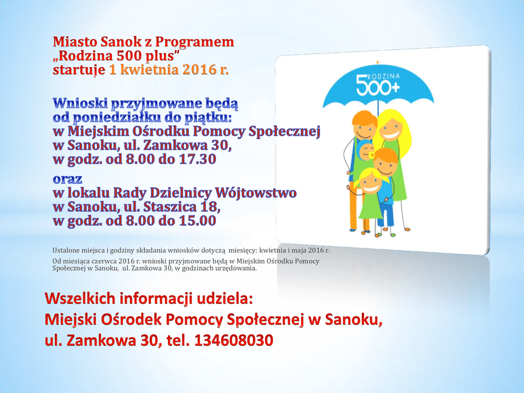 1 kwietnia 2016 r. Ustalone miejsca i godziny składania wniosków dotyczą miesięcy: kwietnia i maja 2016 r. Od miesiąca czerwca 2016 r. wnioski przyjmowane będą w Miejskim Ośrodku Pomocy Społecznej w Sanoku, ul. Zamkowa 30, w godzinach urzędowania.