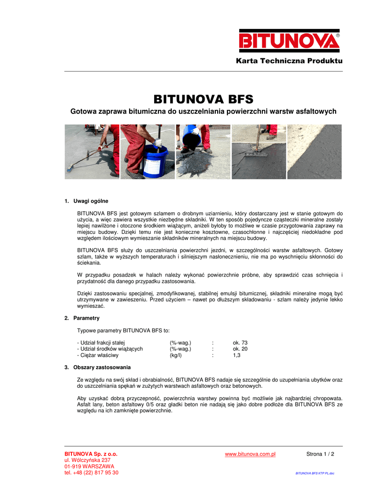 Karta Techniczna Produktu BITUNOVA BFS Gotowa zaprawa bitumiczna do uszczelniania powierzchni warstw asfaltowych 1. Uwagi ogólne BITUNOVA BFS jest gotowym szlamem o drobnym uziarnieniu, który dostarczany jest w stanie gotowym do użycia, a więc zawiera wszystkie niezbędne składniki. W ten sposób pojedyncze cząsteczki mineralne zostały lepiej nawilżone i otoczone środkiem wiążącym, aniżeli byłoby to możliwe w czasie przygotowania zaprawy na miejscu budowy. Dzięki temu nie jest konieczne kosztowne, czasochłonne i najczęściej niedokładne pod względem ilościowym wymieszanie składników mineralnych na miejscu budowy. BITUNOVA BFS służy do uszczelniania powierzchni jezdni, w szczególności warstw asfaltowych. Gotowy szlam, także w wyższych temperaturach i silniejszym nasłonecznieniu, nie ma po wyschnięciu skłonności do ściekania. W przypadku posadzek w halach należy wykonać powierzchnie próbne, aby sprawdzić czas schnięcia i przydatność dla danego przypadku zastosowania. Dzięki zastosowaniu specjalnej, zmodyfikowanej, stabilnej emulsji bitumicznej, składniki mineralne mogą być utrzymywane w zawieszeniu. Przed użyciem – nawet po dłuższym składowaniu - szlam należy jedynie lekko wymieszać. 2. Parametry Typowe parametry BITUNOVA BFS to: - Udział frakcji stałej - Udział środków wiążących - Ciężar właściwy (%-wag.) (%-wag.) (kg/l) : : : ok. 73 ok. 20 1,3 3. Obszary zastosowania Ze względu na swój skład i obrabialność, BITUNOVA BFS nadaje się szczególnie do uzupełniania ubytków oraz do uszczelniania spękań w zużytych warstwach asfaltowych oraz betonowych. Aby uzyskać dobrą przyczepność, powierzchnia warstwy powinna być możliwie jak najbardziej chropowata. Asfalt lany, beton asfaltowy 0/5 oraz gładki beton nie nadają się jako dobre podłoże dla BITUNOVA BFS ze względu na ich zamknięte powierzchnie. BITUNOVA Sp. z o.o. ul. Wólczyńska 237 01-919 WARSZAWA tel. +48 (22) 817 95 30 www.bitunova.com.pl Strona 1 / 2 BITUNOVA BFS KTP PL.doc 4. Obróbka 4.1 Przygotowanie i zastosowanie Celowym jest przeprowadzanie obróbki przy ciepłej i suchej pogodzie. Sama powierzchnia robocza musi być wolna od zanieczyszczeń i luźnych elementów i dlatego też przed obróbką powinna zostać solidnie pozamiatana. Przy większym zabrudzeniu może być konieczne czyszczenie wodą pod ciśnieniem. Świeże warstwy asfaltu mogą być natychmiast obrabiane bez podejmowania szczególnych środków. W przypadku oczekiwanych opadów deszczu oraz przy temperaturach poniżej +10°C należy przerwać prace. Nawierzchnie wykonane przy użyciu fluksowanych środków wiążących mogą zostać pokryte dopiero po całkowitym odparowaniu środków fluksujących. Mimo, że BITUNOVA BFS posiada dobrą stabilność składowania, przed obróbką szlam należy wymieszać, aby uzyskać równomierne nanoszenie. Gotowy szlam naniesiony na obrabiane powierzchnie należy rozprowadzić za pomocą gumowych zacieraczek lub ręcznych miotełek. Czas schnięcia BITUNOVA BFS zależny jest od panujących warunków atmosferycznych. Wartości orientacyjne: Temperatura gruntu, °C Temperatura zewnętrzna, °C Względna wilgotność powietrza, % Czas schnięcia, godziny ok. : : : : 32 18 50 0,5 22 17 60 1,0 12 14 80 > 4,0 Decydującym czynnikiem są też ruchy powietrza, pomagające wodzie emulsyjnej szybciej odparować. Schnięcie warstwy wykonanej z BITUNOVA BFS może wydłużyć się znacznie ponad podany czas przy chłodnej pogodzie i wysokiej wilgotności powietrza. Przed położeniem drugiej warstwy pierwsza warstwa musi być całkowicie wyschnięta. Przed ostatecznym oddaniem do eksploatacji warstwa musi być całkowicie sucha. 4.2 Zużycie materiału 4.2.1 W przypadku świeżych warstw asfaltu Zwykle wystarcza jedna warstwa BITUNOVA BFS o grubości ok. 0,8 do 1,0 kg/m². Tylko w szczególnych przypadkach należy wykonać podwójną warstwę, przy czym całkowite zużycie powinno wynosić około 1,6 2,0 kg/m². Ilość na warstwę nie może przekraczać 1,0 kg/m², gdyż w przeciwnym razie warstwa nie będzie wysychać. 4.2.2 W przypadku starszych warstw z betonu asfaltowego oraz na posadzkach cementowych Do wstępnej obróbki zalecane jest wykonanie powłoki gruntującej o grubości 0,1 - 0,15 kg/m² z bitumicznej emulsji przyczepnej. Po wyschnięciu powłoki gruntującej można dokonać obróbki przy użyciu BITUNOVA BFS jak opisano w punkcie 4.2.1. 4.3 Rozcieńczanie W razie potrzeby, np. przy wysokich temperaturach powierzchni, w celu uzyskania lepszej obrabialności BITUNOVA BFS może być zmieszana z niewielkimi ilościami wody. 4.4 Składowanie materiału BITUNOVA BFS może być składowana przez klika miesięcy. Przy dłuższym składowaniu może wystąpić w opakowaniu niewielki osad, który jednak jest łatwy do wymieszania. Należy zwrócić uwagę, aby przy transporcie i składowaniu BITUNOVA BFS temperatura nie spadła poniżej granicy 0 °C. 4.5 Konserwacja przyrządów Po naniesieniu zaprawy przyrządy do obróbki należy natychmiast spłukać wodą. Zaschnięte resztki BITUNOVA BFS należy usunąć dostępnymi w handlu przemysłowymi preparatami czyszczącymi (benzyna ekstrakcyjna, nafta, olej naedowy). BITUNOVA Sp. z o.o. ul. Wólczyńska 237 01-919 WARSZAWA tel. +48 (22) 817 95 30 www.bitunova.com.pl Strona 2 / 2 BITUNOVA BFS KTP PL.doc