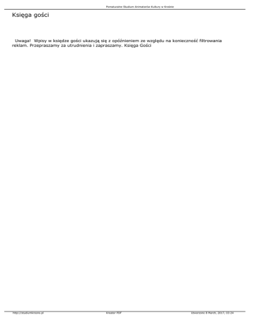 Pomaturalne Studium Animatorów Kultury w Krośnie Księga gości Uwaga! Wpisy w księdze gości ukazują się z opóźnieniem ze względu na konieczność filtrowania reklam. Przepraszamy za utrudnienia i zapraszamy. Księga Gości http://studiumkrosno.pl Kreator PDF Utworzono 8 March, 2017, 03:24