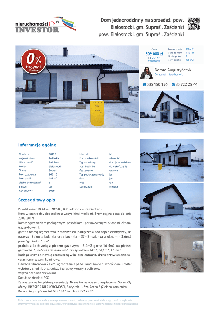 Dom jednorodzinny na sprzedaż, pow. Białostocki, gm. Supraśl, Zaścianki pow. Białostocki, gm. Supraśl, Zaścianki Cena 509 000 zł lub 2 212 zł miesięcznie Powierzchnia Cena za metr Liczba pokoi Pow. działki 160 m2 3 181 zł 5 485 m2 Dorota Augustyńczyk Doradca ds. nieruchomości 535 150 156 Informacje ogólne Nr oferty 30925 Internet tak Województwo Podlaskie Forma własności własność Miejscowość Zaścianki Typ zabudowy dom jednorodzinny Powiat Białostocki Stan budynku do wykończenia Gmina Supraśl Ogrzewanie gazowe Pow. użytkowa 160 m2 Typ podłączenia wody jest Pow. działki 485 m2 Gaz jest Liczba pomieszczeń 5 Prąd tak Balkon tak Kanalizacja miejska Rok budowy 2016 Szczegółowy opis Przedstawiam DOM WOLNOSTOJĄCY położony w Zaściankach. Dom w stanie developerskim z wszystkimi mediami. Promocyjna cena do dnia 28.02.2017! Dom z ogrzewaniem podłogowym, posadzkami, potynkowanymi ścianami, oknami trzyszybowymi, garaż z bramą segmentową z możliwością podłączenia pod napęd elektryczny, Na paterze, Salon z jadalnią oraz kuchnią - 37m2 łazienka z oknem - 3,6m,2 pokój/gabinet - 7,5m2 pralnia z kotłownią z piecem gazowym - 5,4m2 garaż 16-4m2 na piętrze garderoba 7,8m2 duża łazienka 9m2 trzy sypialnie - 14m2, 14,4m2, 17,8m2 Dach pokryty dachówką ceramiczną w kolorze antracyt, drzwi antywłamaniowe, ceramiczny system kominowy. Elewacja silikonowa 20 cm, ogrodzenie z paneli modułowych, wokół domu został wyłożony chodnik oraz dojazd i taras wykonany z polbruku. Więźba dachowa drewniana. Kupujący nie płaci PCC. Zapraszam na bezpłatną prezentację. Nasze transakcje są ubezpieczone! Szczegóły oferty: INVESTOR NIERUCHOMOŚCI, Białystok ul. Św. Rocha 5 (Zielona Kamienica) Dorota Augustyńczyk tel. 535 150 156 lub 85 722 25 44. Nota prawna: Informacje dotyczące opisu nieruchomości podane są przez właściciela, mają charakter wyłącznie informacyjny i mogą podlegać aktualizacji. Oferta dotycząca nieruchomości stanowi zaproszenie do rokowań zgodnie 85 722 25 44 z art. 71 Kodeksu Cywilnego i nie stanowi oferty określonej w art. 66 i następnych KC. Oddział Białystok, ul. Św. Rocha 5 (Zielona Kamienica) , 15-879 Białystok 77 400 01 76 • [email protected] • www.investor.net.pl 2017-03-08 04:24:09 Strona 1 z 1