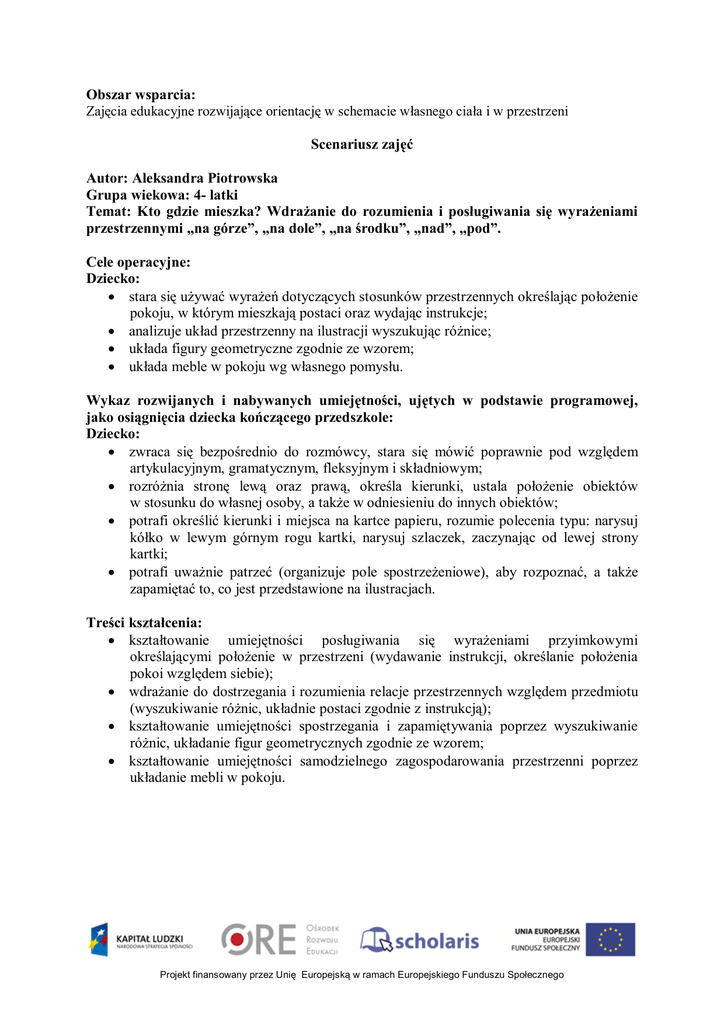 Obszar wsparcia: Zajęcia edukacyjne rozwijające orientację w schemacie własnego ciała i w przestrzeni Scenariusz zajęć Autor: Aleksandra Piotrowska Grupa wiekowa: 4- latki Temat: Kto gdzie mieszka? Wdrażanie do rozumienia i posługiwania się wyrażeniami przestrzennymi „na górze”, „na dole”, „na środku”, „nad”, „pod”. Cele operacyjne: Dziecko: stara się używać wyrażeń dotyczących stosunków przestrzennych określając położenie pokoju, w którym mieszkają postaci oraz wydając instrukcje; analizuje układ przestrzenny na ilustracji wyszukując różnice; układa figury geometryczne zgodnie ze wzorem; układa meble w pokoju wg własnego pomysłu. Wykaz rozwijanych i nabywanych umiejętności, ujętych w podstawie programowej, jako osiągnięcia dziecka kończącego przedszkole: Dziecko: zwraca się bezpośrednio do rozmówcy, stara się mówić poprawnie pod względem artykulacyjnym, gramatycznym, fleksyjnym i składniowym; rozróżnia stronę lewą oraz prawą, określa kierunki, ustala położenie obiektów w stosunku do własnej osoby, a także w odniesieniu do innych obiektów; potrafi określić kierunki i miejsca na kartce papieru, rozumie polecenia typu: narysuj kółko w lewym górnym rogu kartki, narysuj szlaczek, zaczynając od lewej strony kartki; potrafi uważnie patrzeć (organizuje pole spostrzeżeniowe), aby rozpoznać, a także zapamiętać to, co jest przedstawione na ilustracjach. Treści kształcenia: kształtowanie umiejętności posługiwania się wyrażeniami przyimkowymi określającymi położenie w przestrzeni (wydawanie instrukcji, określanie położenia pokoi względem siebie); wdrażanie do dostrzegania i rozumienia relacje przestrzennych względem przedmiotu (wyszukiwanie różnic, układnie postaci zgodnie z instrukcją); kształtowanie umiejętności spostrzegania i zapamiętywania poprzez wyszukiwanie różnic, układanie figur geometrycznych zgodnie ze wzorem; kształtowanie umiejętności samodzielnego zagospodarowania przestrzenni poprzez układanie mebli w pokoju. Projekt finansowany przez Unię Europejską w ramach Europejskiego Funduszu Społecznego Opis sposobu realizacji: Lp. Rodzaj ćwiczenia 1. Nawiązanie do tematu zajęć. 2. Ćwiczenia usprawniające 3. Ćwiczenia właściwe 4. Ćwiczenia kończące Przebieg Czas 1. Powiedz, gdzie 2 min. mieszka…?: nauczyciel (N) zachęca dzieci, aby używając określeń przestrzennych omówiły położenie pokoju, w którym mieszkają dane postacie (np. Kasia mieszka nad Kacprem, ale pod Anią). 2. Zwierzaki figuraki: 2 min. układanie zwierząt z szablonów figur geometrycznych zgodnie ze wzorem ukazanym w prezentacji multimedialnej. 3. Kto gdzie mieszka?: 10 min N zachęca dzieci, aby się wzajemnie instruowały, w którym pokoju mieszka dana osoba. 4. Dwa prawie identyczne pokoje: dzieci wyszukują różnice między dwoma slajdami. 5. Umebluj pokój: 1 min N proponuje, aby dzieci zgodnie z własnym pomysłem umeblowały pokój. Uwagi o realizacji, warunki pobudzające aktywność dziecka Materiały: prezentacja multimedialna (załącznik nr 5). Materiały: prezentacja multimedialna (załącznik nr 6), szablony (załącznik nr 1). Materiały: prezentacja multimedialna (załącznik nr 7), szablony postaci (załącznik nr 2), ilustracje (załącznik nr 3). Materiały: prezentacja multimedialna (załącznik nr 8). Materiały: ilustracja (załącznik nr 4). Uwagi: Propozycje zawarte w scenariuszu zostały przygotowane w taki sposób, aby nauczyciel mógł dostosować czas realizacji zajęć do możliwości dzieci w grupie oraz z zachowaniem tzw. zasady 1/5, zalecanej w części podstawy programowej dotyczącej zalecanych warunków i sposobu jej realizacji. Zajęcia nie powinny trwać dłużej niż 15 minut. Projekt finansowany przez Unię Europejską w ramach Europejskiego Funduszu Społecznego Jeżeli niektóre dzieci pomimo upływu czasu są zainteresowane proponowanymi działaniami nie należy im przerywać tej aktywności. Dzieci, których uwaga się wyczerpała, w naturalny sposób powracają do realizacji „programu własnego”, czyli wybranego przez siebie rodzaju aktywności (np. zabawowej). Metody za M. Kwiatowską (1985): Czynne: ćwiczeń. Słowne: objaśnienia i instrukcje. Percepcyjne: obserwacja i pokaz, przykład dorosłych. Formy: praca indywidualna jednolita i zróżnicowana, grupowa jednolita. Środki dydaktyczne: komputer z dostępem do Internetu oraz głośnikami lub tablica multimedialna, środki dydaktyczne zamieszczone na portalu Scholaris (dla nauczyciela do wykorzystania w pracy z dzieckiem): 1. 2. 3. 4. 5. 6. 7. 8. Figury geometryczne - szablony; Dzieci - szablony; Ilustracja – Kto gdzie mieszka?; Umebluj pokój – szablony; Prezentacja multimedialna – Powiedz, gdzie mieszka… ?; Prezentacja multimedialna - Zwierzaki figuraki; Prezentacja multimedialna - Dzieci w pokojach; Prezentacja multimedialna - Dwa prawie identyczne pokoje. Projekt finansowany przez Unię Europejską w ramach Europejskiego Funduszu Społecznego