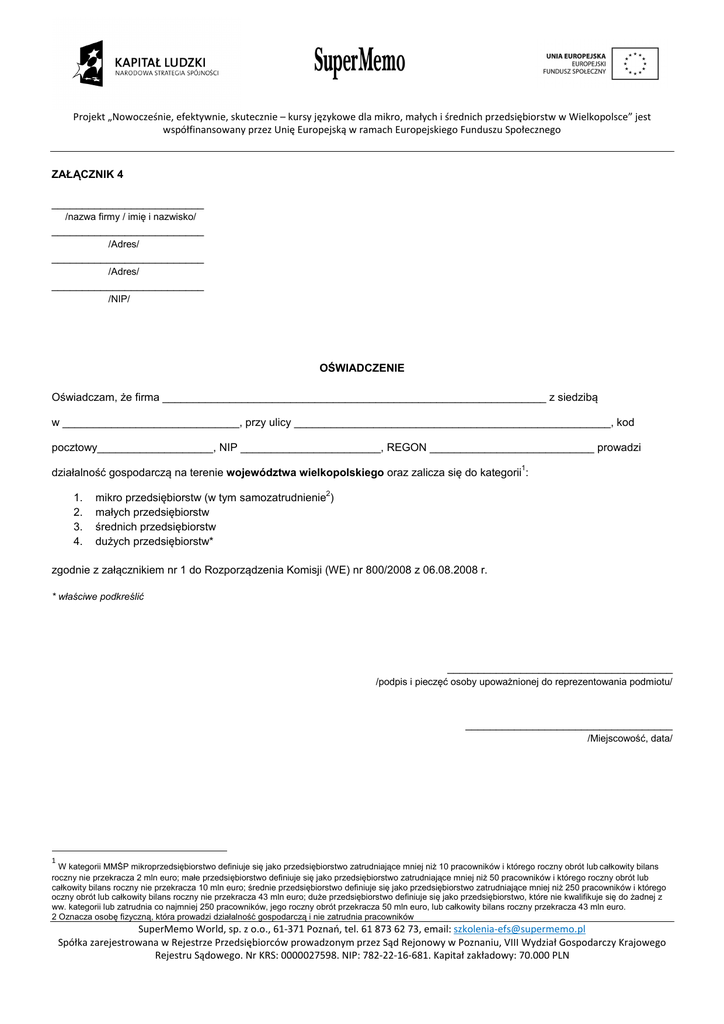 Projekt „Nowocześnie, efektywnie, skutecznie – kursy językowe dla mikro, małych i średnich przedsiębiorstw w Wielkopolsce” jest współfinansowany przez Unię Europejską w ramach Europejskiego Funduszu Społecznego ZAŁĄCZNIK 4 _________________________ /nazwa firmy / imię i nazwisko/ _________________________ /Adres/ _________________________ /Adres/ _________________________ /NIP/ OŚWIADCZENIE Oświadczam, że firma _______________________________________________________________ z siedzibą w _____________________________, przy ulicy ____________________________________________________, kod pocztowy___________________, NIP _______________________, REGON ___________________________ prowadzi 1 działalność gospodarczą na terenie województwa wielkopolskiego oraz zalicza się do kategorii : 1. 2. 3. 4. 2 mikro przedsiębiorstw (w tym samozatrudnienie ) małych przedsiębiorstw średnich przedsiębiorstw dużych przedsiębiorstw* zgodnie z załącznikiem nr 1 do Rozporządzenia Komisji (WE) nr 800/2008 z 06.08.2008 r. * właściwe podkreślić _____________________________________ /podpis i pieczęć osoby upoważnionej do reprezentowania podmiotu/ __________________________________ /Miejscowość, data/ 1 W kategorii MMŚP mikroprzedsiębiorstwo definiuje się jako przedsiębiorstwo zatrudniające mniej niż 10 pracowników i którego roczny obrót lub całkowity bilans roczny nie przekracza 2 mln euro; małe przedsiębiorstwo definiuje się jako przedsiębiorstwo zatrudniające mniej niż 50 pracowników i którego roczny obrót lub całkowity bilans roczny nie przekracza 10 mln euro; średnie przedsiębiorstwo definiuje się jako przedsiębiorstwo zatrudniające mniej niż 250 pracowników i którego oczny obrót lub całkowity bilans roczny nie przekracza 43 mln euro; duże przedsiębiorstwo definiuje się jako przedsiębiorstwo, które nie kwalifikuje się do żadnej z ww. kategorii lub zatrudnia co najmniej 250 pracowników, jego roczny obrót przekracza 50 mln euro, lub całkowity bilans roczny przekracza 43 mln euro. 2 Oznacza osobę fizyczną, która prowadzi działalność gospodarczą i nie zatrudnia pracowników SuperMemo World, sp. z o.o., 61-371 Poznań, tel. 61 873 62 73, email: [email protected] Spółka zarejestrowana w Rejestrze Przedsiębiorców prowadzonym przez Sąd Rejonowy w Poznaniu, VIII Wydział Gospodarczy Krajowego Rejestru Sądowego. Nr KRS: 0000027598. NIP: 782-22-16-681. Kapitał zakładowy: 70.000 PLN