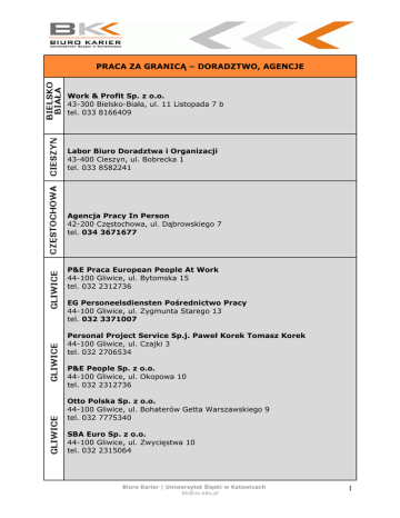 PRACA ZA GRANICĄ – DORADZTWO, AGENCJE Work & Profit Sp. z o.o. 43-300 Bielsko-Biała, ul. 11 Listopada 7 b tel. 033 8166409 Labor Biuro Doradztwa i Organizacji 43-400 Cieszyn, ul. Bobrecka 1 tel. 033 8582241 Agencja Pracy In Person 42-200 Częstochowa, ul. Dąbrowskiego 7 tel. 034 3671677 P&E Praca European People At Work 44-100 Gliwice, ul. Bytomska 15 tel. 032 2312736 EG Personeelsdiensten Pośrednictwo Pracy 44-100 Gliwice, ul. Zygmunta Starego 13 tel. 032 3371007 Personal Project Service Sp.j. Paweł Korek Tomasz Korek 44-100 Gliwice, ul. Czajki 3 tel. 032 2706534 P&E People Sp. z o.o. 44-100 Gliwice, ul. Okopowa 10 tel. 032 2312736 Otto Polska Sp. z o.o. 44-100 Gliwice, ul. Bohaterów Getta Warszawskiego 9 tel. 032 7775340 SBA Euro Sp. z o.o. 44-100 Gliwice, ul. Zwycięstwa 10 tel. 032 2315064 Biuro Karier | Uniwersytet Śląski w Katowicach [email protected] 1 Sep Peeters Polska Sp. z o.o. 44-100 Gliwice, ul. Zwycięstwa 14 p. 16 tel. 032 2318188 Want 2 Work Sp. z o.o. Agencja Pośrednictwa Pracy 44-100 Gliwice, ul. Bohaterów Getta Warszawskiego 9 tel. 032 7775311 WFD Personel Sp. z o.o. 44-100 Gliwice, ul. Zwycięstwa 12 tel. 032 7751859 Pro Group-Polska Sp. z o.o. 44-100 Gliwice, ul. Zwycięstwa 10 tel. 032 3316020 SILESIA PERSONAL Sp. z o.o. 44-100 Gliwice, ul. Bohaterow Getta Warszawskiego 9, tel. 032 7775305, 7775306 ALPEX Przedsiębiorstwo Budownictwa Górniczego Sp. z o.o. 44-335 Jastrzębie Zdrój, ul. Opolska paw.723, tel. 32 4701212, 2810806, 2815488, 2813028, 2813589 PUTiH POLCARBO s.j. 43-600 Jaworzno, ul. Grunwaldzka 235 tel. 032 7512340 Link Consulting Doradztwo Personalne 40-082 Katowice, ul. Sobieskiego 15/2 tel. 032 7819901, 2505003 Personal Partners Europe Sp. z o.o. 40-013 Katowice, Staromiejska 12 tel. 032 4149837 Infoitalia Firma Usługowo-Handlowa Dorota Labusga 40-004 Katowice, al. Korfantego 2 tel. 032 7819996 König Polska Sp. z o.o. 40-037 Katowice, ul. Ligonia 30 tel. 032 2506006 Biuro Karier | Uniwersytet Śląski w Katowicach [email protected] 2 Obiettivo Lavoro Polska - Agencja Pracy Tymczasowej 40-063 Katowice, ul. Żwirki i Wigury 14 /2 tel. 032 2056132 SK Expres Pośrednictwo Pracy 40-091 Katowice, ul. Piotra Skargi 8 /217 tel. 032 2060601 Persona Part Personaldienstleistungen GmbH Sp. z o.o. Oddział w Polsce 40-114 Katowice, ul. 3 Maja 20/5 tel. 032 6086840 JMB Consulting 40-096 Katowice, ul. 3 Maja 34 - drugie piętro tel. 032 2536717 S&D Polska Sp. z o.o. 40-005 Katowice, ul. Moniuszki 3 tel. 032 2536171 Logistic Services sp. z o.o. 42-700 Lubliniec, ul. Piłsudskiego 4 tel. 034 3531995 Direct People Polska 42-700 Lubliniec, ul. Stein 14 tel. 034 3511589 Otto Polska Sp. z o.o. 47-440 Nędza, ul. Sienkiewicza 21 tel. 032 4187172 Level One Sp. z o.o. 47-450 Nowa Wioska, ul. Leśna 10 tel. 032 4195302 Wziontek Teresa Biuro Pośrednictwa Pracy 47-470 Pietraszyn, ul. Dolna 17 tel. 032 4174419 Biuro Karier | Uniwersytet Śląski w Katowicach [email protected] 3 Agencja Pracy In Person 47-400 Racibórz, Długa 12 tel. 032 4191876 APM Agencja Pracy 47-400 Racibórz, ul. Klasztorna 12 tel. 032 7552381 Euroservices Polska Sp. z o.o. 47-400 Racibórz, ul. Ogrodowa 5 tel. 032 4140145 E&A Sp. z o.o. 47-400 Racibórz, ul. Pocztowa 10 tel. 032 4149961 Total Team Polska Sp. zo.o. 47-400 Racibórz, ul. Bankowa 6 tel. 032 4147262 Silesia Personal Sp. z o.o. 47-400 Racibórz, ul. Pastora Michejdy 48 tel. 032 4151998, 4151501 SBA Euro Sp. z o.o. 47-400 Racibórz, ul. Chopina 9 tel. 032 4140871 Otto Polska Sp. z o.o. 47-400 Racibórz, ul. Ogrodowa 5 tel. 032 4153936 Sep Peeters Polska Sp. z o.o. 47-400 Racibórz, ul. Opawska 67 tel. 032 4147193 Omega Resource Group PLC S.A. 43-100 Tychy, ul. Budowlanych 156 tel. 032 3210103 Work Wonders Rafał Kruk 43-100 Tychy, ul. Grota-Roweckiego 44 /334 tel. 0513101552 Global Work Sp. z o.o. 41-800 Zabrze, ul. Padlewskiego 6 tel. 032 2777555 Biuro Karier | Uniwersytet Śląski w Katowicach [email protected] 4 APM Agencja Pracy 41-800 Zabrze, ul. Wolności 262/501 tel. 032 7761381 Komet S.C. Grzegorz Raszka Anna Lubelska 42-674 Zbrosławice, ul. Wolności 53 tel. 032 3343841 Źródło: Panorama Firm Biuro Karier | Uniwersytet Śląski w Katowicach [email protected] 5