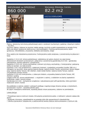 MIESZKANIE na SPRZEDAŻ 860 000 Warszawa, Mokotów, Czerska 82.2 m2 10232/2095/OMS Secondary 2012 5 6 3 Opis Piękny, słoneczny (od strony południowej) salon z aneksem kuchennym, jadalnią i otwartym hallem – 41,3m2 Kuchnia: Piękne, robione na wymiar meble wenge, kuchnia w pełni wyposażona w sprzęty firmy AEG oraz Bosch (piekarnik elektryczny z termoobiegiem i funkcją samoczyszczenia, płyta grzewcza, mikrofalówka, zmywarka, lodówko-zamrażarka, okap) Przy wejściu do mieszkania przestronna i funkcjonalna szafa wnękowa, z przestrzenią na płaszcze i buty Sypialnia 1 (11,4 m2, strona południowa), oddzielona od salonu dużymi na całą ścianę drewnianymi drzwiami przesuwnymi, połączona z przestronną garderobą (4,3 m2) – garderoba zabudowana, bardzo pakowna i przestronna Sypialnia 2 (13,5 m2, strona wschodnia) z oknami od strony wschodniej, z funkcjonalną i pakowną szafą na wymiar, na całej ścianie Łazienka 1 (6,7 m2) przestronna, z pięknymi lustrami, z podwójną umywalką (Laufen 180 cm z relingiem na ręczniki), dużą wanną (wanna Ravak, bateria Grohe Tenso), prysznicem (drzwi Hüppe Joop, bateria Grohe Tenso), WC (Kohler), bidet (bidet Kohler, bateria Grohe Tenso), baterie umywalkowe (Grohe Tenso) Łazienka 2 (2,6 m2) funkcjonalna, z roboczym blatem, umywalką (bateria Grohe Tenso), WC (Kohler) i pralką Loggia (5,95 m2, strona południowa) – z wyjściem z salonu, z widokiem na dachy sąsiednich budynków, niebo i korony drzew Garderoba (4,3 m2) – kompletnie urządzona i zabudowana pod sufit garderoba, która pomieści większość ubrań i butów Na podłodze w salonie, jadalni i pokojach podłoga z egzotycznego drewna wenge, w łazienkach, korytarzach i kuchni – wysokiej jakości gres. W całym mieszkaniu drewniane, wysokiej jakości drzwi przesuwne, robione na zamówienie. LOKALIZACJA: * Prawdziwa oaza w centrum miasta. W budynku przestronne patio, z roślinami i placem zabaw dla dzieci. * Budynek chroniony, wjazd/wejście na posesję tylko dla uprawnionych mieszkańców. * Okolica kameralna i bezpieczna, a jednocześnie bardzo dobrze skomunikowana z Centrum (ok. Kancelaria GOLDHAUS & Partnerzy Marco von der Vanbrugh 15 min jedzie się autobusem do Rotundy; przystanek Sielce, autobusy: 107, 131, 141, 159, 162, 167,168, 180, 185, 187, N31, N 33, N81, N83). * 10 min. spacerem (4 min. biegiem) do Łazienek. * W samym bloku w części usługowej: Carrefour express, Apteka, Rossmann, Biuro podróży, bankomat. * 3 min spacerem do Mielżyński Wine Bar, Telepizzy, Głodomorów. 106/ Maciej Cender tel. +48/663-431-024 email: [email protected] Kancelaria GOLDHAUS & Partnerzy Marco von der Vanbrugh Powered by TCPDF (www.tcpdf.org)