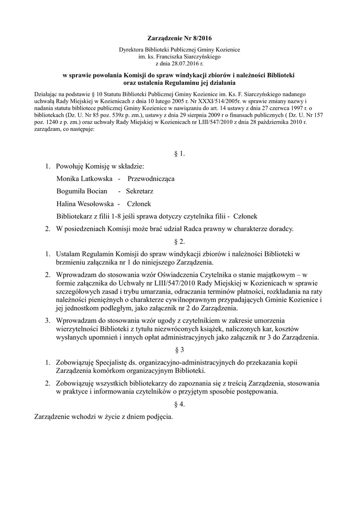 Zarządzenie Nr 8/2016 Dyrektora Biblioteki Publicznej Gminy Kozienice im. ks. Franciszka Siarczyńskiego z dnia 28.07.2016 r. w sprawie powołania Komisji do spraw windykacji zbiorów i należności Biblioteki oraz ustalenia Regulaminu jej działania Działając na podstawie § 10 Statutu Biblioteki Publicznej Gminy Kozienice im. Ks. F. Siarczyńskiego nadanego uchwałą Rady Miejskiej w Kozienicach z dnia 10 lutego 2005 r. Nr XXXI/514/2005r. w sprawie zmiany nazwy i nadania statutu bibliotece publicznej Gminy Kozienice w nawiązaniu do art. 14 ustawy z dnia 27 czerwca 1997 r. o bibliotekach (Dz. U. Nr 85 poz. 539z p. zm.), ustawy z dnia 29 sierpnia 2009 r o finansach publicznych ( Dz. U. Nr 157 poz. 1240 z p. zm.) oraz uchwały Rady Miejskiej w Kozienicach nr LIII/547/2010 z dnia 28 października 2010 r. zarządzam, co następuje: § 1. 1. Powołuję Komisję w składzie: Monika Latkowska Bogumiła Bocian Przewodnicząca - Sekretarz Halina Wesołowska - Członek Bibliotekarz z filii 1-8 jeśli sprawa dotyczy czytelnika filii - Członek 2. W posiedzeniach Komisji może brać udział Radca prawny w charakterze doradcy. § 2. 1. Ustalam Regulamin Komisji do spraw windykacji zbiorów i należności Biblioteki w brzmieniu załącznika nr 1 do niniejszego Zarządzenia. 2. Wprowadzam do stosowania wzór Oświadczenia Czytelnika o stanie majątkowym – w formie załącznika do Uchwały nr LIII/547/2010 Rady Miejskiej w Kozienicach w sprawie szczegółowych zasad i trybu umarzania, odraczania terminów płatności, rozkładania na raty należności pieniężnych o charakterze cywilnoprawnym przypadających Gminie Kozienice i jej jednostkom podległym, jako załącznik nr 2 do Zarządzenia. 3. Wprowadzam do stosowania wzór ugody z czytelnikiem w zakresie umorzenia wierzytelności Biblioteki z tytułu niezwróconych książek, naliczonych kar, kosztów wysłanych upomnień i innych opłat administracyjnych jako załącznik nr 3 do Zarządzenia. §3 1. Zobowiązuję Specjalistę ds. organizacyjno-administracyjnych do przekazania kopii Zarządzenia komórkom organizacyjnym Biblioteki. 2. Zobowiązuję wszystkich bibliotekarzy do zapoznania się z treścią Zarządzenia, stosowania w praktyce i informowania czytelników o przyjętym sposobie postępowania. § 4. Zarządzenie wchodzi w życie z dniem podjęcia. Załącznik nr 1 do Z 8/2016 z dnia 28.07.2016 r. REGULAMIN KOMISJI DO SPRAW WINDYKACJI ZBIORÓW i NALEŻNOŚCI BIBLIOTEKI §1 1. Komisja do spraw windykacji zbiorów i należności Biblioteki zwana dalej „Komisją”działa na podstawie Zarządzenia Dyrektora nr 8 /2016 r. z dnia 28.07.2016 r. oraz niniejszego Regulaminu. 2. W skład Komisji, wchodzą członkowie powołani według Zarządzenia, o którym mowa w ust 1. §2 1. Do zadań Komisji należy w szczególności: rozpatrywanie podań Czytelników w przedmiocie nałożonych kar pieniężnych za nieterminowy zwrot wypożyczonych materiałów bibliotecznych, wydawanie opinii w oparciu o oświadczenie Czytelnika o jego stanie majątkowym wraz z załącznikami, oraz analizę historii wypożyczeń, przedstawianie Dyrektorowi Biblioteki pisemnej opinii i wniosków w celu podjęcia decyzji, przygotowywanie porozumień w sprawie spłaty wierzytelności Czytelników, odpowiedzi na podania Czytelników wraz z informacją o podjętej decyzji oraz innej korespondencji, rejestrowanie w książce korespondencji pism przychodzących i wychodzących a dotyczących windykacji zbiorów i należności Biblioteki, współpraca z Radcą prawnym Urzędu Miejskiego w Kozienicach, doradzanie Dyrektorowi w sprawie windykacji należności Biblioteki. 2. Komisja wyraża opinię w sprawie podań Czytelników o umorzenie i/lub rozłożenie na raty wierzytelności Biblioteki oraz wnioskuje dalsze postępowanie windykacyjne w protokole z posiedzenia Komisji. §3 Ilekroć w regulaminie mowa jest o: 1. Wierzytelności - rozumie się wymagalną kwotę, wynikającą z obowiązujących w tym zakresie przepisów ustanowionych przez Bibliotekę, przy czym do wierzytelności zalicza się wyliczoną opłatę za przetrzymanie zbiorów, wartość niezwróconych materiałów bibliotecznych oraz koszty upomnień i inne koszty administracyjne. 2. Bibliotece - rozumie się przez to Bibliotekę Publiczną Gminy Kozienice. 3. Czytelniku - rozumie się przez to Czytelnika, który posiada wymagalną przez Bibliotekę wierzytelność wynikającą z niedotrzymania terminu zwrotu zbiorów wypożyczonych w Bibliotece. 4. Oświadczeniu Czytelnika o stanie majątkowym - rozumie się wypełnione oświadczenie wg wzoru wprowadzonego w załączniku do Uchwały nr LIII/547/2010 Rady Miejskiej w Kozienicach w sprawie szczegółowych zasad i trybu umarzania, odraczania terminów płatności, rozkładania na raty należności pieniężnych o charakterze cywilnoprawnym przypadających Gminie Kozienice i jej jednostkom podległym. 5. Minimum socjalnym - rozumie się kwotę podaną w aktualnym komunikacie Instytutu Pracy i Spraw Socjalnych o wysokości minimum socjalnego (https://www.ipiss.com.pl/ ). §4 1. Rozpatrując podanie Czytelnika Komisja może: a) wnioskować utrzymanie wierzytelności, b) wnioskować odstąpienie od domagania się spłaty wierzytelności w przypadku: śmierci Czytelnika ciężkiej choroby Czytelnika trudnej sytuacji ekonomicznej Czytelnika, o dochodach na poziomie minimum socjalnego, gdy spłata wierzytelności zagrozi jego bytowi i egzystencji i/lub osób pozostających na jego utrzymaniu. gdy brak jest kontaktu z Czytelnikiem, a kwota długu nie przekracza czterokrotnej wartości opłaty pocztowej za przesyłkę listową poleconą za zwrotnym poświadczeniem odbioru. c) wnioskować o umorzenie części wierzytelności w przypadku trudnej sytuacji ekonomicznej lub społecznej Czytelnika. d) wnioskować o odroczenie terminu spłaty wierzytelności i/lub rozłożenie jej na raty. 2. W przypadku decyzji Dyrektora o odroczeniu spłaty wierzytelności lub rozłożeniu jej na 