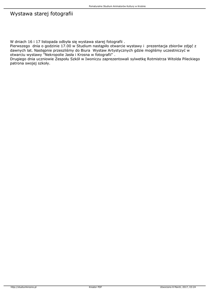 Pomaturalne Studium Animatorów Kultury w Krośnie Wystawa starej fotografii W dniach 16 i 17 listopada odbyła się wystawa starej fotografii . Pierwszego dnia o godzinie 17.00 w Studium nastąpiło otwarcie wystawy i prezentacja zbiorów zdjęć z dawnych lat. Następnie przeszliśmy do Biura Wystaw Artystycznych gdzie mogliśmy uczestniczyć w otwarciu wystawy "Nekropolie Jasła i Krosna w fotografii" . Drugiego dnia uczniowie Zespołu Szkół w Iwoniczu zaprezentowali sylwetkę Rotmistrza Witolda Pileckiego patrona swojej szkoły. http://studiumkrosno.pl Kreator PDF Utworzono 8 March, 2017, 03:24