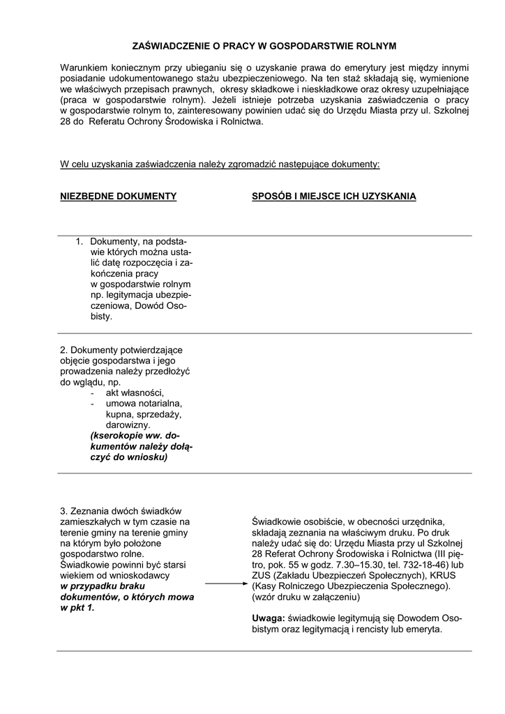 ZAŚWIADCZENIE O PRACY W GOSPODARSTWIE ROLNYM Warunkiem koniecznym przy ubieganiu się o uzyskanie prawa do emerytury jest między innymi posiadanie udokumentowanego stażu ubezpieczeniowego. Na ten staż składają się, wymienione we właściwych przepisach prawnych, okresy składkowe i nieskładkowe oraz okresy uzupełniające (praca w gospodarstwie rolnym). Jeżeli istnieje potrzeba uzyskania zaświadczenia o pracy w gospodarstwie rolnym to, zainteresowany powinien udać się do Urzędu Miasta przy ul. Szkolnej 28 do Referatu Ochrony Środowiska i Rolnictwa. W celu uzyskania zaświadczenia należy zgromadzić następujące dokumenty: NIEZBĘDNE DOKUMENTY SPOSÓB I MIEJSCE ICH UZYSKANIA 1. Dokumenty, na podstawie których można ustalić datę rozpoczęcia i zakończenia pracy w gospodarstwie rolnym np. legitymacja ubezpieczeniowa, Dowód Osobisty. 2. Dokumenty potwierdzające objęcie gospodarstwa i jego prowadzenia należy przedłożyć do wglądu, np. - akt własności, - umowa notarialna, kupna, sprzedaży, darowizny. (kserokopie ww. dokumentów należy dołączyć do wniosku) 3. Zeznania dwóch świadków zamieszkałych w tym czasie na terenie gminy na terenie gminy na którym było położone gospodarstwo rolne. Świadkowie powinni być starsi wiekiem od wnioskodawcy w przypadku braku dokumentów, o których mowa w pkt 1. Świadkowie osobiście, w obecności urzędnika, składają zeznania na właściwym druku. Po druk należy udać się do: Urzędu Miasta przy ul Szkolnej 28 Referat Ochrony Środowiska i Rolnictwa (III piętro, pok. 55 w godz. 7.30–15.30, tel. 732-18-46) lub ZUS (Zakładu Ubezpieczeń Społecznych), KRUS (Kasy Rolniczego Ubezpieczenia Społecznego). (wzór druku w załączeniu) Uwaga: świadkowie legitymują się Dowodem Osobistym oraz legitymacją i rencisty lub emeryta. 4.Oświadczenie wnioskodawcy w sprawie braku dokumentów. Wnioskodawca składa oświadczenie na właściwym druku. Po druk należy udać się do: Urzędu Miasta przy ul. Szkolnej 28, Referat Ochrony Środowiska i Rolnictwa (III piętro, pok. 55 w godz. 7.30–15.30, tel. 732-18-46) lub KRUS (Kasy Rolniczego Ubezpieczenia Społecznego). (wzór druku w załączeniu) 5. Wniosek o wydanie zaświadczenia o pracy w gospodarstwie rolnym. (druk nr ROŚ IX) Urząd Miasta, ul. Szkolna 28 Referat Ochrony Środowiska i Rolnictwa tel. 732-18-46 www.bom.piotrkow.pl e-mail: e-urzą[email protected]