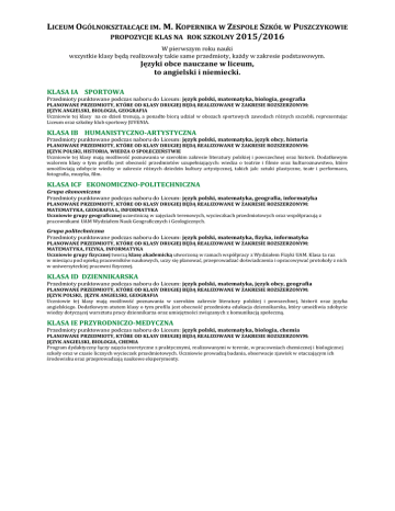 LICEUM OGÓLNOKSZTAŁCĄCE IM. M. KOPERNIKA W ZESPOLE SZKÓŁ W PUSZCZYKOWIE PROPOZYCJE KLAS NA ROK SZKOLNY 2015/2016 W pierwszym roku nauki wszystkie klasy będą realizowały takie same przedmioty, każdy w zakresie podstawowym. Języki obce nauczane w liceum, to angielski i niemiecki. KLASA IA SPORTOWA Przedmioty punktowane podczas naboru do Liceum: język polski, matematyka, biologia, geografia PLANOWANE PRZEDMIOTY, KTÓRE OD KLASY DRUGIEJ BĘDĄ REALIZOWANE W ZAKRESIE ROZSZERZONYM: JĘZYK ANGIELSKI, BIOLOGIA, GEOGRAFIA Uczniowie tej klasy na co dzień trenują, a ponadto biorą udział w obozach sportowych zawodach różnych szczebli, reprezentując Liceum oraz szkolny klub sportowy JUVENIA. KLASA IB HUMANISTYCZNO-ARTYSTYCZNA Przedmioty punktowane podczas naboru do Liceum: język polski, matematyka, język obcy, historia PLANOWANE PRZEDMIOTY, KTÓRE OD KLASY DRUGIEJ BĘDĄ REALIZOWANE W ZAKRESIE ROZSZERZONYM: JĘZYK POLSKI, HISTORIA, WIEDZA O SPOŁECZEŃSTWIE Uczniowie tej klasy mają możliwość poznawania w szerokim zakresie literatury polskiej i powszechnej oraz historii. Dodatkowym walorem klasy o tym profilu jest obecność przedmiotów uzupełniających: wiedza o teatrze i filmie oraz kulturoznawstwo, które umożliwiają zdobycie wiedzy w zakresie różnych dziedzin kultury artystycznej, takich jak: sztuki plastyczne, teatr i performans, fotografia, muzyka, film. KLASA ICF EKONOMICZNO-POLITECHNICZNA Grupa ekonomiczna Przedmioty punktowane podczas naboru do Liceum: język polski, matematyka, geografia, informatyka PLANOWANE PRZEDMIOTY, KTÓRE OD KLASY DRUGIEJ BĘDĄ REALIZOWANE W ZAKRESIE ROZSZERZONYM: MATEMATYKA, GEOGRAFIA L, INFORMATYKA Uczniowie grupy geograficznej uczestniczą w zajęciach terenowych, wycieczkach przedmiotowych oraz współpracują z pracownikami UAM Wydziałem Nauk Geograficznych i Geologicznych. Grupa politechniczna Przedmioty punktowane podczas naboru do Liceum: język polski, matematyka, fizyka, informatyka PLANOWANE PRZEDMIOTY, KTÓRE OD KLASY DRUGIEJ BĘDĄ REALIZOWANE W ZAKRESIE ROZSZERZONYM: MATEMATYKA, FIZYKA, INFORMATYKA Uczniowie grupy fizycznej tworzą klasę akademicką utworzoną w ramach współpracy z Wydziałem Fizyki UAM. Klasa ta raz w miesiącu pod opieką pracowników naukowych, uczy się planować, przeprowadzać doświadczenia i opracowywać protokoły z nich w uniwersyteckiej pracowni fizycznej. KLASA ID DZIENNIKARSKA Przedmioty punktowane podczas naboru do Liceum: język polski, matematyka, język obcy, geografia PLANOWANE PRZEDMIOTY, KTÓRE OD KLASY DRUGIEJ BĘDĄ REALIZOWANE W ZAKRESIE ROZSZERZONYM: JĘZYK POLSKI, JĘZYK ANGIELSKI, GEOGRAFIA Uczniowie tej klasy mają możliwość poznawania w szerokim zakresie literatury polskiej i powszechnej, historii oraz języka angielskiego. Dodatkowym atutem klasy o tym profilu jest obecność przedmiotu edukacja dziennikarska, który umożliwia zdobycie wiedzy dotyczącej warsztatu pracy dziennikarza oraz umiejętności związanych z komunikacją społeczną. KLASA IE PRZYRODNICZO-MEDYCZNA Przedmioty punktowane podczas naboru do Liceum: język polski, matematyka, biologia, chemia PLANOWANE PRZEDMIOTY, KTÓRE OD KLASY DRUGIEJ BĘDĄ REALIZOWANE W ZAKRESIE ROZSZERZONYM: JĘZYK ANGIELSKI, BIOLOGIA, CHEMIA Program dydaktyczny łączy zajęcia teoretyczne z praktycznymi, realizowanymi w terenie, w pracowniach chemicznej i biologicznej szkoły oraz w czasie licznych wycieczek przedmiotowych. Uczniowie prowadzą badania, obserwacje zjawisk w otaczającym ich środowisku oraz przeprowadzają naukowe eksperymenty.