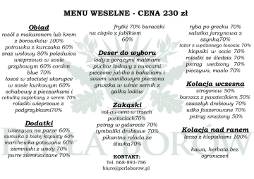 MENU WESELNE - CENA 230 zł Obiad rosół z makaronem lub krem z borowików 100% potrawka z kurczaka 60% zraz wołowy 80% polędwica wieprzowa w sosie grzybowym 60% cordon blue 70% łosoś w złocistej skorupce w sosie kurkowym 60% schabowy z pieczarkami i frytki 70% buraczki na ciepło z jabłkiem 60% tatar z wędzonego łososia 70% Deser do wyboru lody z gorącymi malinami puchar lodowy z owocami pieczone jabłko z bakaliami i sosem waniliowym pieczona gruszka w winie sernik z gałką lodów cebulką zapiekany z serem 70% roladki wieprzowe z podgrzybkami70% Dodatki warzywa na parze 60% surówka z białej kapusty 60% marchewka gotowana 60% ziemniaki z wody 70% purre ziemniaczane 70% ryba po grecku 70% sałatka jarzynowa z szynką70% Zakąski vol-au-vent w trzech postaciach70% pstrąg w galarecie 70% tymbaliki drobiowe 70% pikantna rolada ze śliwką70% KONTAKT: Tel. 668-893-786 [email protected] klopsiki w occie 70% roladki ze śledzia 70% pstrąg wędzony 70% pieczywo, masło 70% Kolacja wczesna strogonow 50% barszcz z pasztecikiem 50% szaszłyk drobiowy 70% udko faszerowane 70% pstrąg smażony 50% Kolacja nad ranem leczo z klopsikami 100% kawa, herbata bez ograniczeń