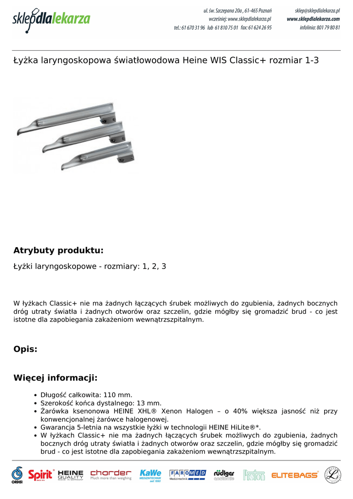 Łyżka laryngoskopowa światłowodowa Heine WIS Classic+ rozmiar 1-3 Atrybuty produktu: Łyżki laryngoskopowe - rozmiary: 1, 2, 3 W łyżkach Classic+ nie ma żadnych łączących śrubek możliwych do zgubienia, żadnych bocznych dróg utraty światła i żadnych otworów oraz szczelin, gdzie mógłby się gromadzić brud - co jest istotne dla zapobiegania zakażeniom wewnątrzszpitalnym. Opis: Więcej informacji: Długość całkowita: 110 mm. Szerokość końca dystalnego: 13 mm. Żarówka ksenonowa HEINE XHL® Xenon Halogen – o 40% większa jasność niż przy konwencjonalnej żarówce halogenowej. Gwarancja 5-letnia na wszystkie łyżki w technologii HEINE HiLite®*. W łyżkach Classic+ nie ma żadnych łączących śrubek możliwych do zgubienia, żadnych bocznych dróg utraty światła i żadnych otworów oraz szczelin, gdzie mógłby się gromadzić brud - co jest istotne dla zapobiegania zakażeniom wewnątrzszpitalnym. Gładki kształt pozwala uniknąć ostrych krawędzi i wgłębień, łyżki są proste do czyszczenia i sterylizacji. Te łyżki nigdy nie potrzebują konserwacji. Oba końce szerokiej wiązki włókien są ochronione - na cały czas użytkowania. Zasilanie z rękojeści bateryjnych 2,5V lub, dla zapewnienia więcej światła, rękojeści z baterią akumulatorową 3,5V. Kompatybilne ze wszystkimi rękojeściami w standardzie ISO 7376-3/EN 1819 (zielony standard zamka). Powered by TCPDF (www.tcpdf.org)