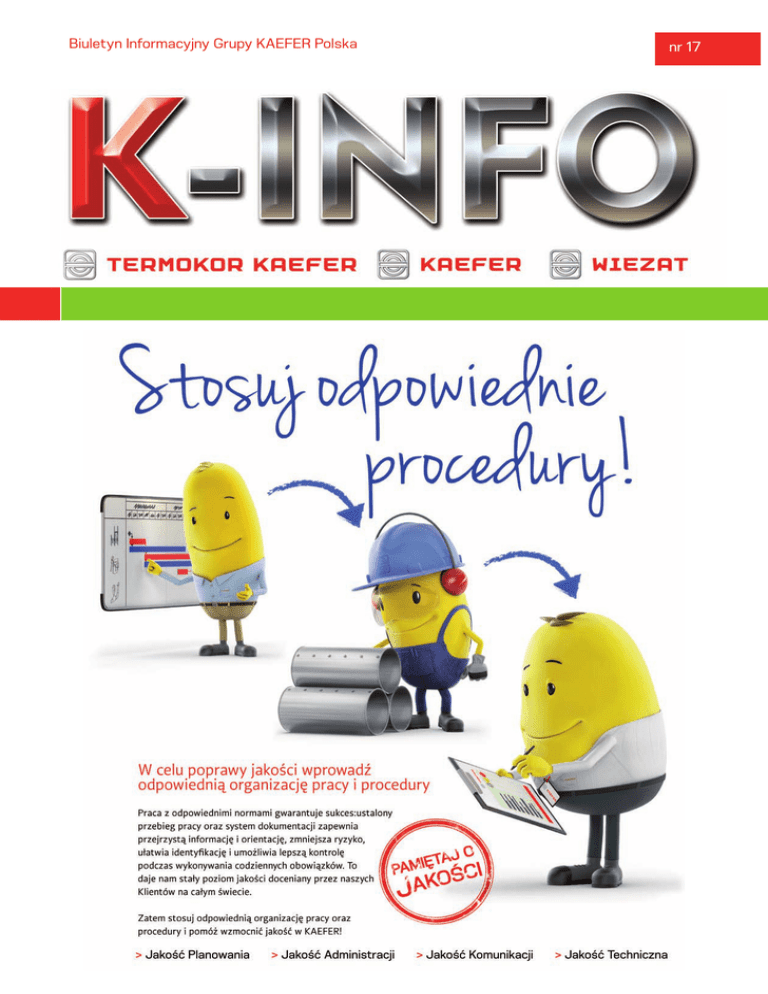 Biuletyn Informacyjny Grupy KAEFER Polska nr 17 Mariusz Łotowski Członek Zarządu, Dyrektor ds. Eksportu i Rozwoju Zmiany w Zarządzie KAEFER SA Na posiedzeniu Rady Nadzorczej 10 maja powołany został Zarząd nowej kadencji. Skład Zarządu został poszerzony do pięciu osób: Robert Skrobisz na stanowisku Prezesa Zarządu odpowiadać będzie za strategię oraz współpracę na poziomie regionalnym. Paweł Szajner został powołany na stanowisko Dyrektora Generalnego, Wiceprezesa Zarządu. Marcin Szularz na stanowisku Dyrektora Finansowego, Wiceprezesa Zarządu. Grzegorz Borkowski powołany został na stanowisko Wiceprezesa Zarządu, Dyrektora Operacyjnego. Mariusz Łotowski powołany został na stanowisko Członka Zarządu, Dyrektora ds. Eksportu i Rozwoju. Pan Mariusz Łotowski jest nową osobą w naszej firmie, ale prace izolacyjne, budownictwo przemysłowe nie są mu obce - w branży pracuje już ponad 16 lat. Chęć budowania, konstruowania towarzyszyła mu już od najmłodszych lat, te zamiłowania wspierał jego starszy brat - inżynier budownictwa. Później Pan Mariusz poszedł w jego ślady - ukończył Politechnikę Warszawską na Wydziale Inżynierii Lądowej, a także Studia Podyplomowe na kierunku Zarządzanie i Marketing w Szkole Głównej Handlowej w Warszawie. Po ukończeniu studiów wyjechał do Londynu, gdzie uczył się języka w szkole językowej i pracował. Miło wspomina kontakty z tamtejszą Polonią. Po zdobyciu doświadczeń poza granicami kraju postanowił jednak wrócić do Polski i pracować w zawodzie. Rozpoczął pracę w firmie BIS Izomar, gdzie miał możliwość podróżowania, zdobywania doświadczenia w międzynarodowym środowisku. W firmie przeszedł pełną ścieżkę kariery od pracy w Dziale Projektowym i Ofertowym, poprzez Kierownika Robót oraz Kierownika Projektu, aż po funkcję Dyrektora Oddziału Robót Termoizolacyjnych, Członka Zarządu. Z budów zagranicznych mile wspomina roczny pobyt w Halmstad w Szwecji, gdzie był Kierownikiem Robót na projekcie spalarni śmieci. Warto zauważyć, że ten kraj jest liderem w tym obszarze - posiada 32 spalarnie śmieci (w Polsce mamy jedną przy prawie czterokrotnie większej liczbie ludności). Był również prawie rok na budowie Lough Ree Power w Irlandii, gdzie pełnił funkcję Kierownika Robót, jak również Kierownika Projektu. Była to duża budowa - ponad 80 osób, na której miał możliwość poznawania innych kultur, ponieważ kierownictwo pochodziło z całej Europy: Finlandii, Niemiec, Austrii, Irlandii, Anglii i Turcji. Po powrocie zajął się eksportem - współpracą z Francją i Skandynawią, reaktywacją działań na terenie Niemiec. Ciekawym projektem we Francji był cykl modernizacji czterech jednostek kotłowych dla BBS (Babcock Borsig Service). Jego hobby to podróże, muzyka, film, sport rekreacyjny;). Jest żonaty, ma córkę Zosię (3l) i syna Kazimierza (8l). Życzymy Panu Mariuszowi powodzenia i sukcesów na nowym stanowisku. Kwestionariusz Prousta: Główna cecha mojego charakteru Empatia Co cenię najbardziej u przyjaciół Szczerość Moja główna wada Dążenie do 100% kontroli sytuacji Moje ulubione zajęcie Podróżowanie z rodziną Moje marzenie o szczęściu Zdrowie mojej rodziny Kim (lub czym) chciałbym być, gdybym nie był tym, kim jestem Architektem Słowa, których nadużywam Zdążę załatwić Ulubieni bohaterowie literaccy Alicja z Krainy Czarów Ulubieni bohaterowie życia codziennego Moja żona Czego nie cierpię ponad wszystko Manipulacji Moja dewiza Patrz w przyszłość z optymizmem! Myśl pozytywnie! Dar natury, który chciałbym posiadać Przewidywanie przyszłości WASZA REDAKCJA - PISZCIE DO NAS! Spis treści: 2 Aktualności 2 -4 Wieści z budów 4 - 10 Wieści z Grupy KAEFER 10 - 12 Po godzinach 13 - 19 Sylwia Krzesiak KAEFER SA ul. Padlewskiego 6, 41-800 Zabrze z dopiskiem: „K-INFO” e-mail: [email protected] Marta Malanowska-Błaszczyk KAEFER SA ul. Zglenickiego 52 A, 09-411 Płock z dopiskiem: „K-INFO” e-mail: [email protected] Aktualności Prezes Peter Hoedemaker Uczestnicy Konferencji Wizyta w Muzeum Energetyki Konferencja Kierownictwa Grupy KAEFER Polska W czerwcu odbyła się Konferencja Kierownictwa Grupy KAEFER Polska, na której zostały poruszone najważniejsze tematy dotyczące działalności naszej firmy, m.in. zaprezentowano wyniki finansowe spółek z Grupy KAEFER w Polsce. Prezes Robert Skrobisz przedstawił prezentację na temat roli KAEFER SA w Regionie Eastern Europe & Caspian. Był też gość specjalny - Peter Hoedemaker, Prezes koncernu KAEFER, który opowiedział o globalnych planach i działaniach Grupy KAEFER. 15 maja br. grupa słuchaczy Centrum Kształcenia Praktycznego i Ustawicznego w Zabrzu, która również kształci się w zawodzie związanym z naszą branżą, zwiedziła Muzeum Energetyki. Pan Janusz Chacia, nasz doświadczony kierownik budowy opowiedział o specyfice prac wykonywanych przez KAEFER. Już nieraz gościliśmy w Muzeum Energetyki w Łaziskach Górnych, każda wizyta głęboko zapada w pamięci zwiedzających. Zapraszamy! www.muzeumenergetyki.pl Wewnętrzne szkolenie Działu Prawnego W czerwcu w Warszawie odbyło się szkolenie zorganizowane przez Dział Prawny w osobach: Ilona Malon - Dyrektor ds. Prawnych oraz Anna Rut - Kierownik Działu Prawnego. Przedmiotem szkolenia był proces ofertowania usług oraz zawieranie umów. Omówiono zagrożenia wynikające z nieprawidłowych oraz niejasnych zapisów umów oraz procedurę „claimowania” (zarządzania roszczeniami). Uczestnikami szkolenia były osoby mające na co dzień styczność z przedmiotem wykładu. Kolejnym etapem szkolenia będą praktyczne warsztaty z „claim managementu”, które odbędą się jeszcze w tym roku. KAEFER SA - Liderem Biznesu Społecznie Odpowiedzialnego Miło nam poinformować, iż nasza firma otrzymała tytuł „Lidera Społecznej Odpowiedzialności”. Dnia 19 kwietnia br. w Gliwicach odbyła się konfe