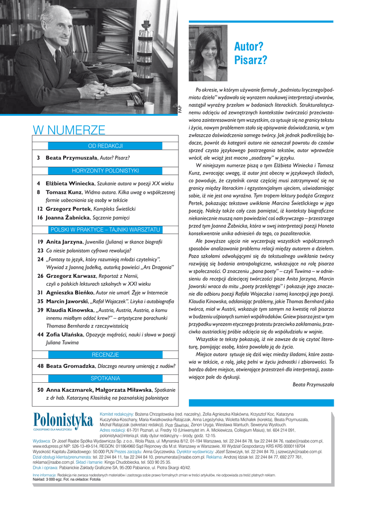 PAP Autor? Pisarz? W NUMERZE OD REDAKCJI 3 Beata Przymuszała, Autor? Pisarz? HORYZONTY POLONISTYKI 4 Elżbieta Winiecka, Szukanie autora w poezji XX wieku 8 Tomasz Kunz, Widmo autora. Kilka uwag o współczesnej formie uobecniania się osoby w tekście 12 Grzegorz Pertek, Kompleks Świetlicki 16 Joanna Żabnicka, Sączenie pamięci polski w praktyce – tajniki warsztatu 19 Anita Jarzyna, Juwenilia (Juliana) w tkance biografii 23 Co niesie polonistom cyfrowa rewolucja? 24 „Fantasy to język, który rozumieją młodzi czytelnicy”. Wywiad z Joanną Jodełką, autorką powieści „Ars Dragonia” 26 Grzegorz Karwasz, Reportaż z Narnii, czyli o polskich lekturach szkolnych w XXI wieku 31 Agnieszka Bieńko, Autor nie umarł. Żyje w Internecie 35 Marcin Jaworski, „Rafał Wojaczek”. Liryka i autobiografia 39 Klaudia Kinowska, „Austria, Austria, Austria, a komu innemu miałbym oddać krew?” – artystyczne porachunki Thomasa Bernharda z rzeczywistością 44 Zofia Ulańska, Opozycje mądrości, nauki i słowa w poezji Juliana Tuwima recenzje 48 Beata Gromadzka, Dlaczego neurony umierają z nudów? spotkania 50 Anna Kaczmarek, Małgorzata Miławska, Spotkanie z dr hab. Katarzyną Kłosińską na poznańskiej polonistyce Po okresie, w którym używanie formuły „podmiotu lirycznego/podmiotu dzieła” wydawało się wyrazem naukowej interpretacji utworów, nastąpił wyraźny przełom w badaniach literackich. Strukturalistycznemu odcięciu od zewnętrznych kontekstów twórczości przeciwstawiono zainteresowanie tym wszystkim, co sytuuje się na granicy tekstu i życia, nowym problemem stało się opisywanie doświadczania, w tym zwłaszcza doświadczenia samego twórcy. Jak jednak podkreślają badacze, powrót do kategorii autora nie oznaczał powrotu do czasów sprzed czysto językowego postrzegania tekstów, autor wprawdzie wrócił, ale wciąż jest mocno „osadzony” w języku. W niniejszym numerze piszą o tym Elżbieta Winiecka i Tomasz Kunz, zwracając uwagę, iż autor jest obecny w językowych śladach, co powoduje, że czytelnik coraz częściej musi zatrzymywać się na granicy między literackim i egzystencjalnym ujeciem, uświadamiając sobie, iż nie jest ona wyraźna. Tym tropem lektury podąża Grzegorz Pertek, pokazując tekstowe uwikłanie Marcina Świetlickiego w jego poezję. Należy także cały czas pamiętać, iż konteksty biograficzne niekoniecznie muszą nam powiedzieć coś odkrywczego – przestrzega przed tym Joanna Żabnicka, która w swej interpretacji poezji Honeta konsekwentnie unika odniesień do tego, co pozaliterackie. Ale powyższe ujęcia nie wyczerpują wszystkich współczesnych sposobów analizowania problemu relacji między autorem a dziełem. Poza szkołami odwołującymi się do tekstualnego uwikłania twórcy rozwijają się badania antropologiczne, wskazujące na rolę pisarza w społeczności. O znaczeniu „pana poety” – czyli Tuwima – w odniesieniu do recepcji dziecięcej twórczości pisze Anita Jarzyna, Marcin Jaworski wraca do mitu „poety przeklętego” i pokazuje jego znaczenie dla odbioru poezji Rafała Wojaczka i samej koncepcji jego poezji. Klaudia Kinowska, odsłaniając problemy, jakie Thomas Bernhard jako twórca, miał w Austrii, wskazuje tym samym na kwestię roli pisarza w budzeniu uśpionych sumień współrodaków. Gniew pisarza jest w tym przypadku wyrazem etycznego protestu przeciwko zakłamaniu, przeciwko austriackiej próbie odcięcia się do współudziału w wojnie. Wszystkie te teksty pokazują, iż nie zawsze da się czytać literaturę, pomijając osobę, która powołała ją do życia. Miejsce autora sytuuje się dziś więc miedzy śladami, które zostawia w tekście, a rolą, jaką pełni w życiu jednostki i zbiorowości. To bardzo dobre miejsce, otwierające przestrzeń dla interpretacji, zostawiające pole do dyskusji. Beata Przymuszała Polonistyka Komitet redakcyjny: Bożena Chrząstowska (red. naczelny), Zofia Agnieszka Kłakówna, Krzysztof Koc, Katarzyna Kuczyńska-Koschany, Maria Kwiatkowska-Ratajczak, Anna Legeżyńska, Wioletta Michałek (korekta), Beata Przymuszała, Michał Ratajczak (sekretarz redakcji), Piotr Śliwiński, Zenon Uryga, Wiesława Wantuch, Seweryna Wysłouch. czasopismo dla nauczycieli Adres redakcji: 61-701 Poznań, ul. Fredry 10 (Uniwersytet im. A. Mickiewicza, Collegium Maius), tel. 604 214 091, [email protected], stały dyżur redakcyjny – środy, godz. 12-15. Wydawca: Dr Josef Raabe Spółka Wydawnicza Sp. z o.o., Wola Plaza, ul. Młynarska 8/12, 01-194 Warszawa, tel. 22 244 84 78, fax 22 244 84 76, [email protected], www.edupress.pl NIP: 526-13-49-514, REGON: 011864960 Sąd Rejonowy dla M.st. Warszawy w Warszawie, XII Wydział Gospodarczy KRS KRS 0000118704 Wysokość Kapitału Zakładowego: 50.000 PLN Prezes zarządu: Anna Gryczewska. Dyrektor wydawniczy: Józef Szewczyk, tel. 22 244 84 70, j.szewczyk@raabe.com.pl. Dział obsługi klienta/prenumerata: tel. 22 244 84 11, fax 22 244 84 10, [email protected]. Reklama: Andrzej Idziak tel. 22 244 84 77, 692 277 761, reklama@raabe.com.pl. Skład i łamanie: Kinga Chudobiecka, tel. 503 90 25 35. Druk i oprawa: Pabianickie Zakłady Graficzne SA, 95-200 Pabianice, ul. Piotra Skargi 40/42. Inne informacje: Redakcja nie zwraca nadesłanych materiałów i zastrzega sobie prawo formalnych zmian w treści artykułów, nie odpowiada za treść płatnych reklam. Nakład: 3 000 egz. Fot. na okładce: Fotolia