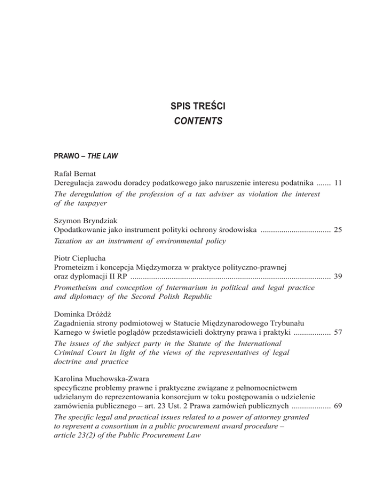 SPIS TREŚCI CONTENTS PRAWO – THE LAW Rafał Bernat Deregulacja zawodu doradcy podatkowego jako naruszenie interesu podatnika . ...... 11 The deregulation of the profession of a tax adviser as violation the interest of the taxpayer Szymon Bryndziak Opodatkowanie jako instrument polityki ochrony środowiska ................................... 25 Taxation as an instrument of environmental policy Piotr Cieplucha Prometeizm i koncepcja Międzymorza w praktyce polityczno-prawnej oraz dyplomacji II RP .................................................................................................. 39 Prometheism and conception of Intermarium in political and legal practice and diplomacy of the Second Polish Republic Dominka Dróżdż Zagadnienia strony podmiotowej w Statucie Międzynarodowego Trybunału Karnego w świetle poglądów przedstawicieli doktryny prawa i praktyki . ................. 57 The issues of the subject party in the Statute of the International Criminal Court in light of the views of the representatives of legal doctrine and practice Karolina Muchowska-Zwara specyficzne problemy prawne i praktyczne związane z pełnomocnictwem udzielanym do reprezentowania konsorcjum w toku postępowania o udzielenie zamówienia publicznego – art. 23 Ust. 2 Prawa zamówień publicznych . .................. 69 The specific legal and practical issues related to a power of attorney granted to represent a consortium in a public procurement award procedure – article 23(2) of the Public Procurement Law 6 Spis treści Aleksandra Surma Dopuszczalność poddania do rozpoznania sądowi polubownemu sporów dotyczących uchylenia lub stwierdzenia nieważności uchwał organów spółek kapitałowych .................................................................................................... 79 The admissibility of settlement of the disputes on setting aside or annulment of the company bodies’ resolutions by the arbitral tribunal Péter Tilk The main changes in the system of local governments in Hungary after the commencement of the Fundamental Law .............................................................. 95 Główne zmiany w systemie samorządu terytorialnego na Węgrzech po nowelizacji Ustawy Zasadniczej. Wojciech Robaczyński glosa do wyroku Sądu Najwyższego z dnia 23 maja 2013 r. (I CSK 515/12) . ......... 115 Recenzje Konrad Składowski, System rządów w Republice Chorwacji (Dariusz Górecki)........................................................................................................ 127 Sławomir Godek, III Statut Litewski w dobie porozbiorowej (Ireneusz Jakubowski)................................................................................................ 133 EKONOMIA – THE ECONOMICS Joanna Działo Stawki podatków dochodowych od osób fizycznych i prawnych w krajach Unii Europejskiej i wybranych rajach podatkowych a bezpośrednie inwestycje zagraniczne .............................................................................................. 139 Personal and corporate income tax rates in the European Union and selected tax havens and foreign direct investment Anita Fajczak-Kowalska, Jan Więcek Zmienne demograficzne w modelach popytu konsumpcyjnego . .............................. 157 Demographic variables in models of consumer demand Tomasz Grabia Czy inflacja w Polsce jest zjawiskiem czysto pieniężnym? ...................................... 179 Is inflation in Poland a purely money phenomenon? Spis treści 7 Magdalena Kludacz Zasady wyceny świadczeń zdrowotnych we francuskim systemie ochrony zdrowia ........................................................................................................ 193 The analysis of valuation principles of medical services in the French health care system Paweł Kubiak Zasiłki dla bezrobotnych a płace progowe i płace uzyskane ..................................... 207 Unemployment benefits, reservation wages and wages obtained Eugeniusz Kwiatkowski, Leszek Kucharski Dekompozycja zmian bezrobocia w krajach Europy Środkowo-Wschodniej w latach 2004–2013 ................................................................................................... 223 Decomposition of changes in unemployment in the countries of Central and Eastern Europe in the years 2004–2013 Katarzyna Mroczek, Tomasz Tokarski Efekt grawitacyjny i techniczne uzbrojenie pracy a zróżnicowanie wydajności pracy w krajach UE . .................................................................................................. 245 Influence of gravity effect and capital-labour ratio on the diversity of labour productivity in EU countries Marek Piotrowski, Anna Organiściak-Krzykowska Rola cudzoziemców na rynku pracy w Polsce . ......................................................... 261 The role of foreign workers on the labour market in Poland Radosław Piwowarski Strategie wyborcze w świetle wybranych teoretycznych modeli głosowania ........... 275 Election strategies in the light of chosen voting models Sylwia Roszkowska Regionalne zróżnicowanie stóp zwrotu z wykształcenia w Europie ......................... 289 Regional diversification of returns to education in Europe Małgorzata Siemionek, Anna Siemionek Strategiczna karta wyników jako narzędzie wspomagające nadzór korporacyjny ..... 301 Balanced scorecard as a tool to support corporate governance 8 Spis treści Janusz Świerkocki Produktywność i internacjonalizacja przedsiębiorstw w województwie łódzkim. Implikacje dla polityki gospodarczej ......................................................................... 313 Productivity and internationalization of enterprises in the Łodz Province. Implications for economic policy Agata Szymańska Efekty polityki fiskalnej w warunkach niskich stóp procentowych – przegląd literatury ...................................................................................................... 331 Effects of fiscal policy at