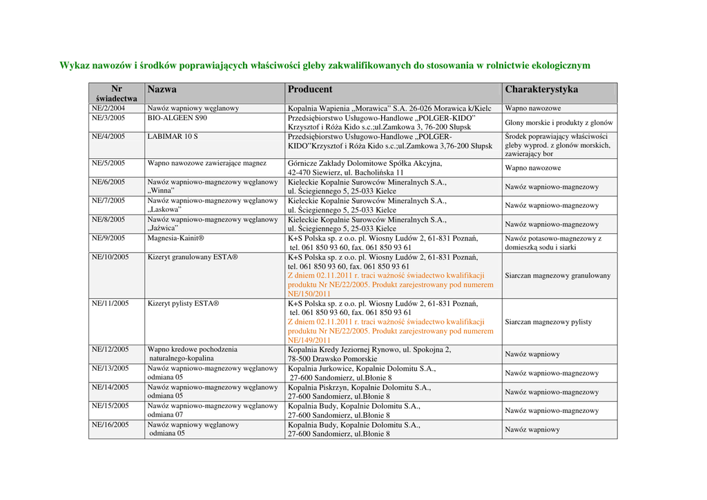 Wykaz nawozów i środków poprawiających właściwości gleby zakwalifikowanych do stosowania w rolnictwie ekologicznym Nr Nazwa Producent Charakterystyka NE/2/2004 NE/3/2005 Nawóz wapniowy węglanowy BIO-ALGEEN S90 Wapno nawozowe NE/4/2005 LABIMAR 10 S Kopalnia Wapienia „Morawica” S.A. 26-026 Morawica k/Kielc Przedsiębiorstwo Usługowo-Handlowe „POLGER-KIDO” Krzysztof i Róża Kido s.c.;ul.Zamkowa 3, 76-200 Słupsk Przedsiębiorstwo Usługowo-Handlowe „POLGERKIDO”Krzysztof i Róża Kido s.c.;ul.Zamkowa 3,76-200 Słupsk NE/5/2005 Wapno nawozowe zawierające magnez NE/6/2005 NE/9/2005 Nawóz wapniowo-magnezowy węglanowy „Winna” Nawóz wapniowo-magnezowy węglanowy „Laskowa” Nawóz wapniowo-magnezowy węglanowy „Jaźwica” Magnesia-Kainit® NE/10/2005 Kizeryt granulowany ESTA® świadectwa NE/7/2005 NE/8/2005 NE/11/2005 NE/12/2005 NE/13/2005 NE/14/2005 NE/15/2005 NE/16/2005 Kizeryt pylisty ESTA® Wapno kredowe pochodzenia naturalnego-kopalina Nawóz wapniowo-magnezowy węglanowy odmiana 05 Nawóz wapniowo-magnezowy węglanowy odmiana 05 Nawóz wapniowo-magnezowy węglanowy odmiana 07 Nawóz wapniowy węglanowy odmiana 05 Górnicze Zakłady Dolomitowe Spółka Akcyjna, 42-470 Siewierz, ul. Bacholińska 11 Kieleckie Kopalnie Surowców Mineralnych S.A., ul. Ściegiennego 5, 25-033 Kielce Kieleckie Kopalnie Surowców Mineralnych S.A., ul. Ściegiennego 5, 25-033 Kielce Kieleckie Kopalnie Surowców Mineralnych S.A., ul. Ściegiennego 5, 25-033 Kielce K+S Polska sp. z o.o. pl. Wiosny Ludów 2, 61-831 Poznań, tel. 061 850 93 60, fax. 061 850 93 61 K+S Polska sp. z o.o. pl. Wiosny Ludów 2, 61-831 Poznań, tel. 061 850 93 60, fax. 061 850 93 61 Z dniem 02.11.2011 r. traci ważność świadectwo kwalifikacji produktu Nr NE/22/2005. Produkt zarejestrowany pod numerem NE/150/2011 K+S Polska sp. z o.o. pl. Wiosny Ludów 2, 61-831 Poznań, tel. 061 850 93 60, fax. 061 850 93 61 Z dniem 02.11.2011 r. traci ważność świadectwo kwalifikacji produktu Nr NE/22/2005. Produkt zarejestrowany pod numerem NE/149/2011 Kopalnia Kredy Jeziornej Rynowo, ul. Spokojna 2, 78-500 Drawsko Pomorskie Kopalnia Jurkowice, Kopalnie Dolomitu S.A., 27-600 Sandomierz, ul.Błonie 8 Kopalnia Piskrzyn, Kopalnie Dolomitu S.A., 27-600 Sandomierz, ul.Błonie 8 Kopalnia Budy, Kopalnie Dolomitu S.A., 27-600 Sandomierz, ul.Błonie 8 Kopalnia Budy, Kopalnie Dolomitu S.A., 27-600 Sandomierz, ul.Błonie 8 Glony morskie i produkty z glonów Środek poprawiający właściwości gleby wyprod. z glonów morskich, zawierający bor Wapno nawozowe Nawóz wapniowo-magnezowy Nawóz wapniowo-magnezowy Nawóz wapniowo-magnezowy Nawóz potasowo-magnezowy z domieszką sodu i siarki Siarczan magnezowy granulowany Siarczan magnezowy pylisty Nawóz wapniowy Nawóz wapniowo-magnezowy Nawóz wapniowo-magnezowy Nawóz wapniowo-magnezowy Nawóz wapniowy NE/17/2005 Nawóz wapniowy węglanowy odmiana 04 NE/18/2005 EPSO Top NE/19/2005 Patentkali® NE/20/2005 Hortisul® NE/21/2005 Siarczan potasu pylisty NE/22/2005 NE/23/2005 Siarczan potasu granulowany NE/24/2005 Wapno nawozowe „Eko-Calcium” RADKOWIT NE/25/2005 PRÓCHNICA EKO NE/26/2005 NE/27/2005 SADZVIT EKO NE/28/2005 Nawóz wapniowyPN-C-87007-2-04-50 LABICUPER roztwór nawozowy miedzi NE/29/2005 HB-101 Kopalnia Budy, Kopalnie Dolomitu S.A., 27-600 Sandomierz, ul.Błonie 8 K+S Polska sp. z o.o. pl. Wiosny Ludów 2, 61-831 Poznań, tel. 061 850 93 60, fax. 061 850 93 61 K+S Polska sp. z o.o. pl. Wiosny Ludów 2, 61-831 Poznań, tel. 061 850 93 60, fax. 061 850 93 61 K+S Polska sp. z o.o. pl. Wiosny Ludów 2, 61-831 Poznań, tel. 061 850 93 60, fax. 061 850 93 61 K+S Polska sp. z o.o. pl. Wiosny Ludów 2, 61-831 Poznań, tel. 061 850 93 60, fax. 061 850 93 61 Z dniem 02.11.2011 r. traci ważność świadectwo kwalifikacji produktu Nr NE/22/2005. Produkt zarejestrowany pod numerem NE/148/2011 K+S Polska sp. z o.o. pl. Wiosny Ludów 2, 61-831 Poznań, tel. 061 850 93 60, fax. 061 850 93 61 Z dniem 02.11.2011 r. traci ważność świadectwo kwalifikacji produktu Nr NE/22/2005. Produkt zarejestrowany pod numerem NE/151/2011 Kopalnia Węgla Brunatnego „Bełchatów”, S.A. w Rogowcu, 97-400 Bełchatów. tel. 044 7373000 LAFARGE KRUSZYWA Sp.z o.o., Kopalnia Dolomitu Radkowice, 26-026 Morawica k/Kielc, tel.041 3117571 Host International Sp. z o.o., Przeds. Rolno-Ekologiczne, Cedry Małe Kolonia, 83-020 Cedry Wielkie, tel. 058 6836308 Z dniem 01.03.07 traci ważność świadectwo kwalifikacji produktu Nr NE/25/2005. Produkt zarejestrowany pod numerem NE/123/2010 Host International Sp. z o.o., Przedsiębiorstwo RolnoEkologiczne, Cedry Małe Kolonia, 83-020 Cedry Wielkie, tel. 058 6836308, www.hostint.com.pl Z dniem 10.01.2014 traci ważność świadectwo kwalifikacji produktu Nr NE/26/2005. Produkt zarejestrowany pod numerem NE/240/2014 „Lhoist Bukowa” Sp. z o.o., Bukowa, ul. Osiedlowa 10, 29-105 Krasocin Przedsiębiorstwo Usługowo-Handlowe „POLGERKIDO”Krzysztof i Róża Kido s.c.;ul.Zamkowa 3, 76-200 Słupsk „F.I.S. IMPEX GROUP” sp. z o.o.; 55-140 Żmigród, ul. Przemysłowa 2 Nawóz wapniowy Siarczan magnezowy Siarczan potasowy z magnezem Siarczan potasowy Siarczan potasu pylisty Siarczan potasu granulowany Nawóz wapniowy Nawóz wapniowo-magnezowy węglanowy Środek poprawiający właściwości gleby Środek poprawiający właściwości gleby Nawóz wapniowy Nawóz zawierający miedź Środek poprawiający właściwości gleby; mieszanina soków roślinnych NE/30/2005 ZIMOWY HUMVIT EKO NE/31/2005 BactoFil NE/32/2005 NE/33/2005 Nawóz wapniowy –PN – C – 87007 – 2 – 04 – 50 PRP SOL NE/34/2005 BIOJODIS-3 NE/35/2005 STAGRO HUMUS NE/36/2005 Host International Sp. z o.o., Przedsiębiorstwo RolnoEkologiczne, Cedry Małe Kolonia, 83-020 Cedry Wielkie, tel. 058 6836308, www.hostint.com.pl Z dniem 10.01.14 traci ważność świadectwo kwalifikacji produktu Nr NE/30/2005. Produkt zarejestrowany pod numerem NE/241/2014 P.P.H.U. BIBORKA Hartai Zoltan Janosne, Oddział 9