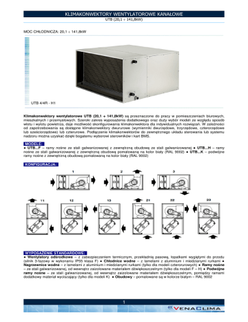 KLIMAKONWEKTORY WENTYLATOROWE KANAŁOWE UTB (20,1 ÷ 141,8kW) MOC CHŁODNICZA: 20,1 ÷ 141,8kW UTB 4/4R - H1 Klimakonwektory wentylatorowe UTB (20,1 ÷ 141,8kW) są przeznaczone do pracy w pomieszczeniach biurowych, mieszkalnych i przemysłowych. Szeroki zakres wyposażenia dodatkowego oraz duży wybór modeli ze względu sposób wlotu i wylotu powietrza, daje możliwość skonfigurowania klimakonwektora dla indywidualnych rozwiązań. W zależności od zapotrzebowania są dostępne klimakonwektory dwururowe (wymienniki dwurzędowe, trzyrzędowe, czterorzędowe lub sześciorzędowe) lub czterurowe. Podłączenie klimakonwektorów do zewnętrznego układu sterowania lub systemu nadzoru można uzyskać dzięki bogatemu wyborowi sterowników i kart BMS. MODELE: ● UTB...F – ramy nośne ze stali galwanizowanej z zewnętrzną obudową ze stali galwanizowanej ● UTB...H – ramy nośne ze stali galwanizowanej z zewnętrzną obudową pomalowaną na kolor biały (RAL 9002) ● UTB...K – podwójne ramy nośne z zewnętrzną obudową pomalowaną na kolor biały (RAL 9002) KONFIGURACJA: WYPOSAŻENIE STANDARDOWE: ● Wentylatory odśrodkowe – z zabezpieczeniem termicznym, przekładnią pasową, łopatkami wygiętymi do przodu (silnik 3-fazowy w wykonaniu IP55 klasa F) ● Chłodnice wodne – z lamelami z aluminium i miedzianymi rurkami ● Nagrzewnice wodne – z lamelami z aluminium i miedzianymi rurkami (tylko dla modeli czterorurowych) ● Ramy nośne – ze stali galwanizowanej, od wewnątrz zaizolowane materiałem dźwiękoszczelnym (tylko dla modeli F – H) ● Podwójne ramy nośne – ze stali galwanizowanej, od wewnątrz zaizolowane materiałem dźwiękoszczelnym, pomiędzy ramami dodatkowy materiał wyciszający (tylko dla modeli K) ● Obudowy – pomalowane są w kolorze białym – RAL 9002 1 KLIMAKONWEKTORY WENTYLATOROWE KANAŁOWE UTB (20,1 ÷ 141,8kW) OPCJE WYPOSAŻANIA DODATKOWEGO: ● BMS-BN – karta BMS z protokołem komunikacyjnym BACNET ● BMS-MB – karta BMS z protokołem komunikacyjnym MODBUS ● BMS-MX – karta BMS z protokołem komunikacyjnym MAXINET ● C90 – kanał wentylacyjny 90˚ ● CC – skrzynka rozprężna ● CCA – kształtka wentylacyjna ● CD – regulator naścienny do współpracy z z kartą BMS (opcje CD1 – CD2) ● CDK – kanał wentylacyjny ● CFA – sekcja filtra EU3 ● CFE – sekcja filtrów EU5 i EU7 ● CFD – sekcja filtrów EU3 i EU5 ● CFO – sekcja filtra EU5 ● CFT – sekcja filtra EU7 ● CGF – kratka zabezpieczająca przed warunkami atmosferycznymi z filtrem EU3 ● CGO – kratka zabezpieczająca przed warunkami atmosferycznymi z filtrem EU5 ● CGR – kratka zabezpieczająca przed warunkami atmosferycznymi ● CME – sekcja nagrzewnicy gazowej ● CR – regulator naścienny (opcje CR1, CR2, CR11) ● CRA – seckja nagrzewnicy wodnej ● CRE – sekcja nagrzewnicy elektrycznej ● CSL – sekcja tłumika akustycznego ● CU – sekcja z tacą ociekową (do zamontowania lanc nawilżacza parowego) ● CV – sekcja dodatkowego wentylatora (opcje CV-F1 – CV-F2 - CV-F3 – CV-H1 – CV-H2 – CV-H3 – CV-K1 – CV-K2 – CVK3) ● GR – kratka z ruchomymi żaluzjami (opcje G1R – G2R) ● KSF – kanał odprowadzania spalin ● MOT – siłownik przepustnicy powietrza świeżego ● PUL – koło pasowe z paskiem klinowym ● SND-A – czujnik temperatury powietrza dla kart BMS ● SND-W – czujnik temperatury wody dla kart BMS (opcje SND-W1, SND-W2) ● SW-MX – centralny system nadzoru dla kart BMS z protokołem komunikacyjnym MAXINET (bez limitu ilości klimakonwektorów) ● ST – przepustnica powietrza ● TP – daszki zabezpieczające (opcje TPU – TPA) ● UC-MX – centralny system nadzoru dla kart BMS z protokołem komunikacyjnym MAXINET (dla maksymalnie 60 klimakonwektorów) ● ZC – szyny montażowe (opcje ZCA – ZCU) 2