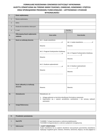 FORMULARZ ROZEZNANIA CENOWEGO DOTYCZĄCY WYKONANIA AUDYTU OŚWIETLENIA NA TERENIE GMINY ŻUKOWO, CHMIELNO, SOMONINO I STĘŻYCA ORAZ SPORZĄDZENIE PROGRAMU FUNKCJONALNO – UŻYTKOWEGO I STUDIUM WYKONALNOŚCI I. Dane wykonawcy 1 Nazwa wykonawcy 2 Adres 3 Osoba do kontaktów roboczych 4 E-mail II. Oferowany koszt wykonania zadania III. Koszt za realizację zlecenia: Tel./fax Cena netto Ad. 1. Audyt oświetlenia ……………………………………………………zł Słownie: …………………………………………………… Cena brutto Ad. 1. Audyt oświetlenia ……………………zł Słownie: …………………………………………………………… Ad. 2. Program Funkcjonalno-Użytkowy ………………………………………………….. zł Ad. 2. Program Funkcjonalno-Użytkowy ……………………………… zł Słownie: Słownie: ………………………………………………………. ……………………………………………………………. Ad. 3. Studium wykonalności …………………………………………………...zł Ad. 3. Studium wykonalności ……………………..zł Słownie: Słownie: ………………………………………………………. ……………………………………………………………. Koszt całkowity za realizację zlecenia: IV. Oświadczenie Słownie: Słownie: Oświadczam, że: 1. Usługę wykonam w terminie określonym formularzu rozeznania 2. Zapoznałem się z opisem przedmiotu zamówienia i nie wnoszę żadnych zastrzeżeo. V Uwagi Wykonawcy: VI. Przedmiot zamówienia: 1. Kod CPV 71320000-7 Usługi inżynieryjne w zakresie projektowania 71314300-6 Usługi doradcze w zakresie wydajności energetycznej. 2. Zakres prac: I. AUDYT OŚWIETLENIA: Audyt oświetlenia ma za zadanie określenie rzeczywistych parametrów oświetlenia będącego majątkiem gmin: Żukowo, Chmielno, Somonino, Stężyca, ma dad pogląd na stan oświetlenia i jego zgodnośd z obowiązującymi normami oraz byd podstawą do zaplanowania remontów i modernizacji oświetlenia zgodnie z dokumentacją konkursową ogłoszoną przez UM Województwa Pomorskiego dla Działania 10.4 w ramach RPO WP na lata 2014-2020 (Regulamin Konkursu nr RPPM.10.04.00-IZ.00-22001/16. Do pobrania na stronie www.rpo.pomorskie.eu). Z opracowania musi jednoznacznie wynikad: wysokośd oszczędności finansowych, szacowany czas zwrotu poniesionych nakładów; wysokośd oszczędności w zakresie zużycia energii elektrycznej przez poszczególne ciągi oświetleniowe. Szczegółowy zakres prac: 1. Inwentaryzacja/ weryfikacja stanu faktycznego, ilościowa i parametrów technicznych, uwzględniając m.in.: ilośd opraw, rodzaj opraw, typ źródła światła, moc; ilośd słupów oświetleniowych, rodzaj słupów oświetleniowych, wysokośd, opis wysięgników (nachylenie, długośd). 2. Wykonanie pomiarów oświetleniowych oddzielnie dla każdego ciągu komunikacyjnego/ ogólnodostępnych przestrzeni publicznych wraz z wykonaniem pomiarów rzeczywistego zużycia energii i natężenia oświetlenia. 3. Ustalenie aktualnej klasy oświetleniowej i badanie spełnienia norm oświetlenia (luminacja lub natężenie oświetlenia, prowadzenie wzrokowe, barwa światła, oddawanie barw). 4. Analiza energetyczna istniejącego oświetlenia: strona ekonomiczna, ekologiczna, spełnienie norm; macierzowe ujęcie wszystkich elementów infrastruktury oświetleniowej, wykazanie zakresu infrastruktury, rodzajów wykorzystywanych elementów, pobory mocy oraz zgodnośd stanu faktycznego z planowanym. 5. Dobór optymalnych rozwiązao, tj. dobór źródeł światła spełniających normy oraz parametry wymagane przez zamawiającego spełniających założenia audytu. 6. Do opisu każdej audytowanej ulicy, na terenie gminy powinna zostad dołączona fotografia oprawy i słupa, który jest przedmiotem audytu. 7. Należy wykonad mapę elektroniczną oświetlenia ulicznego znajdującego się na terenie gminy. Każdy punkt oświetleniowy/słup musi zostad naniesiony na mapę z uwzględnieniem atrybutów (wysokośd słupa, szerokośd jezdni, klasa oświetleniowa jezdni, odległośd od krawędzi jezdni, moc, rodzaj oprawy, moc źródła światła, rodzaj linii (napowietrzna/kablowa). Mapa powinna umożliwiad edytowalnośd tekstu oraz wprowadzanie zmian w ilości i charakterystyce punktów oświetleniowych. Mapa musi byd zintegrowana z bazą danych zawierającą informacje o wszystkich słupach. Program do obsługi mapy musi umożliwiad nie tylko wyświetlenie mapy i dostęp do bazy danych ale musi pozwalad na dokonywanie zmian i segregowanie słupów według określonej wytycznej. 8. Audyt powinien zawierad propozycję modernizacji oświetlenia z uwzględnieniem nowoczesnego systemu sterowania i zarządzania oświetleniem, który powinien byd otwarty w zakresie formatów przesyłanych danych i protokołów komunikacyjnych wykorzystywanych pomiędzy elementami systemu, zgodnie z dokumentem Komisji Europejskiej "Europejskie Ramy Interoperacyjności ver. 1.0” i umożliwiał płynną regulację mocy każdej lampy osobno jak i w grupach: w zakresie co najmniej 50-100% mocy dla lamp HPS, MH poprzez interfejs 1-10V lub DALI i w zakresie co najmniej 30-100% mocy dla lamp LED poprzez interfejs 1-10V lub DALI 9. Audyt powinien zawierad sugestie związane z kształtowaniem przez gminy polityki oświetleniowej (relacje z lokalnym przedsiębiorstwem energetycznym, sposoby wykorzystania oświetlenia). 10. Audyt powinien wskazad miejsca na terenie gminy, gdzie oświetlenie powinno zostad domontowane. 11. Audyt oraz Program funkcjonalno-użytkowy powinny zostad sporządzone w taki sposób aby opis z nich wynikający jednoznacznie wskazywał, której gminy dotyczy. 12. Efekt wizualny i estetyczny – proponowane rozwiązania: a) trójwariantowe propozycje rozwiązao technologicznych (inne możliwe sposoby osiągnięcia zakładanych rezultatów) umożliwiające zm
