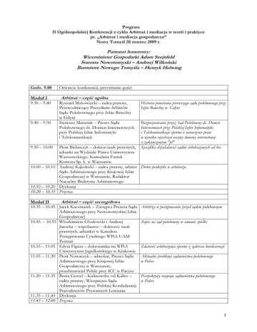 Program II Ogólnopolskiej Konferencji z cyklu ArbitraŜ i mediacja w teorii i praktyce pt. „ArbitraŜ i mediacja gospodarcza” Nowy Tomyśl 28 marzec 2009 r. Patronat honorowy: Wiceminister Gospodarki Adam Szejnfeld Starosta Nowotomyski – Andrzej Wilkoński Burmistrz Nowego Tomyśla – Henryk Helwing Godz. 9.00 Moduł I 9.30 – 9.40 9.40 – 9.50 Otwarcie konferencji, przywitanie gości ArbitraŜ – część ogólna Ryszard Makowiecki – radca prawny, Przewodniczący Prezydium Arbitrów Sądu Polubownego przy Izbie Bawełny w Gdyni Ireneusz Matusiak – Prezes Sądu Polubownego ds. Domen Internetowych przy Polskiej Izbie Informatyki i Telekomunikacji 9.50 – 10.00 Historia powstania pierwszego sądu polubownego przy Izbie Bawełny w Gdyni Rozpoznawanie przez Sąd Polubowny ds. Domen Internetowych przy Polskiej Izbie Informatyki i Telekomunikacji sporów o naruszenie praw w wyniku rejestracji nazwy domeny internetowej z zakończeniem "pl" Specyfika działalności sądów arbitraŜowych ad hoc Piotr Bielarczyk – doktor nauk prawnych, adiunkt na Wydziale Prawa Uniwersytetu Warszawskiego, Kancelaria Furtek Komosa Sp. k. w Warszawie 10.00 – 10.10 Andrzej Kąkolecki – radca prawny, arbiter Dobre praktyki w arbitraŜu Sądu ArbitraŜowego przy Krajowej Izbie Gospodarczej w Warszawie, Redaktor Naczelny Biuletynu ArbitraŜowego 10.10 – 10.20 Dyskusja 10.20 – 10.35 Przerwa Moduł II ArbitraŜ – część szczegółowa 10.35 – 10.45 Jacek Kaczmarek – Zastępca Prezesa Sądu ArbitraŜowego przy Nowotomyskiej Izbie Gospodarczej 10.45. – 10.55 Włodzimierz Głodowski i Andrzej Jarocha – współautor – doktorzy nauk prawnych, adiunkci w Katedrze Postępowania Cywilnego WPiA UAM Poznań 10.55 – 11.05 Edyta Figura – doktorantka na WPiA Uniwersytetu Jagiellońskiego w Krakowie 11.05 – 11.20 Piotr Nowaczyk – adwokat, Prezes Sądu ArbitraŜowego przy Krajowej Izbie Gospodarczej w Warszawie, przedstawiciel Polski przy ICC w ParyŜu 11.20 – 11.35 Beata Gessel – Kalinowska vel Kalisz – radca prawny, Wiceprezes Sądu ArbitraŜowego przy Polskiej Konfederacji Pracodawców Prywatnych Lewiatan 11.35 – 11.45 Dyskusja 11.45 – 12.00 Przerwa Arbitrzy w postępowaniu przed sądem polubownym Zapis na sąd polubowny w umowie spółki Zdatność arbitraŜowa sporów z zakresu konkurencji Aktualne problemy sądownictwa polubownego w Polsce Perspektywy rozwoju sądownictwa polubownego w Polsce 1 Moduł III Mediacja 12.00 – 12.20 Maciej Bobrowicz – radca prawny, Prezes Krajowej Izby Radców Prawnych 12.20 – 12.40 Sylwester Pieckowski - adwokat, kancelaria Chadbourne & Parke, Prezes Polskiego Stowarzyszenia Sądownictwa Polubownego, I Wiceprezes Sądu ArbitraŜowego przy Polskiej Konfederacji Pracodawców Prywatnych Lewiatan 12.40 – 12.50 Aleksandra Petrus – Schmidt – Wiceprezes Polskiego Stowarzyszenia ArbitraŜu i Mediacji 12.50 – 13.00 Jolanta Maślikowska – mediator sądowy, doktorantka na Wydziale Nauk Społecznych Uniwersytetu Wrocławskiego 13.00 – 13.10 Grzegorz Frączek – Dyrektor Ośrodka Mediacji Fundacji Wydziału Prawa i Administracji Uniwersytetu Śląskiego w Katowicach, doktorant w Katedrze Postępowania Cywilnego WPiA Uniwersytetu Śląskiego w Katowicach 13.10 – 13.20 Agnieszka Rękas – sędzia, Wiceprzewodnicząca Społecznej Rady ds. Alternatywnych Metod Rozstrzygania Sporów przy Ministrze Sprawiedliwości, dr ElŜbieta Dobiejewska – Prezes Dolnośląskiego Ośrodka Mediacji DOM we Wrocławiu, członek Społecznej Rady ds. Alternatywnych Metod Rozwiązywania Konfliktów i Sporów przy Ministrze Sprawiedliwości 13.20 – 13.30 Łukasz Błaszczak – doktor nauk prawnych, adiunkt na Wydziale Prawa i Administracji Uniwersytetu Wrocławskiego 13.30 – 13.40 Dyskusja 13.40 – 14.25 Przerwa Mediacje gospodarcze w Polsce - szanse i bariery Mediacja cywilna z perspektywy mediatora Mediatorzy Wszczęcie postępowania mediacyjnego w sprawach gospodarczych Koszty postępowania mediacyjnego – potrzeba zmian? Mediacje transgraniczne, Deklaracja Wrocławska Skutki prawne zawarcia ugody w postępowaniu mediacyjnym Moduł IV ADR a bezpieczeństwo w obrocie gospodarczym Uwaga! Moduły IV i V toczą się równolegle! 14.25 – 14.35 Maciej Szostak – prof. dr hab., Bezpieczeństwo jako problem badań naukowych Uniwersytet Wrocławski, wykładowca WSPiA w Poznaniu 14.35 – 14.45 Dorota Czura – Kalinowska – radca Wpływ polubownych metod rozstrzygania sporów na prawny, doktor nauk prawnych, Dziekan bezpieczeństwo w obrocie Wydziału Zamiejscowego WSPiA w Poznaniu 14.45 – 14.55 Włodzimierz Brych – Prezes Sądu Opodatkowanie sądów polubownych ArbitraŜowego przy Nowotomyskiej Izbie Gospodarczej, Prezes Zarządu Polskiego Stowarzyszenia ArbitraŜu i Mediacji, wykładowca WSPiA w Poznaniu 14.55 – 15.05 Joanna Lemańska – doktor nauk Ugoda w postępowaniu administracyjnym jako szansa prawnych, adiunkt na Wydziale Prawa na mediacyjne załatwienie sprawy i Administracji Uniwersytetu Jagiellońskiego, wykładowca WSPiA w Poznaniu 2 15.05 – 15.15 Michał Godlewski – prawnik, kancelaria Sołtysiński & Szlęzak Kancelaria Radców Prawnych i Adwokatów sp. k. w Poznaniu, doktorant na Wydziale Prawa i Administracji Uniwersytetu im. A. Mickiewicza w Poznaniu 15.15 – 15.25 Anna Zubkowska – adwokat, Kancelaria Adwokacka Anna Zubkowska w Poznaniu 15.25 – 15.35 Dyskusja Moduł V Państwo jako strona w międzynarodowym arbitraŜu gospodarczym Mediacja w sprawach gospodarczych w postępowaniu karnym Praktyczne aspekty zastosowania arbitraŜu do rozstrzygania sporów w budownictwie Uwaga! Moduły IV i V toczą się równolegle! 14.25 – 14.35 Jakub Stempski – prawnik 14.35 – 14.45 Krzysztof Woźnicki – Prezes Stowarzyszenia InŜynierów, Doradców i Rzeczoznawców w Warszawie 14.45 – 14.55 Ryszard Wargin – Prezes Stałego Sądu Polubownego przy Wielkopolskiej Izbie Budownictwa 14.55 – 15.05 Jan Bagieński – arbiter Stałe