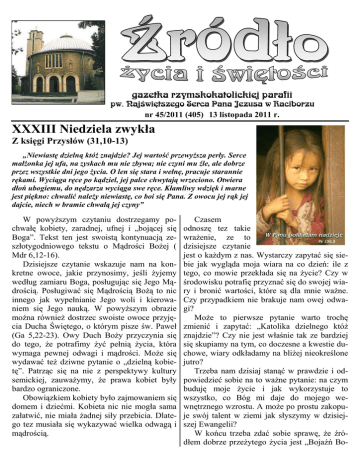 gazetka rzymskokatolickiej parafii pw. Najświętszego Serca Pana Jezusa w Raciborzu nr 45/2011 (405) 13 listopada 2011 r. XXXIII Niedziela zwykła Z księgi Przysłów (31,10-13) „Niewiastę dzielną któŜ znajdzie? Jej wartość przewyŜsza perły. Serce małŜonka jej ufa, na zyskach mu nie zbywa; nie czyni mu źle, ale dobrze przez wszystkie dni jego Ŝycia. O len się stara i wełnę, pracuje starannie rękami. Wyciąga ręce po kądziel, jej palce chwytają wrzeciono. Otwiera dłoń ubogiemu, do nędzarza wyciąga swe ręce. Kłamliwy wdzięk i marne jest piękno: chwalić naleŜy niewiastę, co boi się Pana. Z owocu jej rąk jej dajcie, niech w bramie chwalą jej czyny” W powyŜszym czytaniu dostrzegamy pochwałę kobiety, zaradnej, ufnej i „bojącej się Boga”. Tekst ten jest swoistą kontynuacją zeszłotygodniowego tekstu o Mądrości BoŜej ( Mdr 6,12-16). Dzisiejsze czytanie wskazuje nam na konkretne owoce, jakie przynosimy, jeśli Ŝyjemy według zamiaru Boga, posługując się Jego Mądrością. Posługiwać się Mądrością BoŜą to nic innego jak wypełnianie Jego woli i kierowaniem się Jego nauką. W powyŜszym obrazie moŜna równieŜ dostrzec swoiste owoce przyjęcia Ducha Świętego, o którym pisze św. Paweł (Ga 5,22-23). Owy Duch BoŜy przyczynia się do tego, Ŝe potrafimy Ŝyć pełnią Ŝycia, która wymaga pewnej odwagi i mądrości. MoŜe się wydawać teŜ dziwne pytanie o „dzielną kobietę”. Patrząc się na nie z perspektywy kultury semickiej, zauwaŜymy, Ŝe prawa kobiet były bardzo ograniczone. Obowiązkiem kobiety było zajmowaniem się domem i dziećmi. Kobieta nic nie mogła sama załatwić, nie miała Ŝadnej siły przebicia. Dlatego tez musiała się wykazywać wielka odwagą i mądrością. Czasem odnoszę tez takie wraŜenie, ze to dzisiejsze czytanie jest o kaŜdym z nas. Wystarczy zapytać się siebie jak wygląda moja wiara na co dzień: ile z tego, co mowie przekłada się na Ŝycie? Czy w środowisku potrafię przyznać się do swojej wiary i bronić wartości, które są dla mnie waŜne. Czy przypadkiem nie brakuje nam owej odwagi? MoŜe to pierwsze pytanie warto trochę zmienić i zapytać: „Katolika dzielnego któŜ znajdzie”? Czy nie jest właśnie tak ze bardziej się skupiamy na tym, co doczesne a kwestie duchowe, wiary odkładamy na bliŜej nieokreślone jutro? Trzeba nam dzisiaj stanąć w prawdzie i odpowiedzieć sobie na to waŜne pytanie: na czym buduję moje Ŝycie i jak wykorzystuje to wszystko, co Bóg mi daje do mojego wewnętrznego wzrostu. A moŜe po prostu zakopuje swój talent w ziemi jak słyszymy w dzisiejszej Ewangelii? W końcu trzeba zdać sobie sprawę, Ŝe źródłem dobrze przeŜytego Ŝycia jest „Bojaźń Bo- 2 Źródło - gazetka Ŝa”, która jest obrazem głębokiego szacunku, jaki winniśmy okazywać Panu Bogu. Bać się Boga na kratach Pisma św. oznacza Ŝyć sprawiedliwie oraz nieustannie zwracać swoje Zycie ku niemu i postępować zgodnie z Jego zasadami. Skupiając się zatem na Bogu mamy moŜliwość dobrego i godnego człowieka, katolika przeŜycia naszego Ŝycia. Jednocześnie trzeba nam prosić Pana o siły do tego by trwać przy Nim: Panie Jezu poślij mi swojego Ducha. Niech otwiera moje serce na Ciebie, niech otwiera mój rozum na Twoją mądrość i dodaje mi sił i odwagi do Ŝycia zgodnie z twoja wolą. Amen Ogłoszenia z życia naszej parafii Poniedziałek – 14 listopada 2011 – bł. Marii Luizy Merkert, dziewicy Łk 18,35-43 630 Za †† Juliana Zająca, Janinę i Alojzego Waniek 700 Za †† rodziców Jadwigę i Ernesta, brata Krystiana Juraszek oraz wszystkich †† z rodziny 00 18 1. Za † brata Wojciecha, rodziców Helenę i Czesława, †† z rodziny z obu stron 2. Za † Romana Skowronka oraz zmarłych rodziców Lędźwa i Skowronek Wtorek – 15 listopada 2011 Łk 19,1-10 30 6 Za †† rodziców i teściów: Pawła i Annę, Jana i Annę, brata Gintra i dusze w czyśćcu cierpiące 00 7 Za † Karola Butyńskiego w 10. rocznicę śmierci 00 8 W języku niemieckim: Za †† Hildegardę Piperek, jej męŜa Rudolfa i syna Piotra, †† z rodzin: Piperek i Grzesiczek oraz o BoŜe błogosławieństwo i zdrowie dla Gabrieli i Henryka 00 Za zmarłych (zbiorowa): Za † Adelajdę Szulcek w rocznicę urodzin, za † męŜa Piotra, 18 jego braci Marcina i Krzysztofa oraz rodziców z obu stron, za † matkę Marię Kuk, za † matkę Helenę Otlik i wszystkich †† z rodziny, za † Mirosławę Kowalczyk (w 30. dzień po śmierci oraz od współpracowników z Mieszka), za † Zofię Prędkiewicz (od sąsiadów z ul. Katowickiej 23 i 23a), za † Stanisława Płaczka (od współlokatorów), za † Jadwigę Mika (w 30. dzień po śmierci), za †† Henryka Janosz, rodziców Janosz, Gawlina, 2 siostry, brata Karola, Krystynę, męŜa Alojza DzierŜenga, Lucy i Norberta Kucharz, Henryka Kucza, za † Henryka Dąbrowskiego, za † Stanisława Staronia w 17 rocznicę śmierci, za †† ojca Jana, rodziców Irenę i Józefa, ciocię Annę, za †† Mariusza Juzek, brata Krzysztofa, wujka Mardiego rodziców Jerzego i Ewę Juzek Środa – 16 listopada 2011 – rocznica poświęcenia Katedry w Opolu Mt 16,13-19 30 6 Za † Jadwigę Kańtoch (od mieszkańców z ul. Katowickiej 13) 00 7 Z okazji 40. rocznicy urodzin syna Roberta z podziękowaniem za otrzymane łaski, z prośbą o BoŜe błogosławieństwo i zdrowie 00 18 1. W intencji Sabiny i Janusza Ciuraszkiewicz z okazji 15. rocznicy ślubu o BoŜe błogosławieństwo w całej rodzinie 2. Za †† rodziców i braci: Mirosława i Marka Czwartek – 17 listopada 2011 – św. ElŜbiety Węgierskiej, zakonnicy Łk 19,41-44 30 6 W intencji Ŝyjących z rodziny oraz za †† rodziców Jana i Agatę Sowa, siostrę ElŜbietę, ojca Szczepana, Jana, Stanisława i Anielę Kwaśników, pokrewieństwo z obu stron i dusze w czyśćcu cierpiące 00 7 Za † syna Jana Olesia w 6. rocznicę śmierci, ojca Józefa, rodziców z 