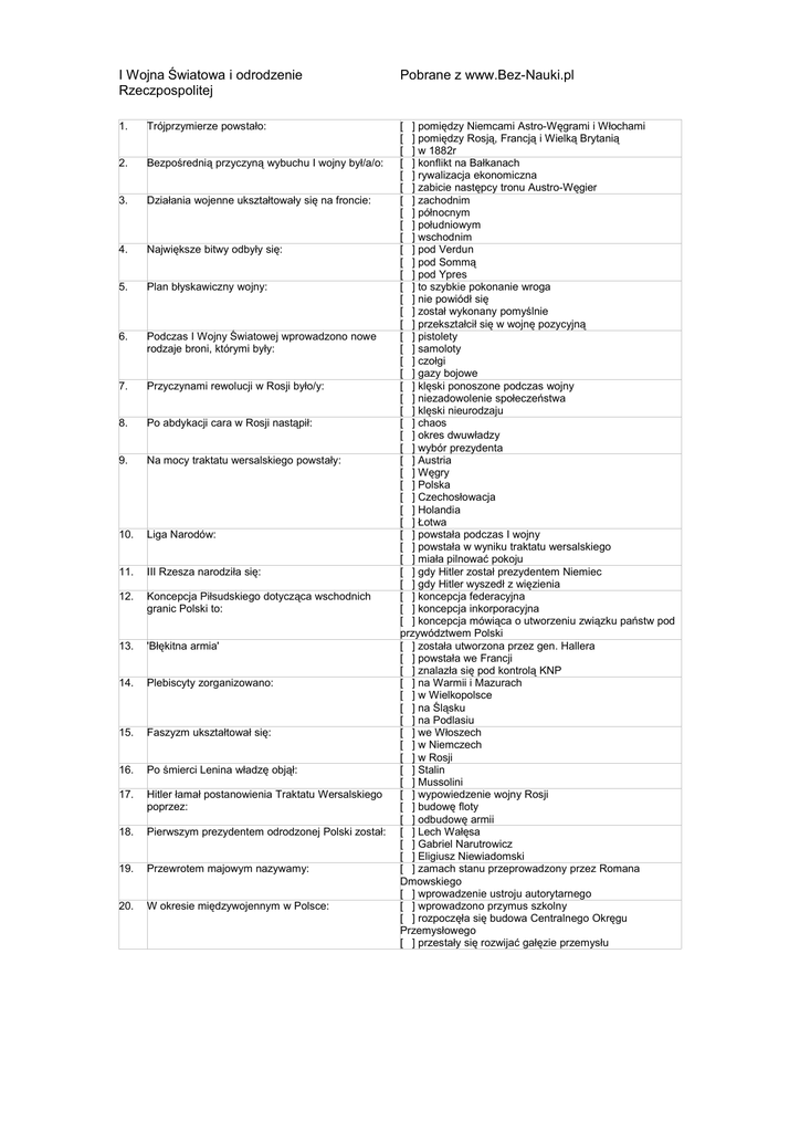 I Wojna Światowa i odrodzenie Rzeczpospolitej Pobrane z www.Bez-Nauki.pl 1. Trójprzymierze powstało: 2. Bezpośrednią przyczyną wybuchu I wojny był/a/o: 3. Działania wojenne ukształtowały się na froncie: 4. Największe bitwy odbyły się: 5. Plan błyskawiczny wojny: 6. Podczas I Wojny Światowej wprowadzono nowe rodzaje broni, którymi były: 7. Przyczynami rewolucji w Rosji było/y: 8. Po abdykacji cara w Rosji nastąpił: 9. Na mocy traktatu wersalskiego powstały: 10. Liga Narodów: 11. III Rzesza narodziła się: 12. Koncepcja Piłsudskiego dotycząca wschodnich granic Polski to: 13. 'Błękitna armia' 14. Plebiscyty zorganizowano: 15. Faszyzm ukształtował się: 16. Po śmierci Lenina władzę objął: 17. Hitler łamał postanowienia Traktatu Wersalskiego poprzez: 18. Pierwszym prezydentem odrodzonej Polski został: 19. Przewrotem majowym nazywamy: 20. W okresie międzywojennym w Polsce: [ ] pomiędzy Niemcami Astro-Węgrami i Włochami [ ] pomiędzy Rosją, Francją i Wielką Brytanią [ ] w 1882r [ ] konflikt na Bałkanach [ ] rywalizacja ekonomiczna [ ] zabicie następcy tronu Austro-Węgier [ ] zachodnim [ ] północnym [ ] południowym [ ] wschodnim [ ] pod Verdun [ ] pod Sommą [ ] pod Ypres [ ] to szybkie pokonanie wroga [ ] nie powiódł się [ ] został wykonany pomyślnie [ ] przekształcił się w wojnę pozycyjną [ ] pistolety [ ] samoloty [ ] czołgi [ ] gazy bojowe [ ] klęski ponoszone podczas wojny [ ] niezadowolenie społeczeństwa [ ] klęski nieurodzaju [ ] chaos [ ] okres dwuwładzy [ ] wybór prezydenta [ ] Austria [ ] Węgry [ ] Polska [ ] Czechosłowacja [ ] Holandia [ ] Łotwa [ ] powstała podczas I wojny [ ] powstała w wyniku traktatu wersalskiego [ ] miała pilnować pokoju [ ] gdy Hitler został prezydentem Niemiec [ ] gdy Hitler wyszedł z więzienia [ ] koncepcja federacyjna [ ] koncepcja inkorporacyjna [ ] koncepcja mówiąca o utworzeniu związku państw pod przywództwem Polski [ ] została utworzona przez gen. Hallera [ ] powstała we Francji [ ] znalazła się pod kontrolą KNP [ ] na Warmii i Mazurach [ ] w Wielkopolsce [ ] na Śląsku [ ] na Podlasiu [ ] we Włoszech [ ] w Niemczech [ ] w Rosji [ ] Stalin [ ] Mussolini [ ] wypowiedzenie wojny Rosji [ ] budowę floty [ ] odbudowę armii [ ] Lech Wałęsa [ ] Gabriel Narutrowicz [ ] Eligiusz Niewiadomski [ ] zamach stanu przeprowadzony przez Romana Dmowskiego [ ] wprowadzenie ustroju autorytarnego [ ] wprowadzono przymus szkolny [ ] rozpoczęła się budowa Centralnego Okręgu Przemysłowego [ ] przestały się rozwijać gałęzie przemysłu Poprawne odpowiedzi 1. 3. 5. 7. 9. 11. 13. 15. 17. 19. pomiędzy Niemcami Astro-Węgrami i Włochami, w 1882r zachodnim, południowym, wschodnim to szybkie pokonanie wroga, nie powiódł się, przekształcił się w wojnę pozycyjną klęski ponoszone podczas wojny, niezadowolenie społeczeństwa, klęski nieurodzaju Austria, Węgry, Polska, Czechosłowacja, Łotwa gdy Hitler został prezydentem Niemiec 2. zabicie następcy tronu Austro-Węgier 4. pod Verdun, pod Sommą 6. samoloty, czołgi, gazy bojowe chaos, okres dwuwładzy została utworzona przez gen. Hallera, powstała we Francji, znalazła się pod kontrolą KNP we Włoszech budowę floty, odbudowę armii wprowadzenie ustroju autorytarnego 14. 8. 10. powstała w wyniku traktatu wersalskiego, miała pilnować pokoju 12. koncepcja federacyjna, koncepcja mówiąca o utworzeniu związku państw pod przywództwem Polski na Warmii i Mazurach, na Śląsku 16. 18. Stalin Gabriel Narutrowicz 20. wprowadzono przymus szkolny, rozpoczęła się budowa Centralnego Okręgu Przemysłowego