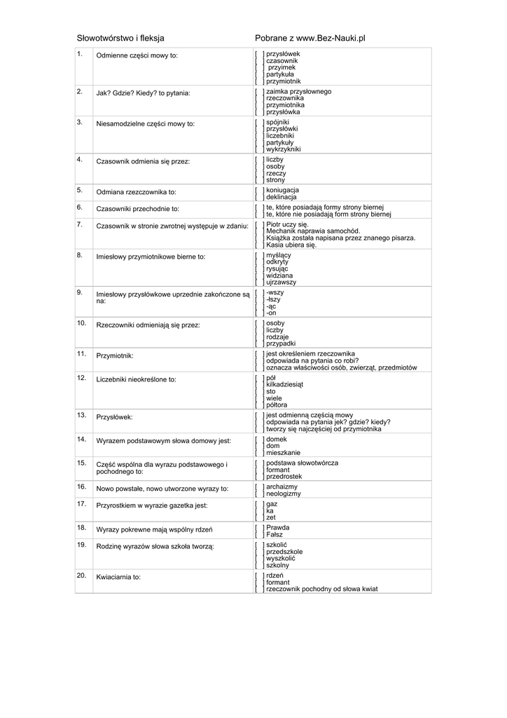 Słowotwórstwo i fleksja 1. 2. 3. 4. 5. 6. 7. 8. 9. 10. 11. 12. 13. 14. 15. 16. 17. 18. 19. 20. Pobrane z www.Bez-Nauki.pl [ [ [ [ [ [ Jak? Gdzie? Kiedy? to pytania: [ [ [ [ Niesamodzielne części mowy to: [ [ [ [ [ Czasownik odmienia się przez: [ [ [ [ Odmiana rzezczownika to: [ [ Czasowniki przechodnie to: [ Czasownik w stronie zwrotnej występuje w zdaniu: [ [ [ [ [ Imiesłowy przymiotnikowe bierne to: [ [ [ [ Imiesłowy przysłówkowe uprzednie zakończone są [ [ na: [ [ [ Rzeczowniki odmieniają się przez: [ [ [ [ Przymiotnik: [ [ [ Liczebniki nieokreślone to: [ [ [ [ [ Przysłówek: [ [ [ Wyrazem podstawowym słowa domowy jest: [ [ [ Część wspólna dla wyrazu podstawowego i [ pochodnego to: [ [ Nowo powstałe, nowo utworzone wyrazy to: [ [ Przyrostkiem w wyrazie gazetka jest: [ [ [ Wyrazy pokrewne mają wspólny rdzeń [ [ Rodzinę wyrazów słowa szkoła tworzą: [ [ [ [ Kwiaciarnia to: [ [ Odmienne części mowy to: ] przysłówek ] czasownik ] przyimek ] partykuła ] przymiotnik ] zaimka przysłownego ] rzeczownika ] przymiotnika ] przysłówka ] spójniki ] przysłówki ] liczebniki ] partykuły ] wykrzykniki ] liczby ] osoby ] rzeczy ] strony ] koniugacja ] deklinacja ] te, które posiadają formy strony biernej ] te, które nie posiadają form strony biernej ] Piotr uczy się. ] Mechanik naprawia samochód. ] Książka została napisana przez znanego pisarza. ] Kasia ubiera się. ] myślący ] odkryty ] rysując ] widziana ] ujrzawszy ] -wszy ] -łszy ] -ąc ] -on ] osoby ] liczby ] rodzaje ] przypadki ] jest określeniem rzeczownika ] odpowiada na pytania co robi? ] oznacza właściwości osób, zwierząt, przedmiotów ] pół ] kilkadziesiąt ] sto ] wiele ] półtora ] jest odmienną częścią mowy ] odpowiada na pytania jek? gdzie? kiedy? ] tworzy się najczęściej od przymiotnika ] domek ] dom ] mieszkanie ] podstawa słowotwórcza ] formant ] przedrostek ] archaizmy ] neologizmy ] gaz ] ka ] zet ] Prawda ] Fałsz ] szkolić ] przedszkole ] wyszkolić ] szkolny ] rdzeń ] formant ] rzeczownik pochodny od słowa kwiat Poprawne odpowiedzi 1. 3. 5. 7. 9. 11. 13. 15. 17. 19. przysłówek, przymiotnik spójniki, przysłówki, partykuły deklinacja Piotr uczy się., Kasia ubiera się. -wszy, -łszy jest określeniem rzeczownika, oznacza właściwości osób, zwierząt, przedmiotów odpowiada na pytania jek? gdzie? kiedy?, tworzy się najczęściej od przymiotnika podstawa słowotwórcza ka szkolić, przedszkole, wyszkolić, szkolny 2. 14. zaimka przysłownego, przysłówka liczby, osoby, strony te, które posiadają formy strony biernej odkryty, widziana liczby, przypadki kilkadziesiąt, wiele dom 16. 18. 20. neologizmy Prawda rzeczownik pochodny od słowa kwiat 4. 6. 8. 10. 12.