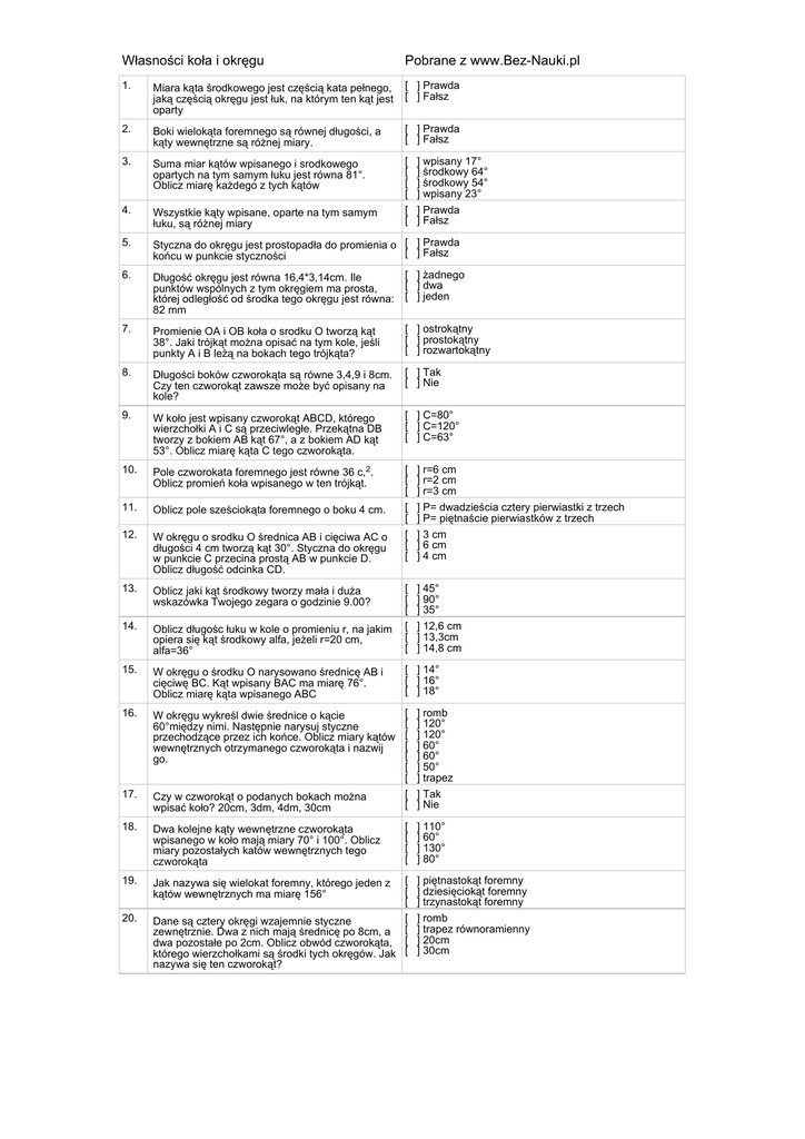 Własności koła i okręgu Pobrane z www.Bez-Nauki.pl 1. Miara kąta środkowego jest częścią kata pełnego, jaką częścią okręgu jest łuk, na którym ten kąt jest oparty [ ] Prawda [ ] Fałsz 2. Boki wielokąta foremnego są równej długości, a kąty wewnętrzne są różnej miary. [ ] Prawda [ ] Fałsz 3. Suma miar kątów wpisanego i srodkowego opartych na tym samym łuku jest równa 81°. Oblicz miarę każdego z tych kątów 4. Wszystkie kąty wpisane, oparte na tym samym łuku, są różnej miary [ [ [ [ [ [ 5. Styczna do okręgu jest prostopadła do promienia o [ ] Prawda [ ] Fałsz końcu w punkcie styczności 6. Długość okręgu jest równa 16,4*3,14cm. Ile punktów wspólnych z tym okręgiem ma prosta, której odległość od środka tego okręgu jest równa: 82 mm [ ] żadnego [ ] dwa [ ] jeden 7. Promienie OA i OB koła o srodku O tworzą kąt 38°. Jaki trójkąt można opisać na tym kole, jeśli punkty A i B leżą na bokach tego trójkąta? [ ] ostrokątny [ ] prostokątny [ ] rozwartokątny 8. Długości boków czworokąta są równe 3,4,9 i 8cm. Czy ten czworokąt zawsze może być opisany na kole? [ ] Tak [ ] Nie 9. W koło jest wpisany czworokąt ABCD, którego wierzchołki A i C są przeciwległe. Przekątna DB tworzy z bokiem AB kąt 67°, a z bokiem AD kąt 53°. Oblicz miarę kąta C tego czworokąta. [ ] C=80° [ ] C=120° [ ] C=63° 10. Pole czworokata foremnego jest równe 36 c,2. Oblicz promień koła wpisanego w ten trójkąt. 11. Oblicz pole sześciokąta foremnego o boku 4 cm. 12. W okręgu o srodku O średnica AB i cięciwa AC o długości 4 cm tworzą kąt 30°. Styczna do okręgu w punkcie C przecina prostą AB w punkcie D. Oblicz długość odcinka CD. [ [ [ [ [ [ [ [ ] r=6 cm ] r=2 cm ] r=3 cm ] P= dwadzieścia cztery pierwiastki z trzech ] P= piętnaście pierwiastków z trzech ] 3 cm ] 6 cm ] 4 cm 13. Oblicz jaki kąt środkowy tworzy mała i duża wskazówka Twojego zegara o godzinie 9.00? 14. Oblicz długośc łuku w kole o promieniu r, na jakim opiera się kąt środkowy alfa, jeżeli r=20 cm, alfa=36° [ [ [ [ [ [ ] 45° ] 90° ] 35° ] 12,6 cm ] 13,3cm ] 14,8 cm 15. W okręgu o środku O narysowano średnicę AB i cięciwę BC. Kąt wpisany BAC ma miarę 76°. Oblicz miarę kąta wpisanego ABC [ ] 14° [ ] 16° [ ] 18° 16. W okręgu wykreśl dwie średnice o kącie 60°między nimi. Następnie narysuj styczne przechodzące przez ich końce. Oblicz miary kątów wewnętrznych otrzymanego czworokąta i nazwij go. 17. Czy w czworokąt o podanych bokach można wpisać koło? 20cm, 3dm, 4dm, 30cm [ [ [ [ [ [ [ [ [ ] romb ] 120° ] 120° ] 60° ] 60° ] 50° ] trapez ] Tak ] Nie 18. Dwa kolejne kąty wewnętrzne czworokąta wpisanego w koło mają miary 70° i 100°. Oblicz miary pozostałych katów wewnętrznych tego czworokąta [ [ [ [ ] 110° ] 60° ] 130° ] 80° 19. Jak nazywa się wielokat foremny, którego jeden z kątów wewnętrznych ma miarę 156° 20. [ [ [ [ Dane są cztery okręgi wzajemnie styczne zewnętrznie. Dwa z nich mają średnicę po 8cm, a [ dwa pozostałe po 2cm. Oblicz obwód czworokąta, [ którego wierzchołkami są środki tych okręgów. Jak [ nazywa się ten czworokąt? ] wpisany 17° ] środkowy 64° ] środkowy 54° ] wpisany 23° ] Prawda ] Fałsz ] piętnastokąt foremny ] dziesięciokąt foremny ] trzynastokąt foremny ] romb ] trapez równoramienny ] 20cm ] 30cm Poprawne odpowiedzi 1. 3. 2. 4. Fałsz Fałsz 5. 7. 9. 11. 13. 15. Prawda wpisany 17°, środkowy 54° Prawda rozwartokątny C=120° P= dwadzieścia cztery pierwiastki z trzech 90° 14° 6. 8. 10. 12. 14. 16. 17. Tak 18. 19. piętnastokąt foremny 20. jeden Nie r=3 cm 4 cm 12,6 cm romb, 120°, 120°, 60°, 60° 110°, 80° romb, trapez równoramienny, 20cm