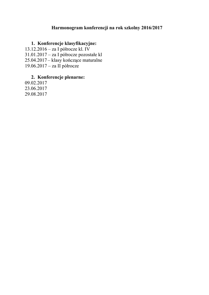 Harmonogram konferencji na rok szkolny 2016/2017 1. Konferencje klasyfikacyjne: 13.12.2016 – za I półrocze kl. IV 31.01.2017 – za I półrocze pozostałe kl 25.04.2017 – klasy kończące maturalne 19.06.2017 – za II półrocze 2. Konferencje plenarne: 09.02.2017 23.06.2017 29.08.2017