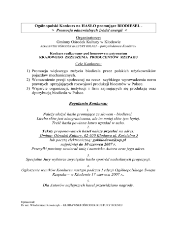 Ogólnopolski Konkurs na HASŁO promujące BIODIESEL . > Promocja odnawialnych źródeł energii < Organizatorzy: Gminny Ośrodek Kultury w Kłodawie KŁODAWSKI OŚRODEK KULTURY ROLNEJ – pomysłodawca Konkursu Konkurs realizowany pod honorowym patronatem KRAJOWEGO ZRZESZENIA PRODUCENTÓW RZEPAKU Cele Konkursu: 1) Promocja większego zużycia biodiesla przez polskich użytkowników pojazdów mechanicznych. 2) Wzmocnienie presji społecznej na rzecz szybkiego wprowadzenia norm prawnych sprzyjających rozwojowi produkcji bioestrów w Polsce. 3) Wsparcie organizacji, instytucji i firm zajmujących się produkcją oraz dystrybucją biodiesla w Polsce. Regulamin Konkursu: 1. Należy ułożyć hasło promujące ze słowem - biodiesel. Liczba słów jest nieograniczona, ale im mniej słów tym lepiej. Treść hasła powinna łatwo wpadać w ucho. 2. Teksty proponowanych haseł należy przesłać na adres: Gminny Ośrodek Kultury, 62-650 Kłodawa ul. Kościelna 5 lub pocztą elektroniczną: [email protected] najpóźniej do 10 czerwca 2007 r. Przesyłki powinny zawierać imię i nazwisko Autora oraz jego adres. 3. Specjalne Jury wybierze zwycięskie hasło spośród nadesłanych propozycji. 4. Ogłoszenie wyników Konkursu nastąpi podczas I edycji Ogólnopolskiego Święta Rzepaku – w Kłodawie 17 czerwca 2007 r.. 5. Dla Autorów najlepszych haseł przewidziano nagrody. Opracował: Dr inż. Włodzimierz Kowalczyk – KŁODAWSKI OŚRODEK KULTURY ROLNEJ