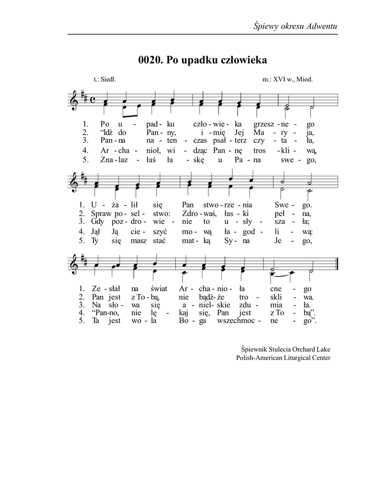 Śpiewy okresu Adwentu 0020. Po upadku człowieka t.: Siedl. 1. 2. 3. 4. 5. m.: XVI w., Miod. Po u “Idź do Pan - na Ar - cha Zna - laz - pad Pan na nioł, łaś ku czło - wie - ka ny, i - mię Jej ten - czas psał - terz wi - dząc Pan - nę ła - skę u Pa - 1. 2. 3. 4. 5. U - ża Spraw po Gdy poz Jął Ją Ty się lił sel dro cie masz się stwo: wie szyć stać 1. 2. 3. 4. 5. Ze - słał Pan jest Na sło “Pan-no, Ta jest na świat z To - bą, wa się nie lę wo - la grzesz - ne Ma - ry czy - ta tros - kli na swe - Pan stwo - rze - nia Zdro - waś, łas - ki nie to u - sły mo - wą ła - god mat - ką Sy - na Ar nie a kaj Bo - cha - nio - ła bądź- że tro niel- skie zdu się, Pan jest ga wszechmoc - Swe peł sza li Je - cne skli mia z To ne - go ja, ła, wą, go, go. na, ła; wą: go, go wa. ła. bą”. go”. Śpiewnik Stulecia Orchard Lake Polish-American Liturgical Center