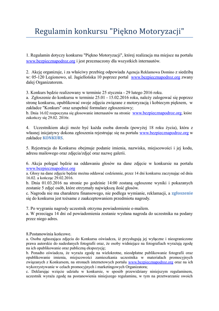 Regulamin konkursu "Piękno Motoryzacji" 1. Regulamin dotyczy konkursu "Piękno Motoryzacji", której realizacja ma miejsce na portalu www.bezpiecznapodroz.org i jest przeznaczony dla wszystkich internautów. 2. Akcję organizuje, i za właściwy przebieg odpowiada Agencja Reklamowa Domino z siedzibą w: 05-120 Legionowo, ul. Jagiellońska 10 poprzez portal www.bezpiecznapodroz.org zwany dalej Organizatorem. 3. Konkurs będzie realizowany w terminie 25 stycznia - 29 lutego 2016 roku. a. Zgłoszenie do konkursu w terminie 25.01 - 15.02.2016 roku, należy zalogować się poprzez stronę konkursu, opublikować swoje zdjęcia związane z motoryzacją i kobiecym pięknem, w zakładce "Konkurs" oraz uzupełnić formularz zgłoszeniowy; b. Dnia 16.02 rozpoczyna się głosowanie internautów na stronie www.bezpiecznapodroz.org, które zakończy się 29.02. 2016r. 4. Uczestnikiem akcji może być każda osoba dorosła (powyżej 18 roku życia), która z własnej inicjatywy dokona zgłoszenia rejestrując się na portalu www.bezpiecznapodroz.org w zakładce KONKURS. 5. Rejestracja do Konkursu obejmuje podanie imienia, nazwiska, miejscowości i jej kodu, adresu mailowego oraz zdjęcia/zdjęć oraz nazwę galerii. 6. Akcja polegać będzie na oddawaniu głosów na dane zdjęcie w konkursie na portalu www.bezpiecznapodroz.org a. Głosy na dane zdjęcie będzie można oddawać codziennie, przez 14 dni konkursu zaczynając od dnia 16.02. a kończąc 29.02.2016. b. Dnia 01.03.2016 na stronie po godzinie 14:00 zostaną ogłoszone wyniki i pokazanych zostanie 5 zdjęć osób, które otrzymały największą ilość głosów. c. Nagroda nie ma charakteru finansowego, nie podlega wymianie, reklamacji, a zgłoszenie się do konkursu jest tożsame z zaakceptowaniem przedmiotu nagrody. 7. Po wygraniu nagrody uczestnik otrzyma powiadomienie e-mailem. a. W przeciągu 14 dni od powiadomienia zostanie wysłana nagroda do uczestnika na podany przez niego adres. 8.Postanowinia końcowe. a. Osoba zgłaszająca zdjęcia do Konkursu oświadcza, iż przysługują jej wyłączne i nieograniczone prawa autorskie do nadesłanych fotografii oraz, że osoby widniejące na fotografiach wyrażają zgodę na ich opublikowanie oraz publiczną ekspozycję; b. Ponadto oświadcza, że wyraża zgodę na wielokrotne, nieodpłatne publikowanie fotografii oraz opublikowanie imienia, miejscowości zamieszkania uczestnika w materiałach promocyjnych związanych z Konkursem, na stronach internetowych portalu www.bezpiecznapodroz.org oraz na ich wykorzystywanie w celach promocyjnych i marketingowych Organizatora; c. Deklarując wzięcie udziału w konkursie, w sposób przewidziany niniejszym regulaminem, uczestnik wyraża zgodę na postanowienia niniejszego regulaminu, w tym na przetwarzanie swoich danych osobowych w celach marketingowych przez Organizatora i zobowiązuje się do przestrzegania niniejszego regulaminu; d. Zgłaszający nie musi być właścicielem a jedynie użytkownikiem pojazdu. 9. Zasady przeprowadzenia konkursu, rodzaj nagrody, formę przekazania nagrody, jeśli nie ma o nich mowy w niniejszym regulaminie, określone są ogólnie obowiązującymi przepisami Kodeksu cywilnego.