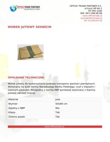 OFFICE TRADE PARTNER S.C. ul Łucji 49 lok.1 91-491 Łódź NIP: 947-198-08-99 www.officetrade.pl [email protected] Tel. 42 654 02 20 WOREK JUTOWY 50X80CM OPIS/DANE TECHNICZNE Worek jutowy do wykorzystania podczas transportu wartości pieniężnych. Wykonany na wzór normy Narodowego Banku Polskiego, czyli z klipsami i zielonym paskiem. Niezgodny z normą NBP ponieważ wykonany z tkaniny jutowej zamiast lnianej. Materiał Juta Wymiar 50x80 cm Zgodny z NBP Nie Klipsy Tak Zielony pasek Tak www.officetrade.pl Powered by TCPDF (www.tcpdf.org)