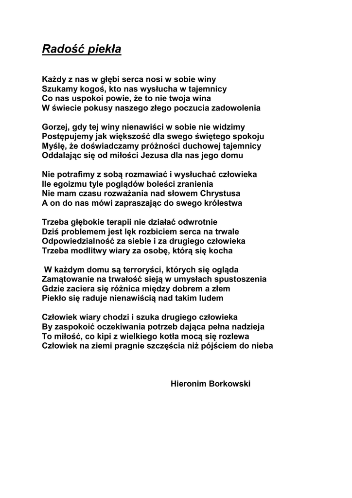 Radość piekła Każdy z nas w głębi serca nosi w sobie winy Szukamy kogoś, kto nas wysłucha w tajemnicy Co nas uspokoi powie, że to nie twoja wina W świecie pokusy naszego złego poczucia zadowolenia Gorzej, gdy tej winy nienawiści w sobie nie widzimy Postępujemy jak większość dla swego świętego spokoju Myślę, że doświadczamy próżności duchowej tajemnicy Oddalając się od miłości Jezusa dla nas jego domu Nie potrafimy z sobą rozmawiać i wysłuchać człowieka Ile egoizmu tyle poglądów boleści zranienia Nie mam czasu rozważania nad słowem Chrystusa A on do nas mówi zapraszając do swego królestwa Trzeba głębokie terapii nie działać odwrotnie Dziś problemem jest lęk rozbiciem serca na trwale Odpowiedzialność za siebie i za drugiego człowieka Trzeba modlitwy wiary za osobę, którą się kocha W każdym domu są terroryści, których się ogląda Zamątowanie na trwałość sieją w umysłach spustoszenia Gdzie zaciera się różnica między dobrem a złem Piekło się raduje nienawiścią nad takim ludem Człowiek wiary chodzi i szuka drugiego człowieka By zaspokoić oczekiwania potrzeb dająca pełna nadzieja To miłość, co kipi z wielkiego kotła mocą się rozlewa Człowiek na ziemi pragnie szczęścia niż pójściem do nieba Hieronim Borkowski