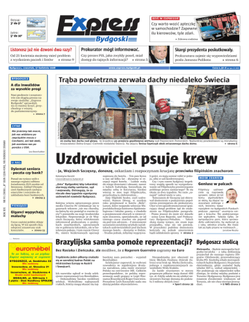 a to r n a i z w d le o a r , a a m w e i o n r u k Zd z ą i w bo ss Expre Dzisiaj: 3o do 9o ki · s Bydgo ieczyć abezp 5o do 10o DZIŚ W EXPRESSIE rzyć w e zda O k związ m u z ty się z lepiej ę moż si wiele ma ac h i na sił dzielić uje się alające u m, że z c a zw ża wc kiero tności po cy to uwa czk ą w ję umie szej pomo ądną apte wiem w z o w r b r o ł, p ie a p a by uś ura onow war to aucie dysp ógłby kom i sąsiew m m io u y n k y ed d n sw z wypa . Nasi połu c się w prz ją alergic9 mln razie a ją ie i ie. Na luje tować życ ne orientu a, wymag nia o Alerg nosa cierp 10 proc. z tr m n ko aw da ew t ten te go pr posia i, zap olicja we to nieży w, a tylko wo żeli p odblasko obić? dz ac h nasze ierowców ó r Polak st prawidło asem, d , że je pis lskic h k nicy. ty z niu o ra Mówią e, trójk ą Cóż zatem dość że ie o g n p d ż nich je ych. Tymc ów, kataru od żo wy dró czkę g n gaśnic je mieć. siedzi nie cze ic h czki ju iście w o kie prawo siate leczo g alergolo o p ać apte a a ą z s s b w c o y a p ln letow tr ze ac hodni ują to je specjalRzecz o np. słow mochodu : gaza wedłu go nie wo dyż z skomp k i je , u s o d g lu e sa a ć rażo rt g o d y n u a y r ie N a ę , b g n ać sie są zb zki p ść re polsk od kierowc której ma a 7,5 x jest n pera dróż w rotnie lizow aptec tość i jako 164. U nas ła, czyli ln r tość jną po bagate si on aż 8-kania na maga apteczki w ana ster y zynfekzawa anie w tem ilgot d ar akacy 13 ró ła w w ź o a a o w IN n z w u C d e g D d w ro . o się po Dro ytać rma tem dania filna, skła roztwór d stnik do ow y w st. C., o zach ęstszą rzemy na no jlepiej zap iału Ruchu iej Polikon- na pr zec h 0 do +60 Żaden lek r yzyk , jest najcz nia zatok i wybie a hydro 10 sztuk, na 50 ml, u izoterrazie . -2 D anim ne? N lnika Wydz ojewódzk isar za ch od 0 do 100% arunków. astmę yną zapale do wielu ym. W go wyposa ,5 cm jatin - jody ania, folia jkątne, Z m ra 7 W w e o y z to k c r d z d 1 w yz na spo takie men dych y tró , na jny A przyc prowadzić jak polipy ści od yma takich c h Europ o u tran się nie ma abulić. go Ko dgoszczy - cy cznego od dwie chust ch (gumo , e ik m u ń e n w y z h ż ja z ła z . c o a ią s i tr a z y r ik m a B mo na ny ow wy wielu k sztu a 1 szt., ha. no jeśl ie uch h pow foliow zce sa troli, można sło gdyś w bilistów cji w wa Żyduc wietle ob episów chron innyc zy zapalen kataru ś a go w y w aptec ne tylko miczn kawic o we, chusta ,25 cm, z ie , c rę żenia tyk ane n la automo nie, taWiesł teczk a w kraju pr - powie1 b a nosa ie leczenie nasilonego d się, a umieszcz y.(m) para jednorazo er, szeroki s hydrop ły m o i a y p A p k z w S z z o s n w o c t r c a d i k ) apte Obe go, nawe st bardzo żyć środk omisa były szej pomoc wych 0 cm, plast e, kompre ompres hwn owiąz e handlurały różne miały słu . Natojącyc jest nieob ecie nadk estrzek sienn lekłego, je czne, e y pier w 20 x 2 aże ster yln x 15 cm, , opaska rz w ie zawie tak jakb y w biurz ie i laprawa naszej gaz eśmy od p ze konand ylny 10 cm i prze zne i bezp ym b 6 5 c s 4 a i, im x ł st o z n iu r tk z 6 c y le om nami w yc ste b dzia h. - My je kcjonar urat app ln st , j y y la r e e skute nowoczesn idom o e h z ln s c z st a n fi i kowy filny, pier w jeździ ona Żyduc prawa. Fu czy, ale ak . Tylko opask dzięk ortykostero wym. Jak hydro a 70 cm, w opatrun Wszysto miast gania różne rze interesują śli już, ow stró ce. glikok niu miejsc amoliński lują i się nie dać, że je byle gumcm, 10 pla fki i noży ym pojem(w tym 7% VAT) o S ła tr f. ia dz do am ażu x4 4 agra plastikow ślił pro ktyki i teczk tnie mogę iecać bag wiowe 4 cm, podkre du Profila iskowych wa rto zaśm ysło zeb- 8 x ma być w y z ła w r r k o o p p a g d Z a ie ro z iz wa potr ko to żeń Ś zawsk to nie i zestawam wiele jest eli jakiś Zagro logii Wars dycznego, o jakim o w nich nie miast jeż Alerg rsytetu Me dekadach to b a ł, N z e u . y 5 ie Uniw tnich kilk rzecz świec a ny c h w ost alergii na . liczba ie wzrosła n znacz Czy warto wozić apteczkę czkę w te ap w u Zapewne ne ilsamochodzie? wozić pew to r a ń na a Czy w hodzie? Z będzie zda c o sam ców tyle ilu kierowców, tyle zdań. kierow at. e drodz ie. Na Zdrow WIE ZDRO ln m9m b Pro le ów Polak Jutro: p ie, wy zdrow ski.pl bydgo xpress. www.e Bydgoski BYDGOSKI Zdrowa rodzina Listonosz już nie dzwoni dwa razy? Prokurator mógł informować. Skargi prezydenta poskutkowały. Od 21 kwietnia możemy mieć problem z wysłaniem paczek i listów strona 9 Czy prezes PiS, jako zwykły poseł, miał dostęp do tajnych informacji? strona 5 Prokuratura zajmie się wypowiedziami posła Janusza Palikota strona 6 Bydgoszcz, czwartek, 17 kwietnia 2008 Cena 1,30 zł www.express.bydgoski.pl 908B 1601 DBRA Trąba powietrzna zerwała dachy niedaleko Świecia BYDGOSZCZ 3222 A BH 08BD A dla inwalidów za wysokie progi A BH 08BD 3226 Nasi posłowie i senatorowie nie skąpią grosza na swoje siedziby. „Express Bydgoski” sprawdził, na co można liczyć, przychodząc z wizytą do parlamentarzysty. APTE KI C OBO D O Ł A rie iej-Cu 1 dowsk ul. Skło (52) 346-01-1 tel. 1, , zka 71 nwald ul. Gru ) 347-84-90 2 2 (5 8 2 tel. ziennie strona 7 140, ańska ul. Gd 345-57-57 ) tel. (52 rie 26 iej-Cu 6-94 dowsk -0 ul. Skło tel. (52) 346 dz. 10-16 ), ie (BILLA sob. 8-21, n czynn eń ogłosz onych ieszcz wsze. po szcz cej z w ozwalają ćmy Rp ji za ki RESTO c a k yfi ew z ls ) c u T o C m s O ulot - fakoczepienie oka (S (kaps wsz kularów cznej dna y wtórnej uter bez o grafii opty cie zaćm ej p w kom ię o - tom rowe rozc oresceino (HRT II, i B ry - lase iografii flu nku jask temem A i s k g ru - an ań w kie i oka sy j rogów twardyc e - bad sonografi puterow taktowych nsultacj - ultra grafii komewek kon ń oraz ko - topo acji socz ów i bada lef k - apli ch zabieg 15, te iowa 0 do - inny drzew iada odpow cja nie Redak za treś ć zam za as od DŹ CENĘ! W a l PR