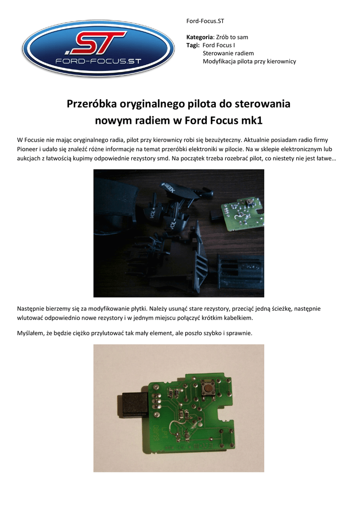 Ford-Focus.ST Kategoria: Zrób to sam Tagi: Ford Focus I Sterowanie radiem Modyfikacja pilota przy kierownicy Przeróbka oryginalnego pilota do sterowania nowym radiem w Ford Focus mk1 W Focusie nie mając oryginalnego radia, pilot przy kierownicy robi się bezużyteczny. Aktualnie posiadam radio firmy Pioneer i udało się znaleźć różne informacje na temat przeróbki elektroniki w pilocie. Na w sklepie elektronicznym lub aukcjach z łatwością kupimy odpowiednie rezystory smd. Na początek trzeba rozebrać pilot, co niestety nie jest łatwe… Następnie bierzemy się za modyfikowanie płytki. Należy usunąć stare rezystory, przeciąć jedną ścieżkę, następnie wlutować odpowiednio nowe rezystory i w jednym miejscu połączyć krótkim kabelkiem. Myślałem, że będzie ciężko przylutować tak mały element, ale poszło szybko i sprawnie. Na końcu należy przygotować kabel, żeby to wszystko ze sobą podłączyć. Efekt końcowy w moim przypadku jest taki że działają przyciski: Vol-, Vol+, Source i Seek Up Seek Down niestety nie działa, nie wiem czemu, ale nie wiem czy ten przycisk działał wcześniej. Ogólnie jestem bardzo zadowolony z efektu, pomimo niedziałającego jednego przycisku, najbardziej zależało mi na głośności i zmianie piosenek z USB. Dzięki i pozdrawiam Focus Klub Polska – Tizi
