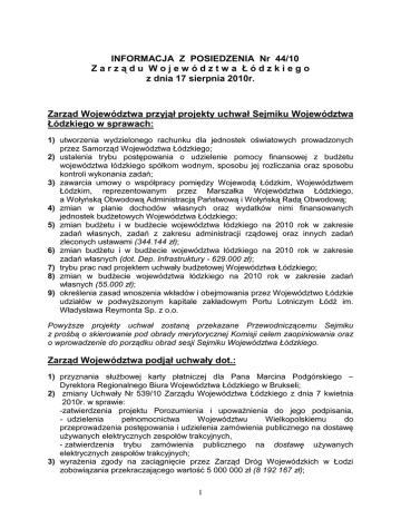INFORMACJA Z POSIEDZENIA Nr 44/10 Zarządu Województwa Łódzkiego z dnia 17 sierpnia 2010r. Zarząd Województwa przyjął projekty uchwał Sejmiku Województwa Łódzkiego w sprawach: 1) utworzenia wydzielonego rachunku dla jednostek oświatowych prowadzonych przez Samorząd Województwa Łódzkiego; 2) ustalenia trybu postępowania o udzielenie pomocy finansowej z budżetu województwa łódzkiego spółkom wodnym, sposobu jej rozliczania oraz sposobu kontroli wykonania zadań; 3) zawarcia umowy o współpracy pomiędzy Wojewodą Łódzkim, Województwem Łódzkim, reprezentowanym przez Marszałka Województwa Łódzkiego, a Wołyńską Obwodową Administracją Państwową i Wołyńską Radą Obwodową; 4) zmian w planie dochodów własnych oraz wydatków nimi finansowanych jednostek budżetowych Województwa Łódzkiego; 5) zmian budżetu i w budżecie województwa łódzkiego na 2010 rok w zakresie zadań własnych, zadań z zakresu administracji rządowej oraz innych zadań zleconych ustawami (344.144 zł); 6) zmian budżetu i w budżecie województwa łódzkiego na 2010 rok w zakresie zadań własnych (dot. Dep. Infrastruktury - 629.000 zł); 7) trybu prac nad projektem uchwały budżetowej Województwa Łódzkiego; 8) zmian w budżecie województwa łódzkiego na 2010 rok w zakresie zadań własnych (55.000 zł); 9) określenia zasad wnoszenia wkładów i obejmowania przez Województwo Łódzkie udziałów w podwyższonym kapitale zakładowym Portu Lotniczym Łódź im. Władysława Reymonta Sp. z o.o. Powyższe projekty uchwał zostaną przekazane Przewodniczącemu Sejmiku z prośbą o skierowanie pod obrady merytorycznej Komisji celem zaopiniowania oraz o wprowadzenie do porządku obrad sesji Sejmiku Województwa Łódzkiego. Zarząd Województwa podjął uchwały dot.: 1) przyznania służbowej karty płatniczej dla Pana Marcina Podgórskiego – Dyrektora Regionalnego Biura Województwa Łódzkiego w Brukseli; 2) zmiany Uchwały Nr 539/10 Zarządu Województwa Łódzkiego z dnia 7 kwietnia 2010r. w sprawie: -zatwierdzenia projektu Porozumienia i upoważnienia do jego podpisania, - udzielenia pełnomocnictwa Województwu Wielkopolskiemu do przeprowadzenia postępowania i udzielenia zamówienia publicznego na dostawę używanych elektrycznych zespołów trakcyjnych, - zatwierdzenia trybu zamówienia publicznego na dostawę używanych elektrycznych zespołów trakcyjnych; 3) wyrażenia zgody na zaciągnięcie przez Zarząd Dróg Wojewódzkich w Łodzi zobowiązania przekraczającego wartość 5 000 000 zł (8 192 167 zł); 1 4) wyrażenia zgody na zaciągnięcie przez Zarząd Dróg Wojewódzkich w Łodzi zobowiązania przekraczającego wartość 5 000 000 zł (69 765 052 zł); 5) zmiany Uchwały Nr 752/10 Zarządu Województwa Łódzkiego z dnia 18 maja 2010 r. w sprawie przyjęcia Książek Procedur w ramach Programu Rozwoju Obszarów Wiejskich na lata 2007-2013, zmienionej Uchwałą Nr 821/10 Zarządu Województwa Łódzkiego z dnia 1 czerwca 2010 r. w sprawie zmiany Uchwały Nr 752/10 Zarządu Województwa Łódzkiego z dnia 18 maja 2010 r. w sprawie przyjęcia Książek Procedur w ramach Programu Rozwoju Obszarów Wiejskich na lata 2007-2013, Uchwałą Nr 873/10 Zarządu Województwa Łódzkiego z dnia 15 czerwca 2010 r. w sprawie zmiany Uchwały Nr 752/10 Zarządu Województwa Łódzkiego z dnia 18 maja 2010 r. w sprawie przyjęcia Książek Procedur w ramach Programu Rozwoju Obszarów Wiejskich na lata 2007-2013 oraz Uchwałą Nr 1147/10 w sprawie: zmiany Uchwały Nr 752/10 Zarządu Województwa Łódzkiego z dnia 18 maja 2010 r. w sprawie przyjęcia Książek Procedur w ramach Programu Rozwoju Obszarów Wiejskich na lata 2007-2013, zmienionej Uchwałą Nr 821/10 Zarządu Województwa Łódzkiego z dnia 1 czerwca 2010 r. w sprawie zmiany Uchwały Nr 752/10 Zarządu Województwa Łódzkiego z dnia 18 maja 2010 r. w sprawie przyjęcia Książek Procedur w ramach Programu Rozwoju Obszarów Wiejskich na lata 2007-2013, Uchwałą Nr 873/10 Zarządu Województwa Łódzkiego z dnia 15 czerwca 2010 r. w sprawie zmiany Uchwały Nr 752/10 Zarządu Województwa Łódzkiego z dnia 18 maja 2010 r. w sprawie przyjęcia Książek Procedur w ramach Programu Rozwoju Obszarów Wiejskich na lata 2007-2013; 6) zatwierdzenia listy operacji skierowanych do współfinansowania w ramach Działania 4.1/413 Wdrażanie lokalnych strategii Rozwoju dla operacji, które odpowiadają warunkom przyznania pomocy w ramach działania „Odnowa i rozwój wsi” objętego Programem Rozwoju Obszarów Wiejskich na lata 2007-2013 dla Stowarzyszenia Lokalna Grupa Działania „Tradycja, Kultura, Rozwój” w ramach naboru I w 2009 roku; 7) zatwierdzenia listy operacji skierowanych do współfinansowania w ramach Działania 4.1/413 Wdrażanie lokalnych strategii Rozwoju dla operacji, które odpowiadają warunkom przyznania pomocy w ramach działania „Odnowa i rozwój wsi” objętego Programem Rozwoju Obszarów Wiejskich na lata 2007-2013 dla Stowarzyszenia Lokalna Grupa Działania „U źródeł” w ramach naboru I w 2009 roku; 8) przeprowadzenia konkursu „Przyjazna wieś” na najlepszy projekt w zakresie infrastruktury realizowanych na terenach wiejskich przy wsparciu środków unijnych realizowanego w ramach Planu działania Sekretariatu Regionalnego Krajowej Sieci Obszarów Wiejskich Województwa Łódzkiego na lata 2010-2011; 9) zmiany uchwały Nr 1074/10 Zarządu Województwa Łódzkiego w sprawie ustalenia wysokości stypendium za wyniki w nauce dla uczniów Szkoły Policealnej nr 1 Samorządu Województwa Łódzkiego w Łodzi; 10) zmiany uchwały nr 1855/08 Zarządu Województwa Łódzkiego z dnia 03.12.2008 roku w sprawie określenia wysokości środków z Pomocy Technicznej na lata 2007- 2010 dla Instytucji Pośredniczącej 2 Stopnia (Wojewódzkiego Urzędu Pracy w Łodzi) oraz określenia praw i obowiązków Instytucji Pośredniczącej 2 Stopnia związanych z realizacją Rocznych Planów Działan