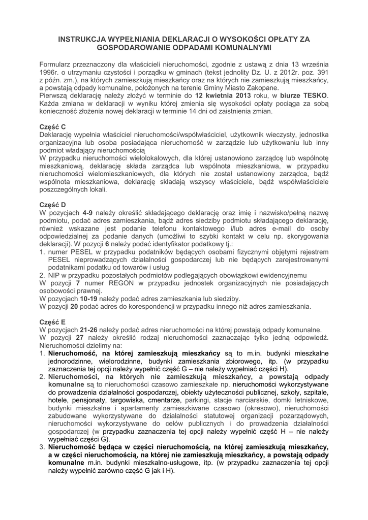 INSTRUKCJA WYPEŁNIANIA DEKLARACJI O WYSOKOŚCI OPŁATY ZA GOSPODAROWANIE ODPADAMI KOMUNALNYMI Formularz przeznaczony dla właścicieli nieruchomości, zgodnie z ustawą z dnia 13 września 1996r. o utrzymaniu czystości i porządku w gminach (tekst jednolity Dz. U. z 2012r. poz. 391 z późn. zm.), na których zamieszkują mieszkańcy oraz na których nie zamieszkują mieszkańcy, a powstają odpady komunalne, połoŜonych na terenie Gminy Miasto Zakopane. Pierwszą deklarację naleŜy złoŜyć w terminie do 12 kwietnia 2013 roku, w biurze TESKO. KaŜda zmiana w deklaracji w wyniku której zmienia się wysokości opłaty pociąga za sobą konieczność złoŜenia nowej deklaracji w terminie 14 dni od zaistnienia zmian. Część C Deklarację wypełnia właściciel nieruchomości/współwłaściciel, uŜytkownik wieczysty, jednostka organizacyjna lub osoba posiadająca nieruchomość w zarządzie lub uŜytkowaniu lub inny podmiot władający nieruchomością W przypadku nieruchomości wielolokalowych, dla której ustanowiono zarządcę lub wspólnotę mieszkaniową, deklarację składa zarządca lub wspólnota mieszkaniowa, w przypadku nieruchomości wielomieszkaniowych, dla których nie został ustanowiony zarządca, bądź wspólnota mieszkaniowa, deklarację składają wszyscy właściciele, bądź współwłaściciele poszczególnych lokali. Część D W pozycjach 4-9 naleŜy określić składającego deklarację oraz imię i nazwisko/pełną nazwę podmiotu, podać adres zamieszkania, bądź adres siedziby podmiotu składającego deklarację, równieŜ wskazane jest podanie telefonu kontaktowego i/lub adres e-mail do osoby odpowiedzialnej za podanie danych (umoŜliwi to szybki kontakt w celu np. skorygowania deklaracji). W pozycji 6 naleŜy podać identyfikator podatkowy tj.: 1. numer PESEL w przypadku podatników będących osobami fizycznymi objętymi rejestrem PESEL nieprowadzących działalności gospodarczej lub nie będących zarejestrowanymi podatnikami podatku od towarów i usług 2. NIP w przypadku pozostałych podmiotów podlegających obowiązkowi ewidencyjnemu W pozycji 7 numer REGON w przypadku jednostek organizacyjnych nie posiadających osobowości prawnej. W pozycjach 10-19 naleŜy podać adres zamieszkania lub siedziby. W pozycji 20 podać adres do korespondencji w przypadku innego niŜ adres zamieszkania. Część E W pozycjach 21-26 naleŜy podać adres nieruchomości na której powstają odpady komunalne. W pozycji 27 naleŜy określić rodzaj nieruchomości zaznaczając tylko jedną odpowiedź. Nieruchomości dzielimy na: 1. Nieruchomość, na której zamieszkują mieszkańcy są to m.in. budynki mieszkalne jednorodzinne, wielorodzinne, budynki zamieszkania zbiorowego, itp. (w przypadku zaznaczenia tej opcji naleŜy wypełnić część G – nie naleŜy wypełniać części H). 2. Nieruchomości, na których nie zamieszkują mieszkańcy, a powstają odpady komunalne są to nieruchomości czasowo zamieszkałe np. nieruchomości wykorzystywane do prowadzenia działalności gospodarczej, obiekty uŜyteczności publicznej, szkoły, szpitale, hotele, pensjonaty, targowiska, cmentarze, parkingi, stacje narciarskie, domki letniskowe, budynki mieszkalne i apartamenty zamieszkiwane czasowo (okresowo), nieruchomości zabudowane wykorzystywane do działalności statutowej organizacji pozarządowych, nieruchomości wykorzystywane do celów publicznych i do prowadzenia działalności gospodarczej (w przypadku zaznaczenia tej opcji naleŜy wypełnić część H – nie naleŜy wypełniać części G). 3. Nieruchomość będąca w części nieruchomością, na której zamieszkują mieszkańcy, a w części nieruchomością, na której nie zamieszkują mieszkańcy, a powstają odpady komunalne m.in. budynki mieszkalno-usługowe, itp. (w przypadku zaznaczenia tej opcji naleŜy wypełnić zarówno część G jak i H). Część F Pozycja 28 naleŜy zaznaczyć tylko jeden deklarowany sposób zbiórki odpadów. Selektywna zbiórka oznacza, Ŝe z całej objętości odpadów minimum 60% wszystkich odpadów winna zostać zebrana w sposób selektywny. Selektywna zbiórka odpadów komunalnych winna obejmować następujące frakcje odpadów zbieranych w przeznaczonych do tego workach (otrzymywanych od zbierającego odpady) lub pojemnikach będących własnością składającego deklarację: 1. niebieskim - papier, 2. Ŝółtym - metal, tworzywa sztuczne, opakowania wielomateriałowe, 3. zielonym - szkło, 4. brązowym - odpady komunalne ulegające biodegradacji w tym odpady opakowaniowe ulegające biodegradacji, 5. oraz w osobnym pojemniku odpady pozostałe nie nadające się do segregacji (max 40% całej objętości odpadów). Część G Pozycja 29 naleŜy podać liczbę osób zamieszkujących nieruchomość. W pozycji 30 naleŜy wyliczyć stawkę opłaty za gospodarowanie odpadami na podstawie wzoru: liczba mieszkańców z punktu 29 razy stawka opłaty tj. 1. w przypadku zaznaczenia TAK w punkcie 28 stawka 9,50 zł, 2. w przypadku zaznaczenia NIE w punkcie 28 stawka wynosi 15 zł. Część H Pozycja 31 naleŜy podać rodzaj prowadzonej działalności. W pozycji 32 naleŜy podać informacje dotyczące danej działalności np. restauracjazatrudnionych 5 osób, ilość miejsc konsumpcyjnych 30. W pozycji 33 naleŜy określić, w razie zaistnienia takiej sytuacji, inny rodzaj nieruchomości gdzie nie jest prowadzona działalność gospodarcza, a powstają odpady np. plac zabaw. W pozycjach 34-42 naleŜy indywidualnie określić zapotrzebowanie na wielkość i ilość oddawanych pojemników w miesiącu. Stawka opłaty za pojemnik: w przypadku zaznaczenia w przypadku zaznaczenia wielkość pozycja TAK w punkcie 28 (selektywna NIE w punkcie 28 (nieselektywna pojemnika zbiórka odpadów) stawki zbiórka odpadów) stawki 43 0,06m3 7,00zł 12,00zł 44 0,08m3 8,00zł 13,00zł 3 45 0,12m 9,50zł 20,00zł 46 0,24m3 19,00zł 40,00zł 47 0,36m3 28,50zł 57,00zł 3 48 1,1m 82,50zł 125,00zł 49 4-5m3 