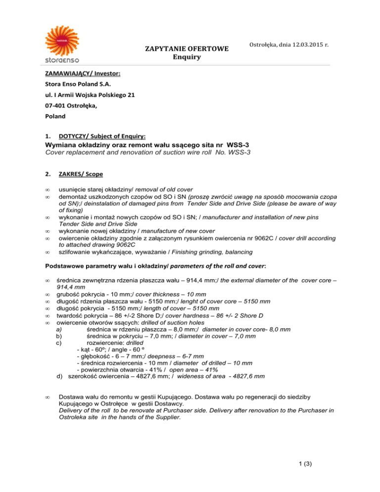 ZAPYTANIE OFERTOWE Enquiry Ostrołęka, dnia 12.03.2015 r. ZAMAWIAJĄCY/ Investor: Stora Enso Poland S.A. ul. I Armii Wojska Polskiego 21 07-401 Ostrołęka, Poland 1. DOTYCZY/ Subject of Enquiry: Wymiana okładziny oraz remont wału ssącego sita nr WSS-3 Cover replacement and renovation of suction wire roll No. WSS-3 2. ZAKRES/ Scope • • usunięcie starej okładziny/ removal of old cover demontaż uszkodzonych czopów od SO i SN (proszę zwrócić uwagę na sposób mocowania czopa od SN);/ deinstalation of damaged pins from Tender Side and Drive Side (please be aware of way of fixing) wykonanie i montaż nowych czopów od SO i SN; / manufacturer and installation of new pins Tender Side and Drive Side wykonanie nowej okładziny / manufacture of new cover owiercenie okładziny zgodnie z załączonym rysunkiem owiercenia nr 9062C / cover drill according to attached drawing 9062C szlifowanie wykańczające, wyważanie / Finishing grinding, balancing • • • • Podstawowe parametry wału i okładziny/ parameters of the roll and cover: • • • • • • • średnica zewnętrzna rdzenia płaszcza wału – 914,4 mm;/ the external diameter of the cover core – 914,4 mm grubość pokrycia - 10 mm;/ cover thickness – 10 mm długość rdzenia płaszcza wału - 5150 mm;/ lenght of cover core – 5150 mm długość pokrycia - 5150 mm;/ length of cover – 5150 mm twardość pokrycia – 86 +/-2 Shore D;/ cover hardness – 86 +/- 2 Shore D owiercenie otworów ssących: drilled of suction holes a) średnica w rdzeniu płaszcza – 8,0 mm;/ diameter in cover core- 8,0 mm b) średnica w pokryciu – 7,0 mm; / diameter in cover – 7,0 mm c) rozwiercenie: drilled - kąt - 60º; / angle - 60 º - głębokość - 6 – 7 mm;/ deepness – 6-7 mm - średnica rozwiercenia - 10 mm / diameter of drilled – 10 mm - powierzchnia otwarcia - 41% / open area – 41% d) szerokość owiercenia – 4827,6 mm; / wideness of area - 4827,6 mm Dostawa wału do remontu w gestii Kupującego. Dostawa wału po regeneracji do siedziby Kupującego w Ostrołęce w gestii Dostawcy. Delivery of the roll to be renovate at Purchaser side. Delivery after renovation to the Purchaser in Ostroleka site in the hands of the Supplier. 1 (3) ZAPYTANIE OFERTOWE Enquiry Ostrołęka, dnia 12.03.2015 r. Ofertę handlową należy przesłać drogą elektroniczną na poniższy adres e-mailowy: Commercial offer shall be sent to the following e-mail [email protected] 3. OSOBY KONTAKTOWE / CONTACT DETAILS: - ws. handlowych Commercial Issues _ [email protected] tel: +48 728 417 510 - ws. Technicznych Technical Issues _ Zbigniew Piekutowski, [email protected], tel. 601-915-733 4. WYMAGANA DATA ZŁOŻENIA OFERTY /OFFER DELIVERY TIME: • 30.03.2015r. 5. TERMIN WAŻNOŚCI OFERTY/ OFFER VALIDITY: • nie krótszy niż do 30 kwiecień 2015 6. ZAŁĄCZNIKI DO ZAPYTANIA/ ATTACHMENTS: • Załącznik Nr 1 Kodeks Etyki SE/ Code of Conduct SE • Załącznik Nr2 Polityka ZSZ/ Management Policy • rysunki wału/ roll drawing nr 1725-001758 / 79 902-72/1 • rysunek owiercenie wykładziny / drawing of cover drilled- 9062 Jeśli zapytanie pochodzi ze strony internetowej storaensonarew.com proszę o kontakt pod adresem [email protected] celem uzyskania załączników do zapytania. If the request comes from the website storaensonarew.com please contact us at [email protected] in order to receive attachemnst to the inquiry 7. OFERTA POWINNA ZAWIERAĆ/ OFFER SHALL INCLUDE: 1. W ofercie należy uwzględnić wszystkie potrzeby związane z wykonaniem i dostawą w tym zastosowane materiały, rodzaj i parametry okładziny. 2. Podać termin wykonania licząc od daty zamówienia. 3. Okres gwarancji / na okres gwarancji wymagane jest zabezpieczanie w postaci gwarancji bankowej na 10 % wartości zamówienia. Proszę o wyszczególnienie w ofercie kosztów za GB. 4. Termin ważności oferty 5. Dodatkowe informacje i uwagi, oraz wymagania wobec Kupującego. 6. Akceptacja Kodeksu Etyki SE oraz wymagań opisanych w zapytaniu. Złożenie oferty jest równoznaczne z akceptacją. Podpisany Kodeks Etyki należy dołączyć do oferty. Firmy, które złożyły już podpisany kodeks nie są zobowiązane do ponownego przesłania. 7. Ubezpieczanie OC z tytułu prowadzonej dzielności na co najmniej 2 mln zł. 8. Dostawa wału po wykonaniu nowej powłoki na warunkach DAP Ostrołęka. 9. Warunki płatności, jeśli przedpłata to wymagane jest zabezpieczenie w postaci gwarancji bankowej. 1. The offer should include all needs related to the manufacture and delivery also specification of the materials used, the type and parameters of the cover. 2. Delivery time from order date. 3. Guarantee/ Supplier shall confirm bank guarantee in amount of 10 % of order value. 2 (3) ZAPYTANIE OFERTOWE Enquiry Ostrołęka, dnia 12.03.2015 r. 4. Validity of offer. 5. Additional information and notes, as well as the requirements of the Buyer. 6. Acceptance of Code of Ethics SE. Submission of offer implies acceptance. A signed declaration of the Code of Ethics should be attached to the offer. Companies that have already submitted a signed declaration and code are not required to re-submit. 7. Third Part Liability insurance - at least 2 million PLN. 8. Delivery of roll after the new cover applied on DAP Ostroleka base. 9. Payment terms, if prepayment – bank guarantee shall be provided. 8. KRYTERIA WYBORU WYKONAWCY/ CRITERIA FOR SELECTION OF THE SUPPLIER • ceny ofertowa • zastosowane materiały • terminu realizacji Wybór Dostawcy będzie dokonany po końcowych negocjacjach ceny. Kupujący zastrzega sobie prawo do dokonania wyboru dostawców do finalnych negocjacji w oparciu o powyższe kryteria. • the offer price • materials used • completion date Final decision after negotiation process.The Purchaser reserves the right to make preselection for tender negotiations based on the above criteria’s. 9. POZOSTAŁE WARUNKI / OTHER ISSUES Stora Enso zastrzega sobie prawo do zmiany tr