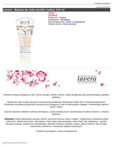 Informacje o produkcie Utworzono 08-03-2017 Lavera - Balsam do ciała wanilia i kokos 150 ml Cena : 32,50 zł Producent : Lavera Dostępność : Dostępny Stan magazynowy : brak w magazynie Średnia ocena : brak recenzji Codzienna kojąca pielęgnacja ciała. Cenne wyciągi z wanilii, kokosa i kakao pielęgnują skórę pozostawiając ją gładką i delikatną. Balsam do ciała to dobry pomysł na kontynuację pielęgnacji kosmetykami Body SPA w kokosowe popołudnie. Prawdziwie zmysłową przyjemność poczujesz przy pielęgnacji ciała w towarzystwie ciepłego i smakowitego zapachu wanilii i kakao. Zawiera naturalne składniki roślinne pochodzące z upraw ekologicznych, kontrolowanych dzikich zbiorów i z własnej produkcji. Składniki: wodno-alkoholowy wyciąg z wanilii*, gliceryna roślinna, oliwa z oliwek*, trójglicerydy (mieszanka olejów roślinnych), alkohol tłuszczowy, olej sojowy*, ester kwasu glicerynowego, masło shea*,olej migdałowy*, squalan, lecytyna, ksantan, witamina E, olej kokosowy, ekstrakt z kokosa, ekstrakt z kakao, sterole roślinne, olej z kwiatu słonecznika, witamina C, mieszanka olejków eterycznych. *składniki pochodzące z upraw ekologicznych Wygenerowano w programie www.oscGold.com