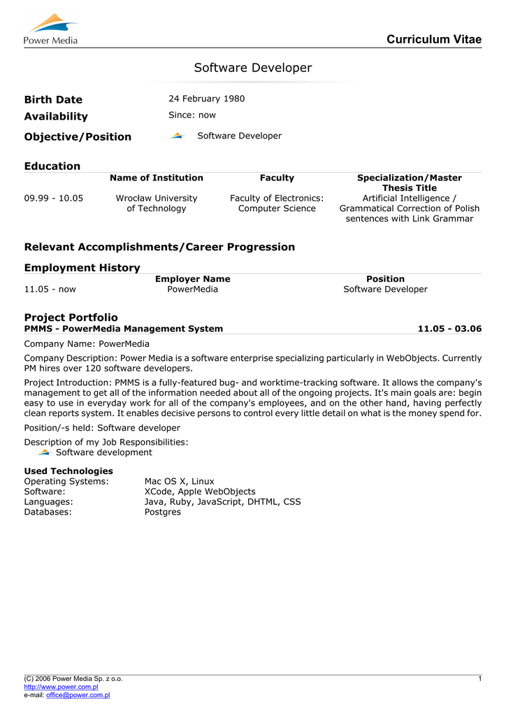 Curriculum Vitae ! !" #$ %&' ($ )* "#$% && + ,'. ** )/$& $$&01. ** '#() #* # /23 %%"+%%)" ,,-./.0-.1 )* 4 */23 )* $/23 $ $ $$ 5' !67$) /2&$$ 3$ /7,3/22$ 3' 31* 1'$ , $&* 8$ * '*' &* 33 &''7$,8$* ' $ ' $$3 1 &* 8$*$9 3&&& 39& ' $$$*, $3$$$3 & $&*$3 /$-$&3 3 $*:;$$$ 3* 2&) 6 '$*$ 0 ' '$ $$ (C) 2006 Power Media Sp. z o.o. http://www.power.com.pl e-mail: [email protected] 2 6<90= <)39+!67$ : 9;9: 9>%209) /$'$ 1 Curriculum Vitae 3"#%)"43"%"5 .0-.1+ )* 4 */23 )* $/23 $ $ $$ 5' !67$) /2&$$ 3$ /7 ,3 .3 2 '* $* ? 3 .2@ $ $ & ' $ $ 3 $$ * '* , $ $&3' $$9 $ $$- $$ 3 * $$'& $1$ /$-$&3 $*:;$$$ 3* $- &3$' )$* $ 2&) > 3 6 '$*$ 0 ' '$ $$ /$ )* 2 6<90= <)39+!67$92$/7 : 9: 9>%209>%209)9#=$&$'9A. /$'$ 3(+67345 .,-./.8-./ )* 4 *%& #$! )* $6&$& &'&$&$/ 3? 3&3@ /7,3%&* 78$' $3$ =$$&$$ 3$ *$ 3$ $$ $ $3*3301. ** /$-$&3 &-3 $*:;$$$ 3* &3$' )$* $ 2&) > 3 6 '$*$ 0 ' '$ $$ /$ )* !3$ A$9,:,3 9; ;$94B $ : -!,4. 2C0 6)) : ): 9 *3 "#7 *3 ,$$ '0$ (C) 2006 Power Media Sp. z o.o. http://www.power.com.pl e-mail: [email protected] B1$92$9+& D$ 2 Curriculum Vitae , ! E * 5'3F 5 5 *& 3 & $& 55 G/ 23 H I"1F 5 ' 5J 335 KJ 5 $35J!" * &$5755J 5- 5-3 &$I1K&$7 K &-*7FK &-3 51 5 &3 &3**$517J*$I3 -*3**5 ' 5*- ,,G/23 HI"1 5' 5J335 KJ5$35J!" 92 1"3$17L)-9 M!" 9 $ 3N 7';7$J3'-7$53$FI-3**O 9*79E* / -/ 'J33$&3 &$& 53& (C) 2006 Power Media Sp. z o.o. http://www.power.com.pl e-mail: [email protected] 3