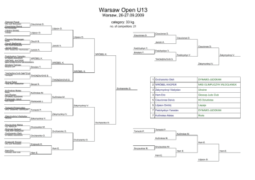 Warsaw Open U13 Warsaw, 26-27.09.2009 Zaborek Paweł UKJ 225 Warszawa Ciaucionas Deivis KS Dziudistas Litjasov Dmitrij Liepaja Čeponis Mindaugas Ristis Osuch Bartłomiej UKS "Siódemka" Sochaczew Fedchyshyn Yaroslav DYNAMO-JUDOKAN WRÓBEL KACPER Litjasov D. Dinamo LAT TIHONZAVOVS DMITZIJS Ventspils Skrzat Rafał "WALTER" RZESZÓW Kučinskas Matas Ristis Ilyin Ruslan AZS Opole Tomecki Przemysław UKS "Siódemka" Sochaczew Zakyrnycknyi Vladyslav Ukraine Gruzauskas Matas VSI "MINVIJA" Woźniak Norbert DYNAMO-JUDOKAN Krajewski Kacper UKJ 225 Warszawa Ham Eric Glossop Judo Club Janicki A. Janicki A. Ciaucionas D. Fedchyshyn Y. Janicki A. Smolars T. WRÓBEL K. Fedchyshyn Y. Fedchyshyn Y. WRÓBEL K. Zakyrnycknyi V. TIHONZAVOVS D. WRÓBEL K. Zakyrnycknyi V. Smolars T. WRÓBEL K. TIHONZAVOVS D. TIHONZAVOVS D. Skrzat R. Ovcharenko O. Kučinskas M. Kučinskas M. Pankowski J. Zakyrnycknyi V. Tomecki P. Zakyrnycknyi V. 1 Ovcharenko Oleh DYNAMO-JUDOKAN 2 WRÓBEL KACPER MKS OLIMPIJCZYK WŁOCŁAWEK 3 Zakyrnycknyi Vladyslav Ukraine 3 Ham Eric Glossop Judo Club 5 Ciaucionas Deivis KS Dziudistas 5 Litjasov Dmitrij Liepaja 7 Fedchyshyn Yaroslav DYNAMO-JUDOKAN 7 Kučinskas Matas Ristis Zakyrnycknyi V. Ovcharenko O. Gruzauskas M. "WALTER" RZESZÓW Ovcharenko Oleh Ciaucionas D. Ciaucionas D. Osuch B. DYNAMO-JUDOKAN Pankowski Jakub Ciaucionas D. Litjasov D. MKS OLIMPIJCZYK WŁOCŁAWEK Smolars Tomass no. of competitors: 21 Litjasov D. UKJ AON Warszawa Janicki Adam category: 33 kg. Ciaucionas D. Ovcharenko O. Tomecki P. Tomecki P. Kučinskas M. Ovcharenko O. Kučinskas M. Ovcharenko O. Ham E. Krajewski K. Ham E. Gruzauskas M. Gruzauskas M. Ham E. Ham E. Ham E. Ham E. Litjasov D.