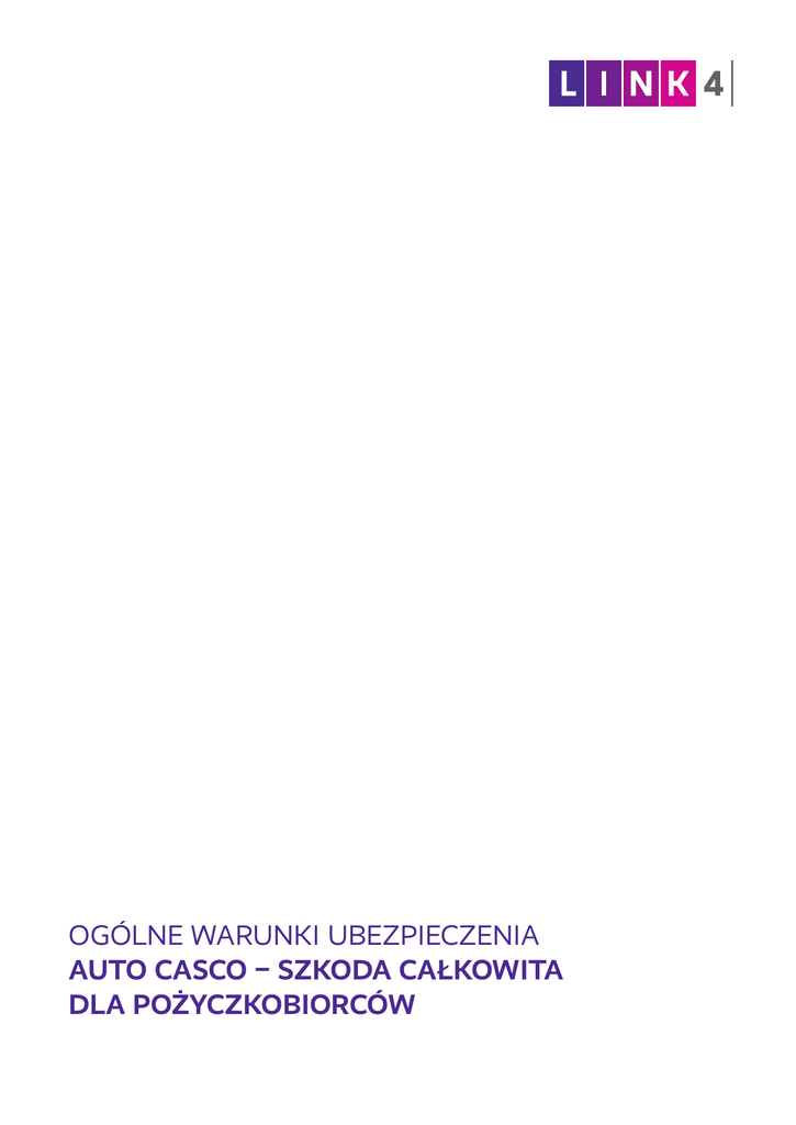OGÓLNE WARUNKI UBEZPIECZENIA AUTO CASCO – SZKODA CAŁKOWITA DLA POŻYCZKOBIORCÓW OGÓLNE WARUNKI UBEZPIECZENIA AUTO CASCO – SZKODA CAŁKOWITA DLA POŻYCZKOBIORCÓW RODZAJ INFORMACJI NUMER JEDNOSTKI REDAKCYJNEJ WZORCA UMOWY 1. P rzesłanki wypłaty odszkodowania i innych świadczeń §3.1, §3.2, §4 2. Ograniczenia oraz wyłączenia odpowiedzialności zakładu ubezpieczeń uprawniające do odmowy wypłaty odszkodowania i innych świadczeń lub ich obniżenia §3.1.1-8, §3.4, §5, §6, §8.4, §10.2, §13, §14, §16.2.1, §18-21, §26.2.1 3 | Link4 Ogólne Warunki Ubezpieczenia I. POSTANOWIENIA OGÓLNE §1 1.1. Na podstawie niniejszych Ogólnych Warunków Ubezpieczenia (OWU) Link4 Towarzystwo Ubezpieczeń S.A., zwane dalej Link4, zawiera umowę ubezpieczenia z osobą określoną w dokumencie ubezpieczenia jako strona umowy ubezpieczenia, zwaną dalej ubezpieczającym. 1.2. Umowa ubezpieczenia może być zawarta na cudzy rachunek, tj. na rachunek niebędącego ubezpieczającym właściciela pojazdu, zwanego dalej ubezpieczonym. 1.3. Umowa ubezpieczenia zawierana jest po złożeniu przez ubezpieczającego wniosku ubezpieczeniowego. Wniosek ubezpieczeniowy może być złożony agentowi ubezpieczeniowemu działającemu w imieniu lub na rzecz Link4 lub w innej, zaakceptowanej przez Link4, formie. 1.4. Ubezpieczający powinien przekazać ubezpieczonemu OWU na piśmie lub innym trwałym nośniku przed zawarciem umowy na jego rachunek. Niezależnie od powyższego ubezpieczony ma prawo żądać, aby Link4 przedstawił mu informacje o postanowieniach zawartej umowy oraz OWU w zakresie dotyczącym praw i obowiązków ubezpieczonego. §2 2.1. Umowa ubezpieczenia zawarta jest na zasadach określonych w niniejszych OWU oraz w dokumencie ubezpieczenia. 2.2. Za zgodą ubezpieczającego warunki umowy ubezpieczenia mogą odbiegać od postanowień niniejszych OWU, o ile Link4 przedstawi ubezpieczającemu różnice przed zawarciem umowy oraz zostaną one zapisane w dokumencie ubezpieczenia. 2.3. W przypadku wniosku ubezpieczeniowego składanego za pośrednictwem serwisu internetowego Link4, umowa ubezpieczenia zawierana jest dodatkowo pod warunkiem akceptacji przez ubezpieczającego zasad określonych w regulaminie świadczenia usług drogą elektroniczną, udostępnionym w serwisie internetowym Link4 (www. link4.pl). II. PRZEDMIOT UBEZPIECZENIA §3 3.1. Przedmiotem ubezpieczenia są określone w dokumencie ubezpieczenia pojazdy (samochody osobowe albo samochody ciężarowe) o DMC nieprzekraczającej 3,5 t, zarejestrowane w Rzeczypospolitej Polskiej zgodnie z przepisami prawa o ruchu drogowym, nie starsze niż 12-letnie w momencie złożenia wniosku ubezpieczeniowego, których wartość w momencie złożenia wniosku ubezpieczeniowego, wraz z zamontowanym fabrycznie wyposażeniem i urządzeniami służącymi bezpieczeństwu oraz utrzymaniu i używaniu pojazdu zgodnie z jego przeznaczeniem, a także z urządzeniami zabezpieczającymi pojazd przed kradzieżą, mieści się w granicach 20 000 zł – 100 000 zł, z wyłączeniem: 3.1.1. pojazdów, w których zostały dokonane istotne modyfikacje w zabudowie (przebudowa, rozbudowa, nadbudowa) zmieniające ich konstrukcję; 3.1.2. autobusów; 3.2. 3.3. 3.4. 3.5. 3.1.3. maszyn budowlanych, rozumianych jako wykorzystywane do robót budowlanych (w rozumieniu ustawy Prawo budowlane) urządzenia techniczne, które wykonują pracę w ruchu i pod kontrolą operatora; 3.1.4. pojazdów specjalnych w rozumieniu ustawy Prawo o ruchu drogowym; 3.1.5. maszyn rolniczych, rozumianych jako maszyny stosowane do prac rolnych, leśnych lub ogrodniczych (np. ciągniki rolnicze, kombajny, kosiarki, itp.); 3.1.6. pojazdów kempingowych, rozumianych jako pojazdy przeznaczone do celów turystycznych, rekreacyjnych i czasowego zamieszkania w nich osób, wyposażone w miejsca do spania, wypoczynku oraz urządzenia kuchenne; 3.1.7. pojazdów sprowadzonych z USA i Kanady; 3.1.8. pojazdów z układem kierowniczym po prawej stronie. Przedmiotem ubezpieczenia jest ponadto wyposażenie dodatkowe, tzn. urządzenia lub osprzęt ubezpieczanego pojazdu, które nie jest montowane przez producenta w warunkach montażu fabrycznego lub generalnego importera pojazdu do Rzeczypospolitej Polskiej, zamontowane w nim na stałe i możliwe do demontażu wyłącznie przy użyciu narzędzi. Ilekroć w dalszej części niniejszych OWU jest mowa o pojeździe rozumie się przez to pojazd wraz z wyposażeniem dodatkowym. Górną granicę odpowiedzialności w każdym zdarzeniu powodującym odpowiedzialność odszkodowawczą Link4 stanowi ustalona łącznie dla pojazdu oraz wyposażenia dodatkowego kwota, potwierdzona odpowiednim zapisem w dokumencie ubezpieczenia, zwana sumą ubezpieczenia. Przy zawarciu umowy ubezpieczenia wiek pojazdu ustala się jako różnicę pomiędzy rokiem złożenia wniosku ubezpieczeniowego a rokiem jego produkcji. III. ZAKRES UBEZPIECZENIA §4 4.1. Ochroną ubezpieczeniową, z zastrzeżeniem wyłączeń określonych w §5, objęta jest szkoda całkowita zaistniała w czasie trwania ochrony ubezpieczeniowej: 4.1.1. polegająca na uszkodzeniu bądź zniszczeniu pojazdu w wyniku wystąpienia co najmniej jednego z wymienionych poniżej czynników: a. zderzenia pojazdu z innymi pojazdami, osobami, zwierzętami lub przedmiotami pochodzącymi z zewnątrz pojazdu; b. działania osób trzecich; c. pożaru, wybuchu, osmalenia; d. nagłego działania czynnika termicznego lub chemicznego pochodzących z zewnątrz pojazdu; e. zatopienia; f. nagłego działania sił przyrody, np. huraganu, gradu, uderzenia pioruna, powodzi, zapadania lub osuwania się ziemi, lawiny; 4 | Link4 Ogólne Warunki Ubezpieczenia 4.1.2. polegająca na kradzieży pojazdu, rozumianej jako działanie sprawcy o znamionach określonych w art. 278 k.k. (kradzież), w art. 279 k.k. (kradzież z włamaniem) lub w art. 280 k.k. (rozbój). 4.2. Ochroną ubezpieczeniową są objęte szkody, o których mowa w ust. 4.1 powyżej, zai