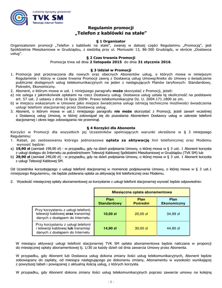 Regulamin promocji „Telefon z kablówki na stałe” § 1 Organizator Organizatorem promocji „Telefon z kablówki na stałe”, zwanej w dalszej części Regulaminu „Promocją", jest Spółdzielnia Mieszkaniowa w Grudziądzu, z siedzibą przy ul. Moniuszki 13, 86-300 Grudziądz, w skrócie „Dostawca usług”. § 2 Czas trwania Promocji Promocja trwa od dnia 2 listopada 2015 do dnia 31 stycznia 2016. § 3 Udział w Promocji 1. Promocja jest przeznaczona dla nowych oraz obecnych Abonentów usług, o których mowa w niniejszym Regulaminie i którzy w czasie trwania Promocji zawrą z Dostawcą usług Umowę/Aneks do Umowy o świadczenie publicznie dostępnych usług telekomunikacyjnych na jeden z następujących Planów taryfowych: Standardowy, Pośredni, Ekonomiczny. 2. Abonent, o którym mowa w ust. 1 niniejszego paragrafu może skorzystać z Promocji, jeżeli: a) nie zalega z jakimikolwiek opłatami na rzecz Dostawcy usług. Dostawca usług ustala tę okoliczność na podstawie art. 57 ust. 2 ustawy z dnia 16 lipca 2004r. Prawo telekomunikacyjne Dz. U. 2004.171.1800 ze zm. b) w miejscu wskazanym w Umowie jako miejsce świadczenia usługi istnieją techniczne możliwości świadczenia usługi telefonii stacjonarnej przez Dostawcę usług. 3. Abonent, o którym mowa w ust.1 niniejszego paragrafu nie może skorzystać z Promocji, jeżeli zawarł wcześniej z Dostawcą usług Umowę, w której zobowiązał się do pozostania Abonentem Dostawcy usług w zakresie telefonii stacjonarnej i okres tego zobowiązania nie przeminął. § 4 Korzyści dla Abonenta Korzyści w Promocji dla wszystkich jej Uczestników spełniających warunki określone w § 3 niniejszego Regulaminu: 1. Rabat, po zastosowaniu którego jednorazowa opłata za aktywację linii telefonicznej oraz Modemu wynosić będzie: a) 19,90 zł (zamiast 199,90 zł) - w przypadku, gdy na dzień podpisania Umowy, o której mowa w § 3 ust. 1 Abonent korzysta z usługi dostępu do Internetu za pośrednictwem Telewizji Kablowej Spółdzielni Mieszkaniowej w Grudziądzu (TVK SM) lub b) 29,90 zł (zamiast 249,00 zł) - w przypadku, gdy na dzień podpisania Umowy, o której mowa w § 3 ust. 1 Abonent korzysta z usługi Telewizji Kablowej SM. Od Uczestnika korzystającego z usługi telefonii stacjonarnej w momencie podpisywania Umowy, o której mowa w § 3 ust.1 niniejszego Regulaminu, nie będzie pobierana opłata za aktywację linii telefonicznej oraz Modemu. 2. Wysokość miesięcznej opłaty abonamentowej za korzystanie z usługi telefonii stacjonarnej wynosić będzie odpowiednio: Miesięczna opłata abonamentowa Plan Standardowy Plan Pośredni Plan Ekonomiczny Przy korzystaniu z usługi telefonii, telewizji kablowej oraz transmisji danych z dostępem do Internetu 10,00 zł 20,00 zł 34,99 zł Przy korzystaniu z usługi telefonii i telewizji kablowej lub transmisji danych z dostępem do Internetu 14,90 zł 30,00 zł 44,90 zł W miesiącu aktywacji usługi telefonii stacjonarnej TVK SM opłata abonamentowa będzie naliczana w proporcji do miesięcznej opłaty abonamentowej tj. 1/30 za każdy dzień od dnia zawarcia Umowy przez Abonenta. W przypadku, gdy Abonent lub Dostawca usług dokona zmiany ilości usług telekomunikacyjnych, Abonent będzie zobowiązany do zapłaty, od miesiąca następującego po dokonaniu zmiany, Abonamentu w wysokości wynikającej z powyższej tabeli i powiązanej z aktualną ilością usług, z których korzysta. W przypadku, gdy Abonent dokona zmiany ilości usług telekomunikacyjnych poprzez zawarcie umowy na kolejną -1- usługę, będzie on zobowiązany do zapłaty, od miesiąca następującego po jej zawarciu, Abonamentu w wysokości wynikającej z powyższej tabeli i powiązanej z aktualną ilością usług, z których korzysta. 3. Obniżenie w momencie podpisywania Umowy, o której mowa w § 3 ust.1 jednorazowej opłaty za zmianę Planu taryfowego do wysokości 14,90 zł. §5 Prawa i obowiązki Uczestnika Promocji 1. Warunkiem przyznania korzyści określonych w § 4 niniejszego Regulaminu jest pozostanie w okresie trwania Umowy zawartej na zasadach niniejszej Promocji, Abonentem telewizji kablowej i/lub usługi transmisji danych z dostępem do Internetu za pośrednictwem TVK SM. 2. W przypadku niespełnienia przez Abonenta warunku wskazanego w ust. 1 niniejszego paragrafu, będzie on zobowiązany do zapłaty, od miesiąca, w którym pozostanie Abonentem wyłącznie usługi telefonii stacjonarnej, miesięcznej opłaty abonamentowej zgodnie z aktualnie obowiązującym Cennikiem. 3. W czasie korzystania z Promocji Abonent ma prawo do zmiany Planu taryfowego określonego w § 4 ust. 2. W takim przypadku usługa ta, po uprzednim zawarciu Aneksu do Umowy w Promocji, będzie świadczona w cenie właściwej dla wybranego Planu taryfowego określonego w § 4 ust. 2, zaś zmiana Planu nastąpi z pierwszym dniem następnego miesiąca. W przypadku zmiany Planu taryfowego Abonent zobowiązany będzie do uiszczenia jednorazowej opłaty za zmianę Planu taryfowego w wysokości 14,90 zł. 4. Abonent jest zobowiązany do zwrócenia Sprzętu wymienionego w Protokole Odbioru i Aktywacji Usługi zgodnie z zasadami określonymi w Regulaminie świadczenia publicznie dostępnych usług telekomunikacyjnych przez Spółdzielnię Mieszkaniową w Grudziądzu, ul. Moniuszki 13. § 6 Postanowienia końcowe 1. Umowa zostaje zawarta na czas nieoznaczony z prawem jej rozwiązania przez każdą ze Stron na zasadach określonych w Umowie. Okres wypowiedzenia Umowy wynosi 1 miesiąc i biegnie od pierwszego dnia miesiąca następującego po miesiącu złożenia wypowiedzenia. 2. Niniejszy Regulamin promocji jest regulaminem szczególnym w stosunku do Regulaminu świadczenia publicznie dostępnych usług telekomunikacyjnych przez Spółdzielnię Mieszkaniową w Grudziądzu, ul. Moniuszki 13 i obowiązuje w okresie, na jaki została zawarta Umowa o świadczenie publicznie dostępnych usług telekomunikacyjnych na zasadach Promocji. 3.