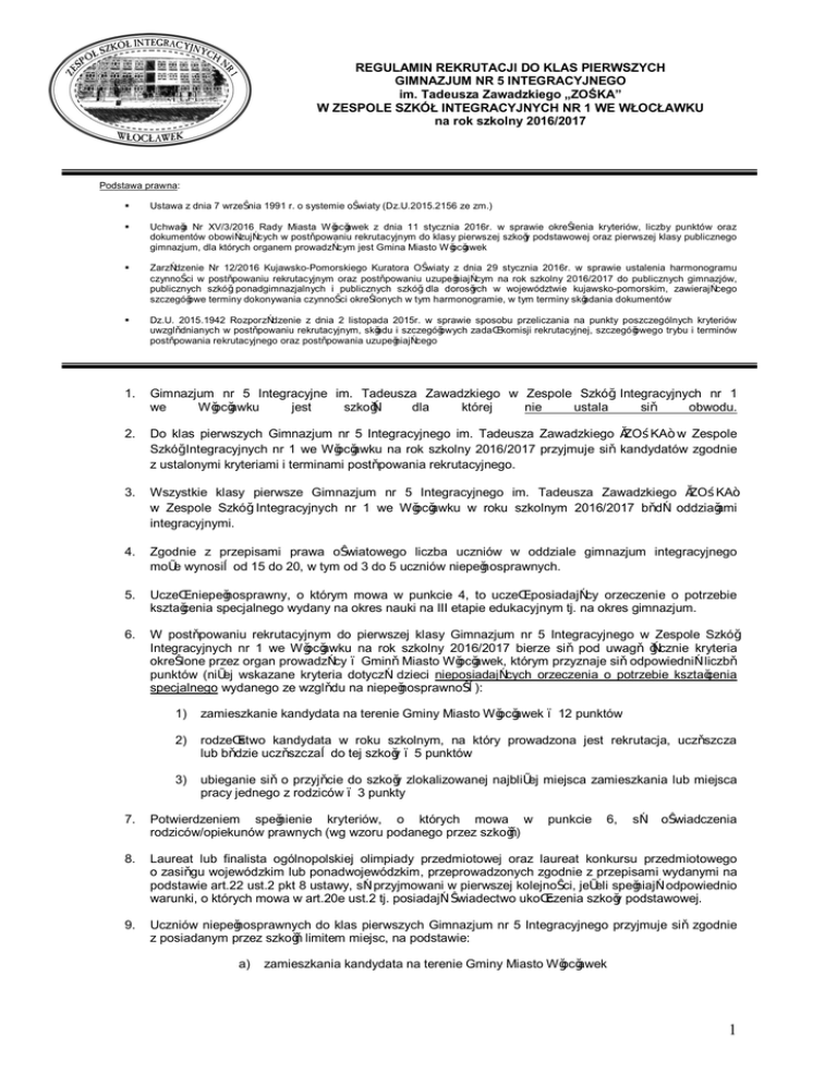 REGULAMIN REKRUTACJI DO KLAS PIERWSZYCH GIMNAZJUM NR 5 INTEGRACYJNEGO im. Tadeusza Zawadzkiego „ZOŚKA” W ZESPOLE SZKÓŁ INTEGRACYJNYCH NR 1 WE WŁOCŁAWKU na rok szkolny 2016/2017 Podstawa prawna: § Ustawa z dnia 7 września 1991 r. o systemie oświaty (Dz.U.2015.2156 ze zm.) § Uchwała Nr XV/3/2016 Rady Miasta Włocławek z dnia 11 stycznia 2016r. w sprawie określenia kryteriów, liczby punktów oraz dokumentów obowiązujących w postępowaniu rekrutacyjnym do klasy pierwszej szkoły podstawowej oraz pierwszej klasy publicznego gimnazjum, dla których organem prowadzącym jest Gmina Miasto Włocławek § Zarządzenie Nr 12/2016 Kujawsko-Pomorskiego Kuratora Oświaty z dnia 29 stycznia 2016r. w sprawie ustalenia harmonogramu czynności w postępowaniu rekrutacyjnym oraz postępowaniu uzupełniającym na rok szkolny 2016/2017 do publicznych gimnazjów, publicznych szkół ponadgimnazjalnych i publicznych szkół dla dorosłych w województwie kujawsko-pomorskim, zawierającego szczegółowe terminy dokonywania czynności określonych w tym harmonogramie, w tym terminy składania dokumentów § Dz.U. 2015.1942 Rozporządzenie z dnia 2 listopada 2015r. w sprawie sposobu przeliczania na punkty poszczególnych kryteriów uwzględnianych w postępowaniu rekrutacyjnym, składu i szczegółowych zadań komisji rekrutacyjnej, szczegółowego trybu i terminów postępowania rekrutacyjnego oraz postępowania uzupełniającego 1. Gimnazjum nr 5 Integracyjne im. Tadeusza Zawadzkiego w Zespole Szkół Integracyjnych nr 1 we Włocławku jest szkołą dla której nie ustala się obwodu. 2. Do klas pierwszych Gimnazjum nr 5 Integracyjnego im. Tadeusza Zawadzkiego „ZOŚKA” w Zespole Szkół Integracyjnych nr 1 we Włocławku na rok szkolny 2016/2017 przyjmuje się kandydatów zgodnie z ustalonymi kryteriami i terminami postępowania rekrutacyjnego. 3. Wszystkie klasy pierwsze Gimnazjum nr 5 Integracyjnego im. Tadeusza Zawadzkiego „ZOŚKA” w Zespole Szkół Integracyjnych nr 1 we Włocławku w roku szkolnym 2016/2017 będą oddziałami integracyjnymi. 4. Zgodnie z przepisami prawa oświatowego liczba uczniów w oddziale gimnazjum integracyjnego może wynosić od 15 do 20, w tym od 3 do 5 uczniów niepełnosprawnych. 5. Uczeń niepełnosprawny, o którym mowa w punkcie 4, to uczeń posiadający orzeczenie o potrzebie kształcenia specjalnego wydany na okres nauki na III etapie edukacyjnym tj. na okres gimnazjum. 6. W postępowaniu rekrutacyjnym do pierwszej klasy Gimnazjum nr 5 Integracyjnego w Zespole Szkół Integracyjnych nr 1 we Włocławku na rok szkolny 2016/2017 bierze się pod uwagę łącznie kryteria określone przez organ prowadzący – Gminę Miasto Włocławek, którym przyznaje się odpowiednią liczbę punktów (niżej wskazane kryteria dotyczą dzieci nieposiadających orzeczenia o potrzebie kształcenia specjalnego wydanego ze względu na niepełnosprawność): 1) zamieszkanie kandydata na terenie Gminy Miasto Włocławek – 12 punktów 2) rodzeństwo kandydata w roku szkolnym, na który prowadzona jest rekrutacja, uczęszcza lub będzie uczęszczać do tej szkoły – 5 punktów 3) ubieganie się o przyjęcie do szkoły zlokalizowanej najbliżej miejsca zamieszkania lub miejsca pracy jednego z rodziców – 3 punkty 7. Potwierdzeniem spełnienie kryteriów, o których mowa w rodziców/opiekunów prawnych (wg wzoru podanego przez szkołę) 8. Laureat lub finalista ogólnopolskiej olimpiady przedmiotowej oraz laureat konkursu przedmiotowego o zasięgu wojewódzkim lub ponadwojewódzkim, przeprowadzonych zgodnie z przepisami wydanymi na podstawie art.22 ust.2 pkt 8 ustawy, są przyjmowani w pierwszej kolejności, jeżeli spełniają odpowiednio warunki, o których mowa w art.20e ust.2 tj. posiadają świadectwo ukończenia szkoły podstawowej. 9. Uczniów niepełnosprawnych do klas pierwszych Gimnazjum nr 5 Integracyjnego przyjmuje się zgodnie z posiadanym przez szkołę limitem miejsc, na podstawie: a) punkcie 6, są oświadczenia zamieszkania kandydata na terenie Gminy Miasto Włocławek 1 b) orzeczenia o potrzebie kształcenia specjalnego wydanego przez poradnię psychologiczno-pedagogiczną na okres nauki na III etapie edukacyjnym tj. na okres gimnazjum c) skierowania do nauki w Gimnazjum nr 5 Integracyjnym w Zespole Szkół Integracyjnych nr 1 we Włocławku wydanym przez organ prowadzący – Gminę Miasto Włocławek 10. Jeżeli liczba kandydatów jest większa od liczby wolnych miejsc, komisja rekrutacyjna ustala minimalną wymaganą liczbę punktów kwalifikującą do przyjęcia kandydata do Gimnazjum nr 5 Integracyjnego. W przypadku osiągnięcia równorzędnych wyników wynikających z łącznej punktacji kryteriów określonych w Uchwale Rady Miasta Włocławek bierze się pod uwagę łączną liczbę punktów wskazaną poniżej: 1) W pierwszej kolejności do Gimnazjum nr 5 Integracyjnego w Zespole Szkół Integracyjnych nr 1 we Włocławku, przyjmowani są kandydaci, którzy w wyniku końcowej klasyfikacji w klasie szóstej szkoły podstawowej uzyskali łącznie z wynikami zewnętrznego sprawdzianu przeprowadzonego w klasie szóstej najwyższą liczbę punktów. 2) Punktowany będzie wynik sprawdzianu, średnia ocen na świadectwie ukończenia szkoły podstawowej oraz ocena z zachowania – łącznie 45 punktów. a) wynik sprawdzianu – maksymalnie 40 punktów Punkty możliwe do przyznania przez Komisję Rekrutacyjną Wynik sprawdzianu po SP max 20 pkt* z części I (język polski, matematyka) Wynik sprawdzianu po SP max 20 pkt* z części II (język obcy nowożytny) b) średnia ocen na świadectwie ukończenia szkoły podstawowej – maksymalnie 3 punkty Punkty możliwe do przyznania przez Komisję Rekrutacyjną 4,75 i więcej 3 punkty 4,74 – 4,2 2 punkty 4,19 – 3,7 1 punkt poniżej 3,7 0 punktów c) ocena z zachowania – maksymalnie 2 punkty wzorowa 2 punkty bardzo dobra, dobra 1 punkt poprawna, nieodpowiednie 0 punktów *Wynik z części pierwszej or