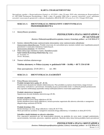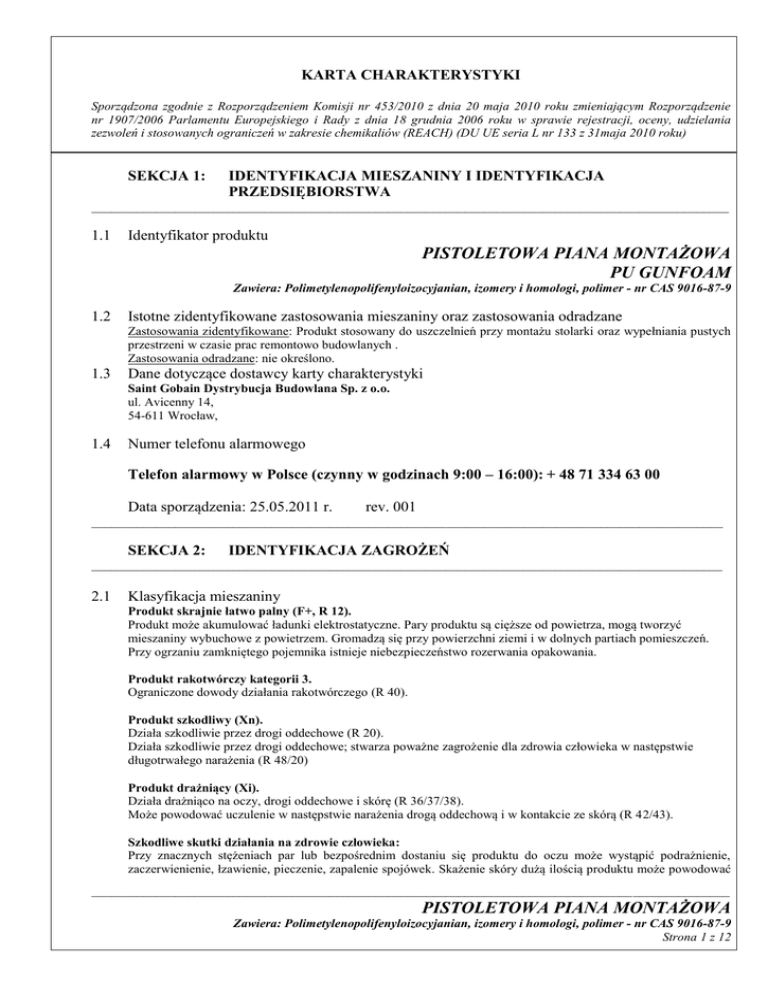 KARTA CHARAKTERYSTYKI Sporządzona zgodnie z Rozporządzeniem Komisji nr 453/2010 z dnia 20 maja 2010 roku zmieniającym Rozporządzenie nr 1907/2006 Parlamentu Europejskiego i Rady z dnia 18 grudnia 2006 roku w sprawie rejestracji, oceny, udzielania zezwoleń i stosowanych ograniczeń w zakresie chemikaliów (REACH) (DU UE seria L nr 133 z 31maja 2010 roku) SEKCJA 1: IDENTYFIKACJA MIESZANINY I IDENTYFIKACJA PRZEDSIĘBIORSTWA ___________________________________________________________________________________________________ 1.1 Identyfikator produktu PISTOLETOWA PIANA MONTAŻOWA PU GUNFOAM Zawiera: Polimetylenopolifenyloizocyjanian, izomery i homologi, polimer - nr CAS 9016-87-9 1.2 Istotne zidentyfikowane zastosowania mieszaniny oraz zastosowania odradzane Zastosowania zidentyfikowane: Produkt stosowany do uszczelnień przy montażu stolarki oraz wypełniania pustych przestrzeni w czasie prac remontowo budowlanych . Zastosowania odradzane: nie określono. 1.3 Dane dotyczące dostawcy karty charakterystyki Saint Gobain Dystrybucja Budowlana Sp. z o.o. ul. Avicenny 14, 54-611 Wrocław, 1.4 Numer telefonu alarmowego Telefon alarmowy w Polsce (czynny w godzinach 9:00 – 16:00): + 48 71 334 63 00 Data sporządzenia: 25.05.2011 r. rev. 001 __________________________________________________________________________________________________ SEKCJA 2: IDENTYFIKACJA ZAGROŻEŃ __________________________________________________________________________________________________ 2.1 Klasyfikacja mieszaniny Produkt skrajnie łatwo palny (F+, R 12). Produkt może akumulować ładunki elektrostatyczne. Pary produktu są cięższe od powietrza, mogą tworzyć mieszaniny wybuchowe z powietrzem. Gromadzą się przy powierzchni ziemi i w dolnych partiach pomieszczeń. Przy ogrzaniu zamkniętego pojemnika istnieje niebezpieczeństwo rozerwania opakowania. Produkt rakotwórczy kategorii 3. Ograniczone dowody działania rakotwórczego (R 40). Produkt szkodliwy (Xn). Działa szkodliwie przez drogi oddechowe (R 20). Działa szkodliwie przez drogi oddechowe; stwarza poważne zagrożenie dla zdrowia człowieka w następstwie długotrwałego narażenia (R 48/20) Produkt drażniący (Xi). Działa drażniąco na oczy, drogi oddechowe i skórę (R 36/37/38). Może powodować uczulenie w następstwie narażenia drogą oddechową i w kontakcie ze skórą (R 42/43). Szkodliwe skutki działania na zdrowie człowieka: Przy znacznych stężeniach par lub bezpośrednim dostaniu się produktu do oczu może wystąpić podrażnienie, zaczerwienienie, łzawienie, pieczenie, zapalenie spojówek. Skażenie skóry dużą ilością produktu może powodować ___________________________________________________________________________________________________ PISTOLETOWA PIANA MONTAŻOWA Zawiera: Polimetylenopolifenyloizocyjanian, izomery i homologi, polimer - nr CAS 9016-87-9 Strona 1 z 12 KARTA CHARAKTERYSTYKI Sporządzona zgodnie z Rozporządzeniem Komisji nr 453/2010 z dnia 20 maja 2010 roku zmieniającym Rozporządzenie nr 1907/2006 Parlamentu Europejskiego i Rady z dnia 18 grudnia 2006 roku w sprawie rejestracji, oceny, udzielania zezwoleń i stosowanych ograniczeń w zakresie chemikaliów (REACH) (DU UE seria L nr 133 z 31maja 2010 roku) zaczerwienienie, swędzenie i wysuszanie skóry. U osób uczulonych może wystąpić silna reakcja alergiczna nawet na bardzo małe ilości produktu. Wdychanie par o dużym stężeniu może spowodować uczucie zmęczenia, osłabienie, senność, nudności, bóle i zawroty głowy, ból gardła. Powtarzający się kontakt z parami produktu może powodować reakcje uczuleniowe dróg oddechowych (obrzęk, chrypka, uczucie duszenia się, kaszel). Po spożyciu może dojść do uszkodzenia śluzówki przewodu pokarmowego, nudności, wymiotów i biegunki. Skutki działania na środowisko: Nie stwarza zagrożenia dla środowiska wodnego (patrz sekcja 12). Skutki działania związane z właściwościami fizykochemicznymi: Pary produktu są cięższe od powietrza, mogą tworzyć mieszaniny wybuchowe z powietrzem. Gromadzą się przy powierzchni ziemi i w dolnych partiach pomieszczeń. Zbiorniki narażone na działanie ognia lub wysokiej temperatury mogą eksplodować. 2.2 Elementy oznakowania ZNAK F+ Xn skrajnie łatwo palny szkodliwy Zwroty wskazujące rodzaj zagrożenia: R 40 R 20 R 42/43 R 48/20 R 36/37/38 Zwroty określające warunki bezpiecznego stosowania: S 23 S 36/37 S 45 S 51 S 63 Ograniczone dowody działania rakotwórczego; Działa szkodliwie przez drogi oddechowe. Może powodować uczulenie w następstwie narażenia drogą oddechową i w kontakcie ze skórą; Działa szkodliwie przez drogi oddechowe; stwarza poważne zagrożenie dla zdrowia człowieka w następstwie długotrwałego narażenia Działa drażniąco na oczy, drogi oddechowe i skórę. Nie wdychać pary/rozpylonej cieczy. Nosić odpowiednią odzież ochronną i odpowiednie rękawice ochronne. W przypadku awarii lub jeżeli źle się poczujesz, niezwłocznie zasięgnij porady lekarza – jeżeli to możliwe, pokaż etykietę; Stosować wyłącznie w dobrze wentylowanych pomieszczeniach; W przypadku zatrucia drogą oddechową wyprowadzić lub wynieść poszkodowanego na świeże powietrze i zapewnić warunki do odpoczynku. Zawiera: Polimetylenopolifenyloizocyjanian, izomery i homologi Zawiera izocyjaniany. Zapoznaj się z instrukcją dostarczoną przez producenta. UWAGA!!! Na pojemniku należy umieścić napisy: ___________________________________________________________________________________________________ PISTOLETOWA PIANA MONTAŻOWA Zawiera: Polimetylenopolifenyloizocyjanian, izomery i homologi, polimer - nr CAS 9016-87-9 Strona 2 z 12 KARTA CHARAKTERYSTYKI Sporządzona zgodnie z Rozporządzeniem Komisji nr 453/2010 z dnia 20 maja 2010 roku zmieniającym Rozporządzenie nr 1907/2006 Parlamentu Europejskiego i Rady z dnia 18 grudnia 2006 roku w sprawie rejestracji, oceny, udzielania zezwoleń i stosowanych ograniczeń w zakresie che
