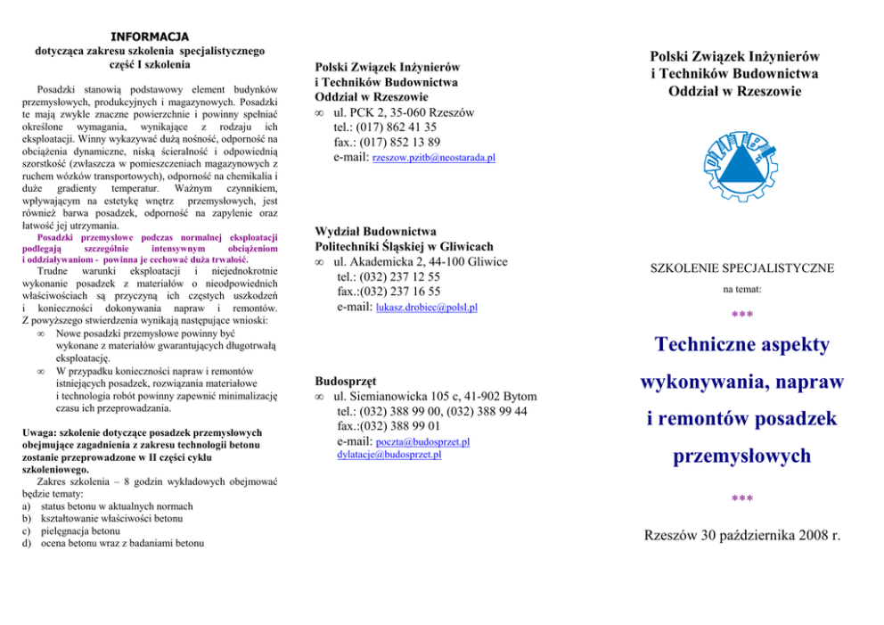 INFORMACJA dotycząca zakresu szkolenia specjalistycznego część I szkolenia Posadzki stanowią podstawowy element budynków przemysłowych, produkcyjnych i magazynowych. Posadzki te mają zwykle znaczne powierzchnie i powinny spełniać określone wymagania, wynikające z rodzaju ich eksploatacji. Winny wykazywać dużą nośność, odporność na obciążenia dynamiczne, niską ścieralność i odpowiednią szorstkość (zwłaszcza w pomieszczeniach magazynowych z ruchem wózków transportowych), odporność na chemikalia i duże gradienty temperatur. Ważnym czynnikiem, wpływającym na estetykę wnętrz przemysłowych, jest również barwa posadzek, odporność na zapylenie oraz łatwość jej utrzymania. Posadzki przemysłowe podczas normalnej eksploatacji podlegają szczególnie intensywnym obciążeniom i oddziaływaniom - powinna je cechować duża trwałość. Trudne warunki eksploatacji i niejednokrotnie wykonanie posadzek z materiałów o nieodpowiednich właściwościach są przyczyną ich częstych uszkodzeń i konieczności dokonywania napraw i remontów. Z powyższego stwierdzenia wynikają następujące wnioski: • Nowe posadzki przemysłowe powinny być wykonane z materiałów gwarantujących długotrwałą eksploatację. • W przypadku konieczności napraw i remontów istniejących posadzek, rozwiązania materiałowe i technologia robót powinny zapewnić minimalizację czasu ich przeprowadzania. Uwaga: szkolenie dotyczące posadzek przemysłowych obejmujące zagadnienia z zakresu technologii betonu zostanie przeprowadzone w II części cyklu szkoleniowego. Zakres szkolenia – 8 godzin wykładowych obejmować będzie tematy: a) status betonu w aktualnych normach b) kształtowanie właściwości betonu c) pielęgnacja betonu d) ocena betonu wraz z badaniami betonu Polski Związek Inżynierów i Techników Budownictwa Oddział w Rzeszowie • ul. PCK 2, 35-060 Rzeszów tel.: (017) 862 41 35 fax.: (017) 852 13 89 e-mail: [email protected] Wydział Budownictwa Politechniki Śląskiej w Gliwicach • ul. Akademicka 2, 44-100 Gliwice tel.: (032) 237 12 55 fax.:(032) 237 16 55 e-mail: [email protected] Polski Związek Inżynierów i Techników Budownictwa Oddział w Rzeszowie SZKOLENIE SPECJALISTYCZNE na temat: *** Techniczne aspekty Budosprzęt • ul. Siemianowicka 105 c, 41-902 Bytom tel.: (032) 388 99 00, (032) 388 99 44 fax.:(032) 388 99 01 e-mail: [email protected] [email protected] wykonywania, napraw i remontów posadzek przemysłowych *** Rzeszów 30 października 2008 r.